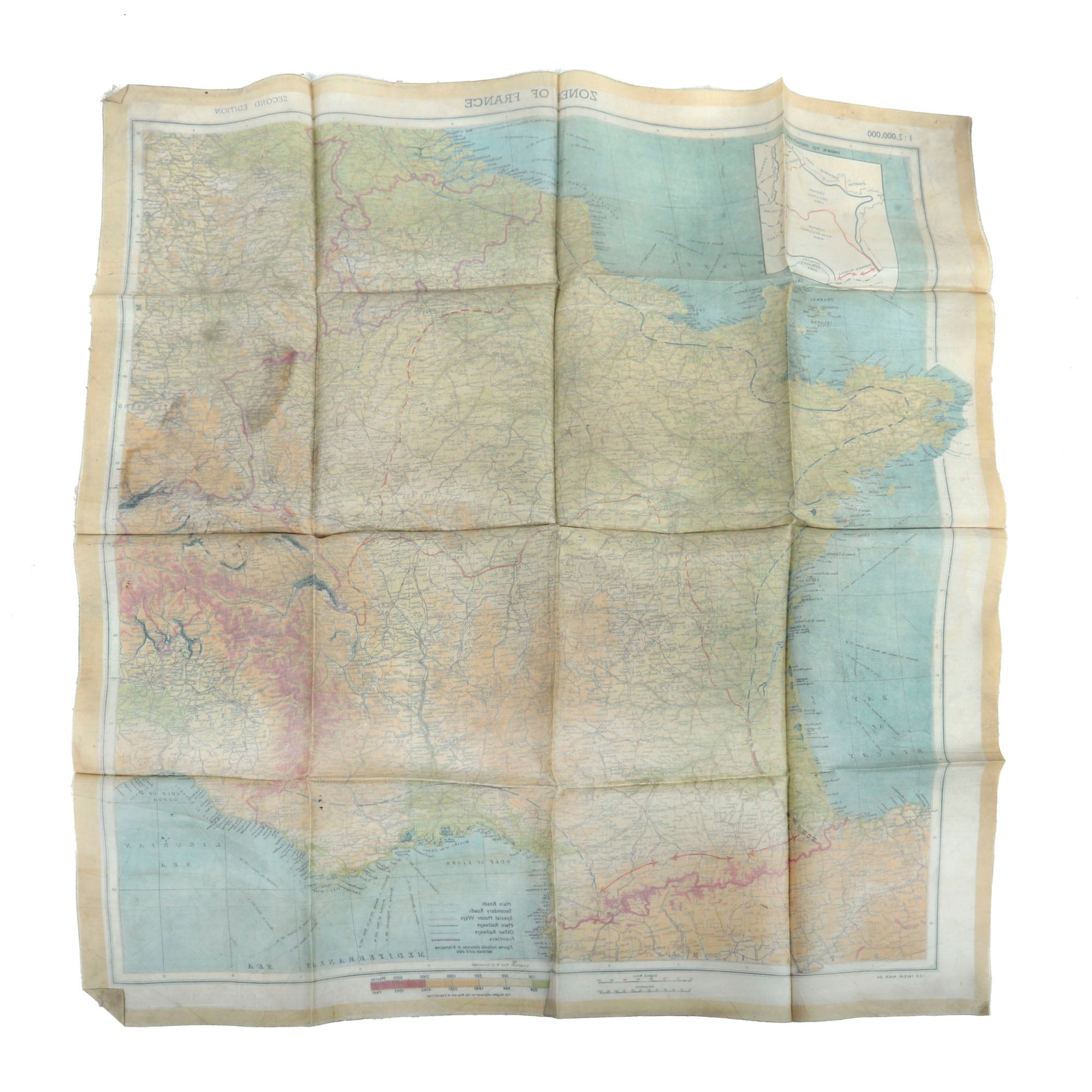 Original Item: Only One Available. This is a rare March 1944 dated "Zones of France", Scale 1:2.000.000, silk map. On D-Day, this map was mainly worn by US airborne troops around their neck.