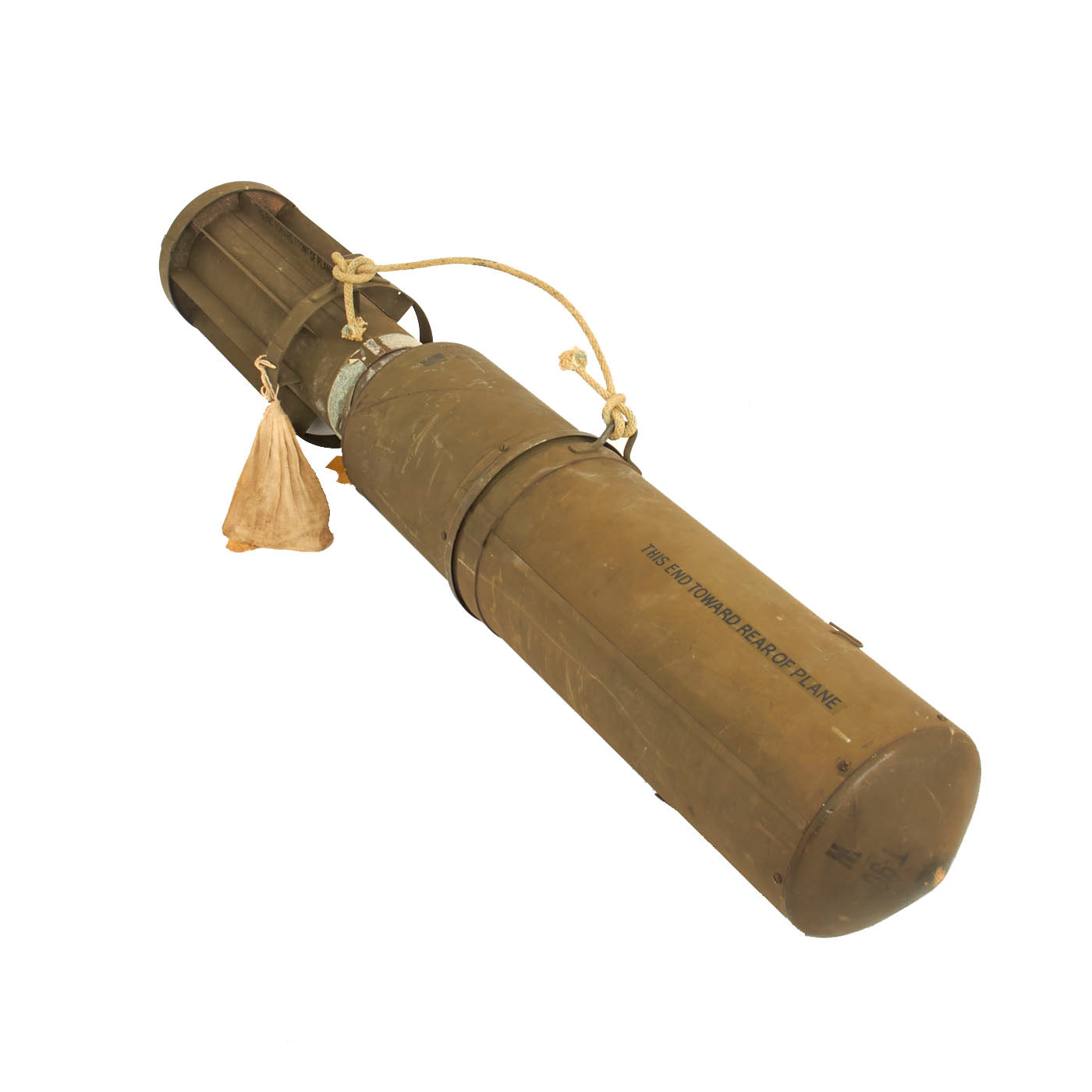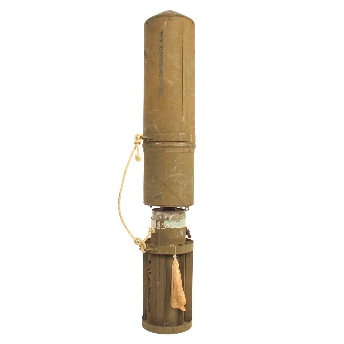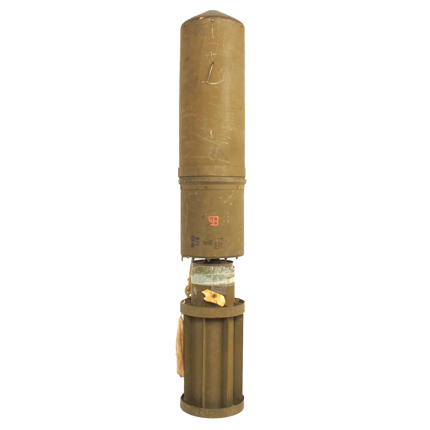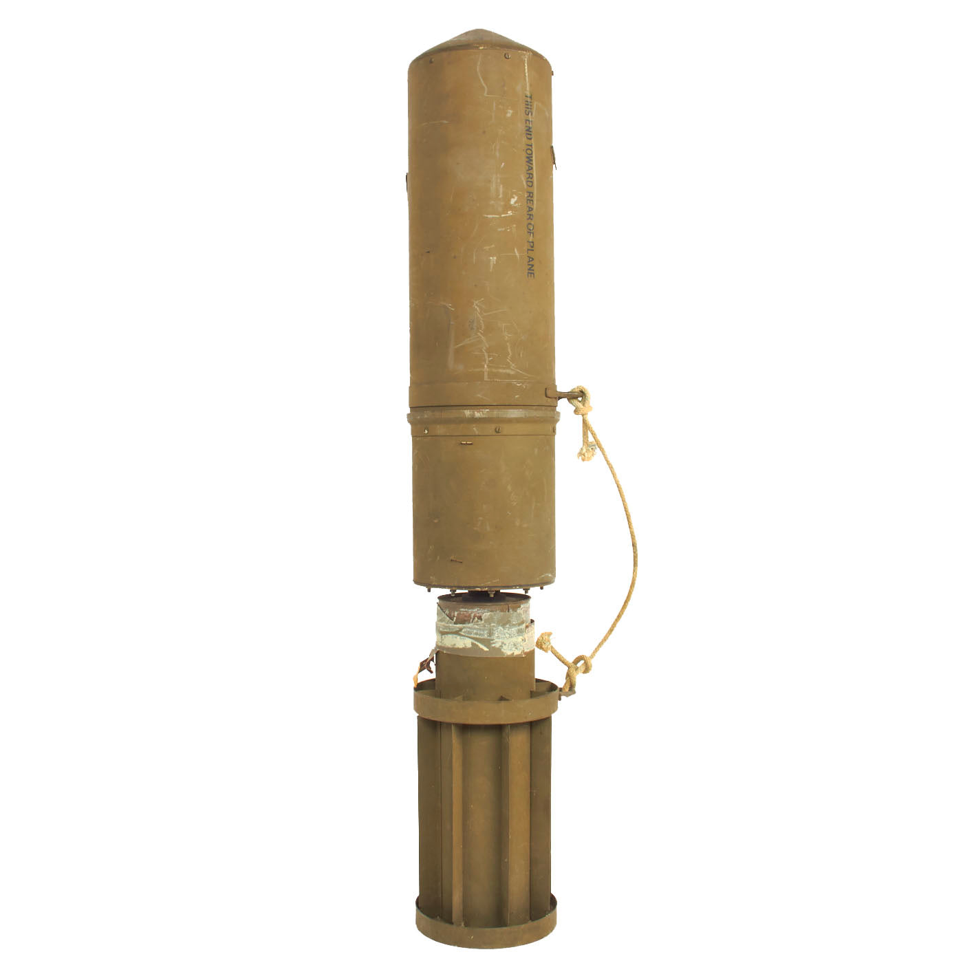 World War Two United States designed radar jamming bomb unit. Arms during descent and will jam any radar for several miles. Mounted in standard bomb racks loaded pointing backwards to the rear of aircraft so they cannot interfere with aircraft avionics during flight. Measures approximately 44 inches long with an 8 inch diameter with parachute stuffed inside bottom tube along with lead line still attached. Naturally, the jamming electronics have been removed. Spare tube piece and parachute also supplied for display. Body marked T-96 M.F.P. FEB. -45.