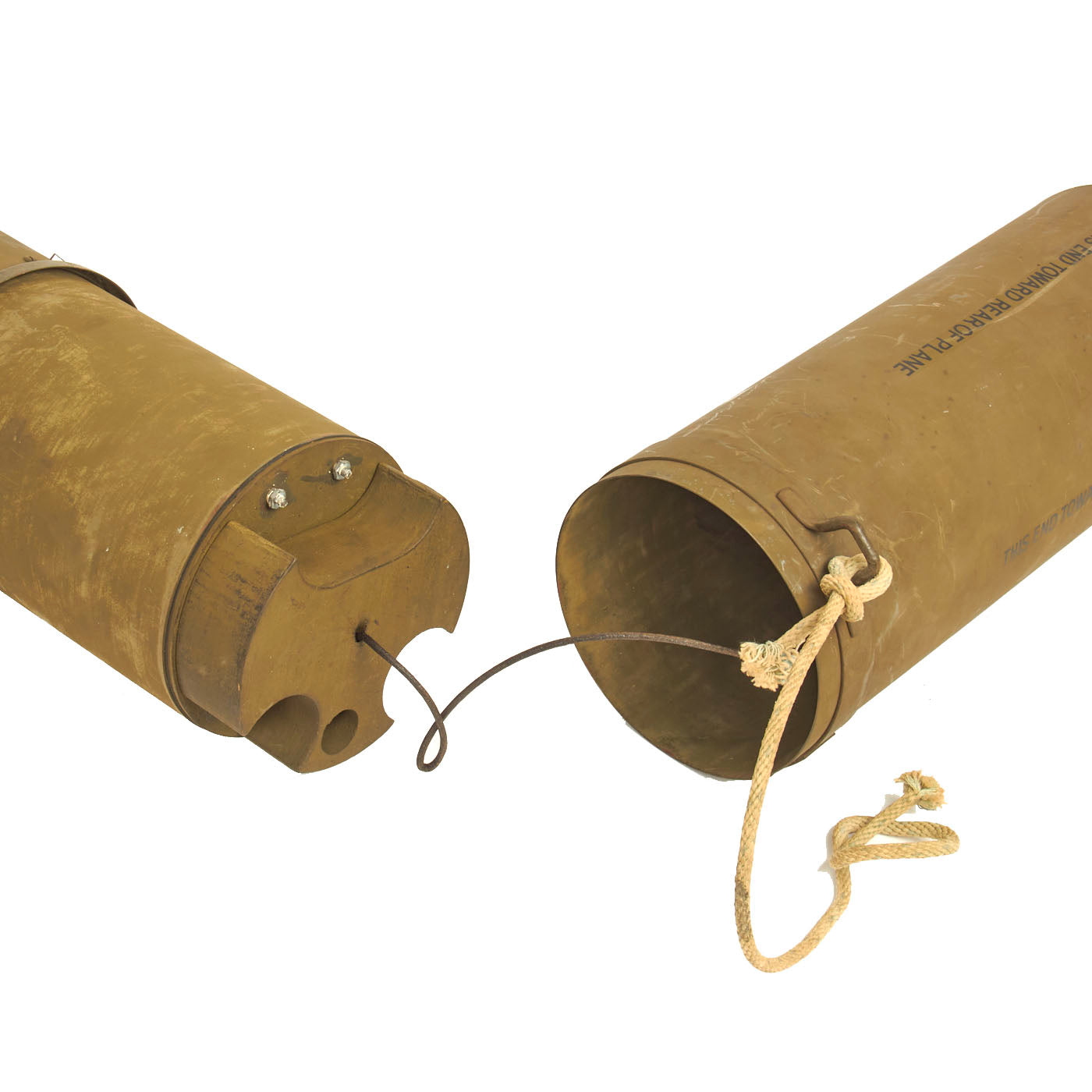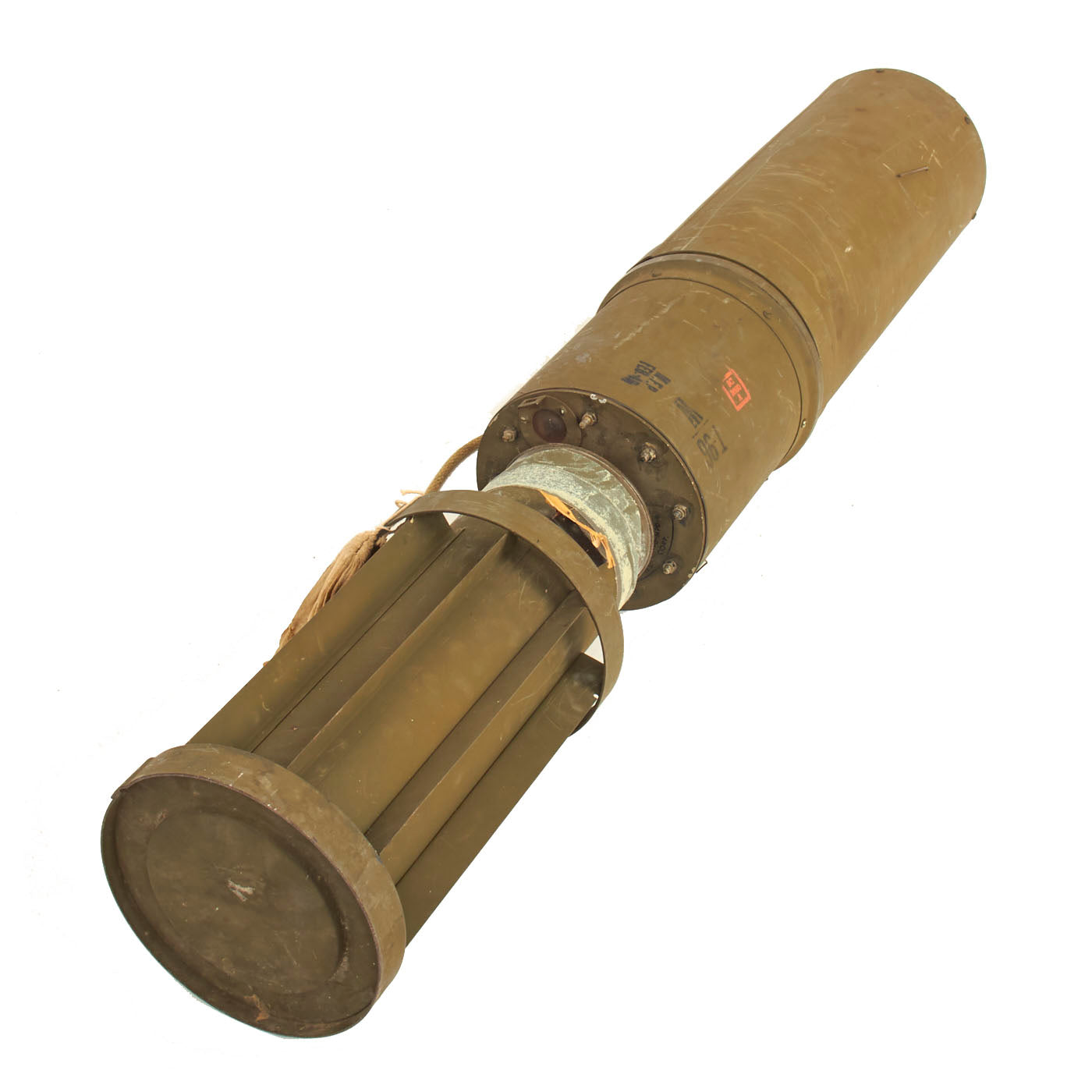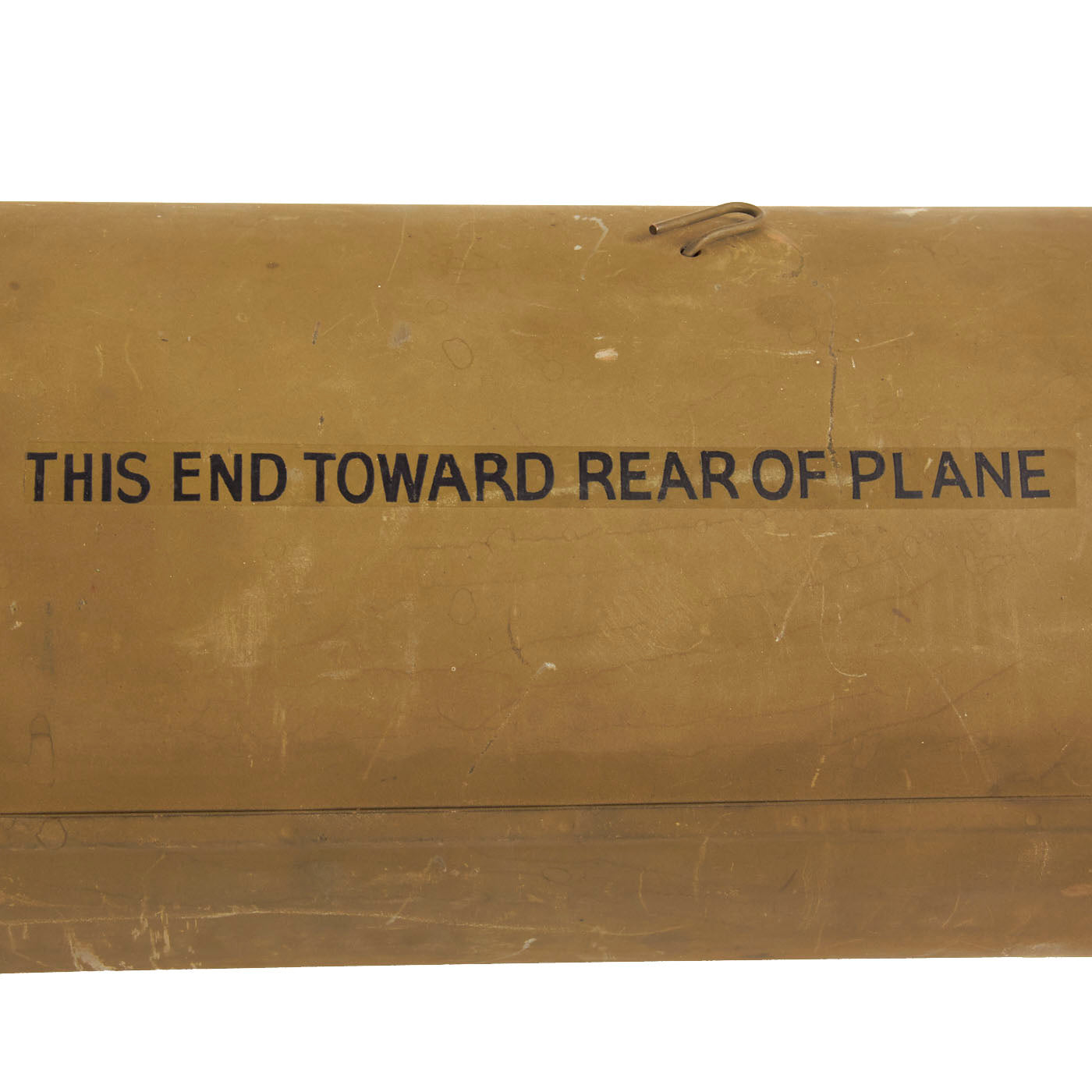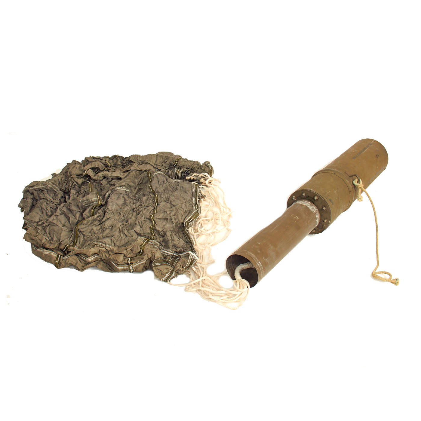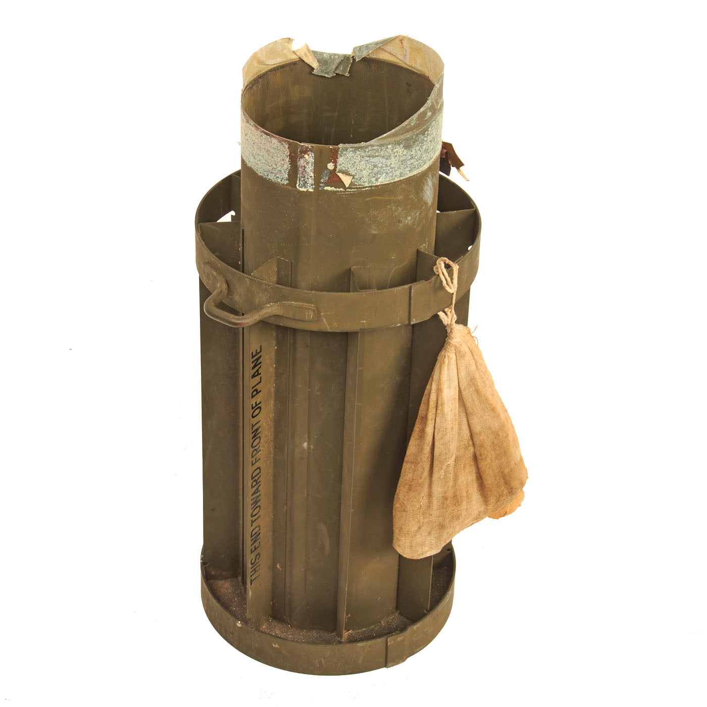 World War Two United States designed radar jamming bomb unit. Arms during descent and will jam any radar for several miles. Mounted in standard bomb racks loaded pointing backwards to the rear of aircraft so they cannot interfere with aircraft avionics during flight. Measures approximately 44 inches long with an 8 inch diameter with parachute stuffed inside bottom tube along with lead line still attached. Naturally, the jamming electronics have been removed. Spare tube piece and parachute also supplied for display. Body marked T-96 M.F.P. FEB. -45.