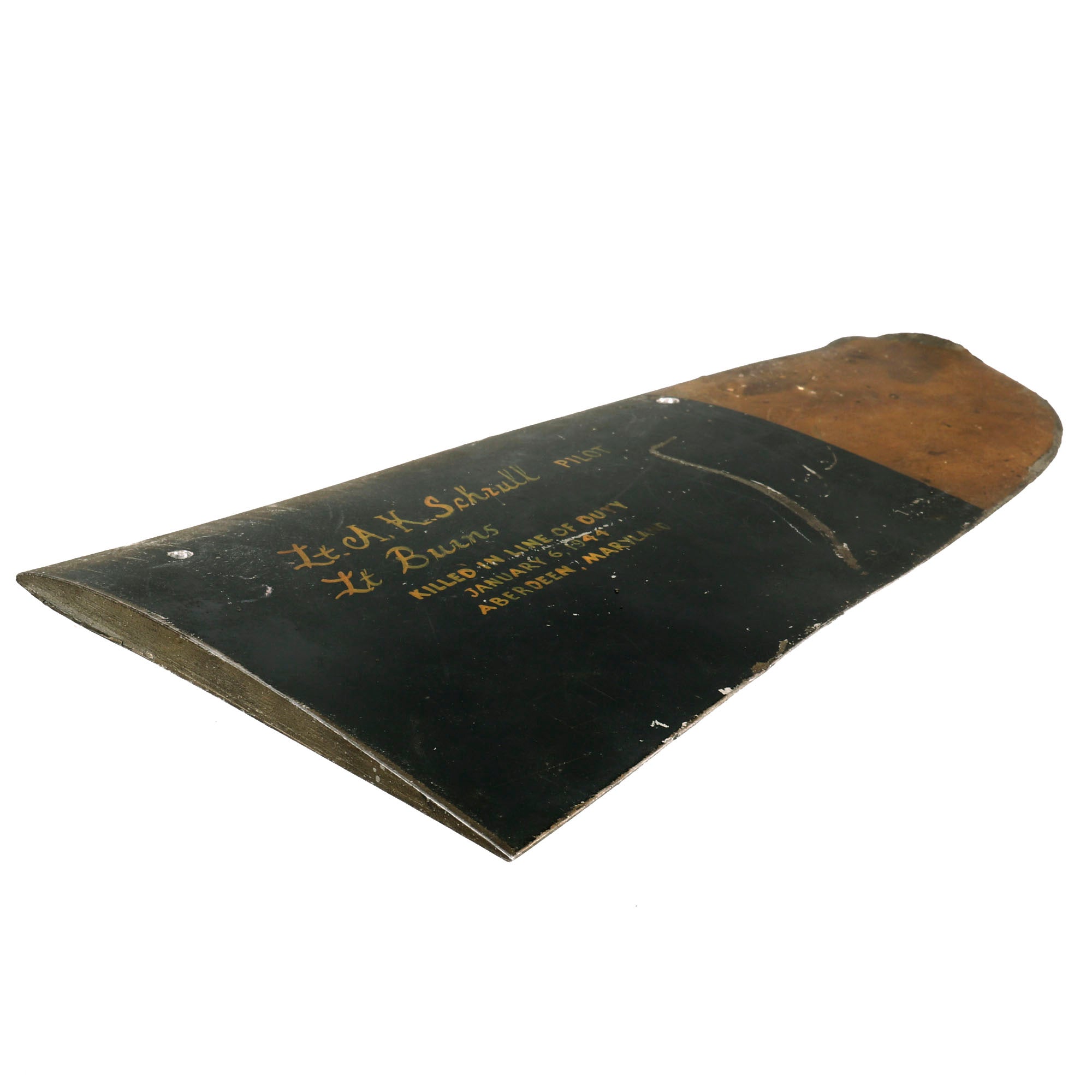 Original Item. One-of-a-Kind. This is a tremendous piece of aviation history, the tip of an airplane Propeller named to commemorate the deaths of Pilots Lt. Albert K. Schrull & John E. Byrnes, who were killed in an airplane crash at the Aberdeen Proving Ground in Aberdeen, Maryland on January 6th, 1944.