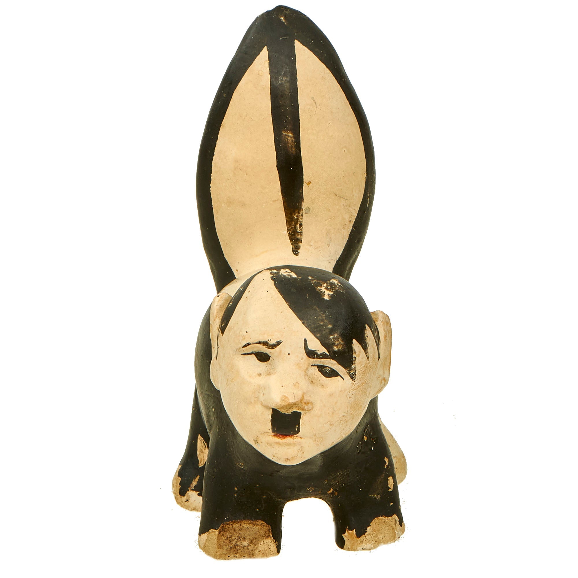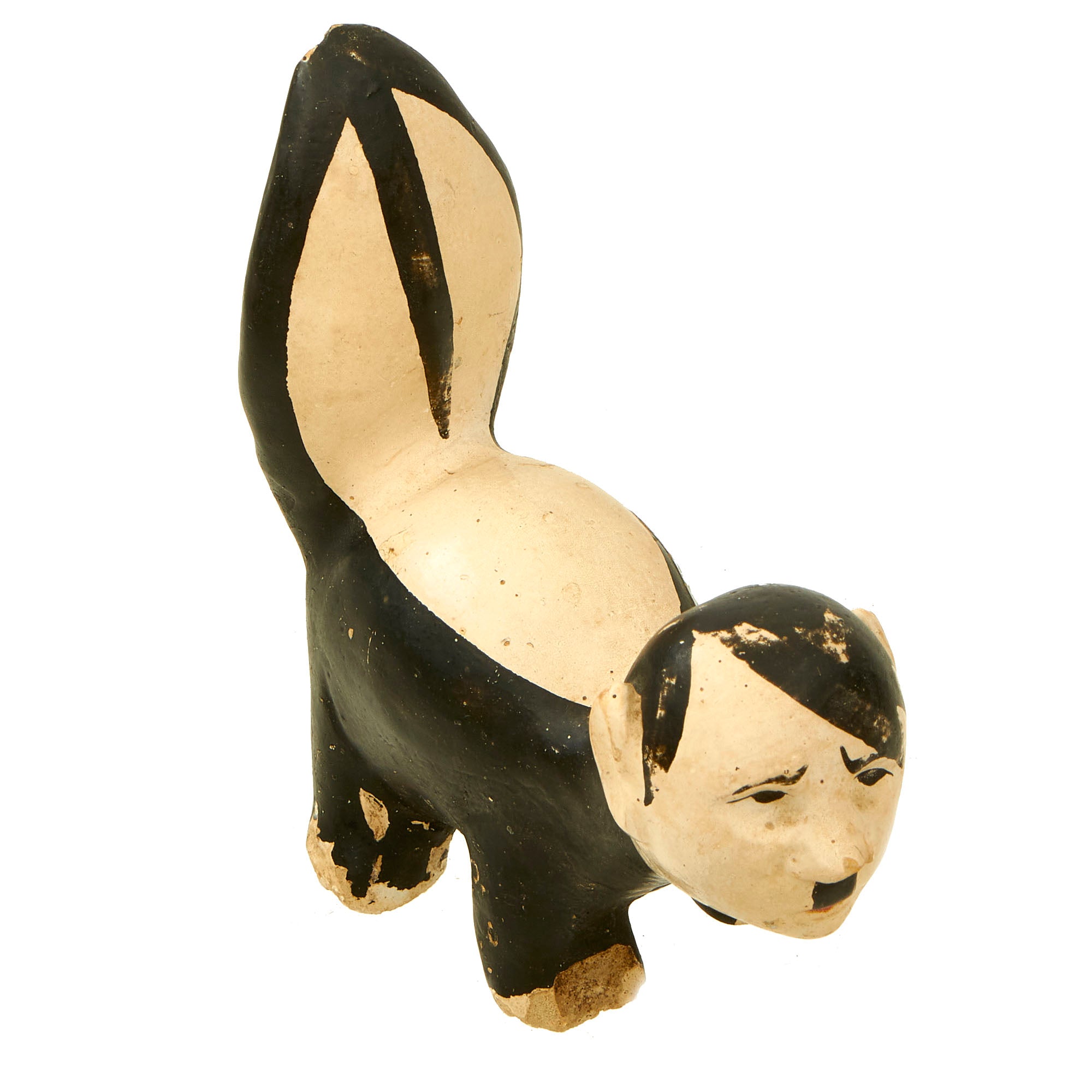 Original Item: Only one available. Here we have a great piece of World War II American Home front Anti-German propaganda. These skunk caricatures of Adolf H were actually referred to as “Der Phew-Ur”, and were sold nationwide in numerous stores. The left side of this example has a faded silver label that reads: