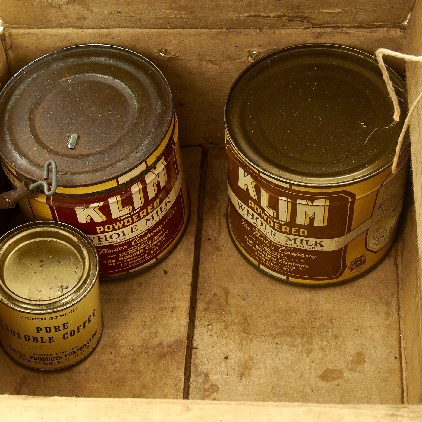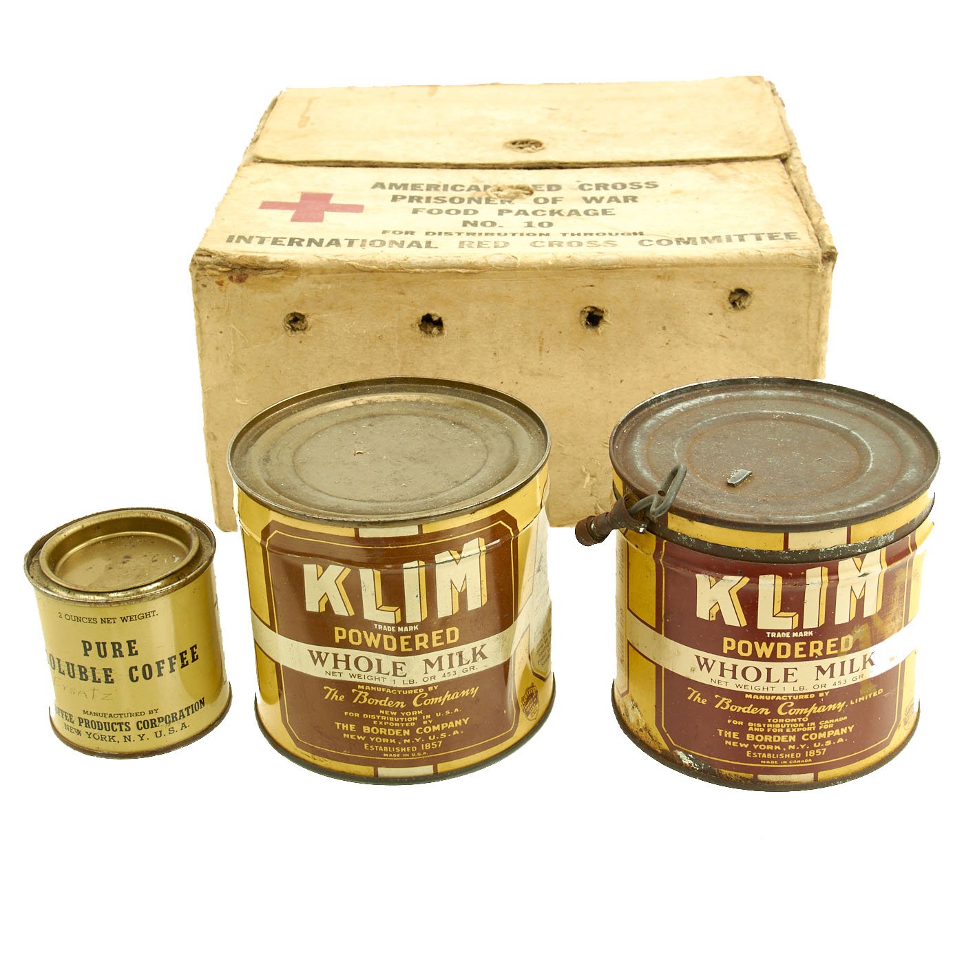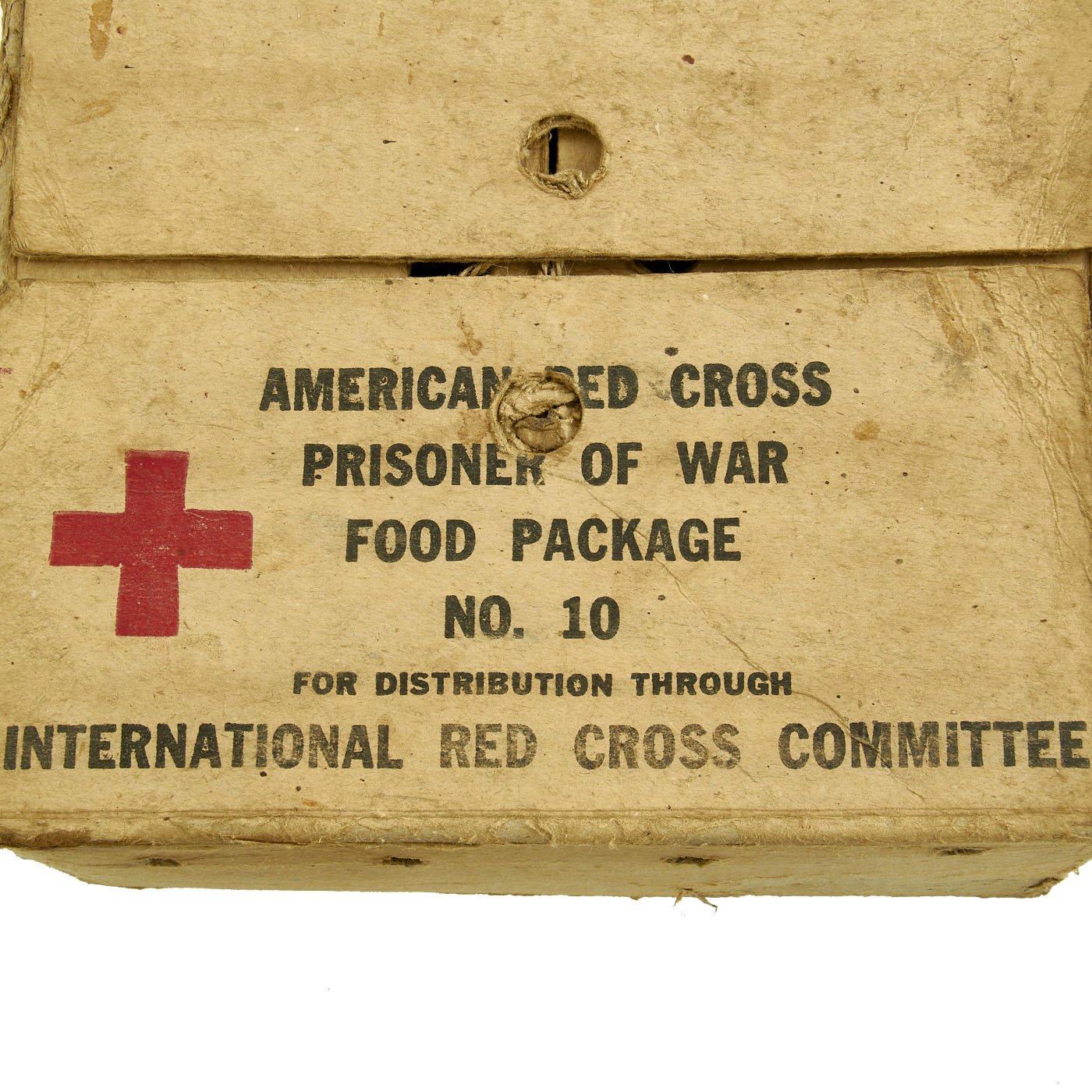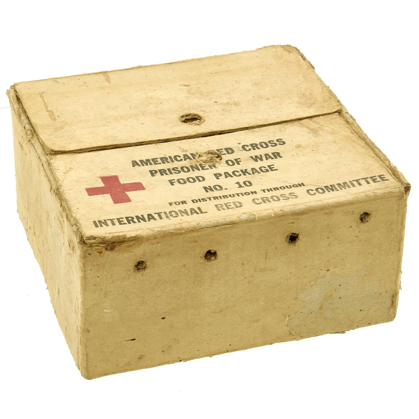 Original Item: Only One Available. Filled by Red Cross volunteers in the United States, in cooperation with the army's Quartermaster Corps, these boxes were then shipped to the International Committee of the Red Cross warehouse in Geneva Switzerland. From Switzerland, the boxes were shipped to the nearly 1.4 million Allied prisoners of war held in Germany. The boxes usually contained the following: army spread, canned bacon, luncheon meat, salmon, dehydrated corned beef, canned-cheese product, soluble coffee, powdered milk, and chocolate D bars. Non-food items included: toilet paper, soap, paper towels, can opener, needles, thread, patching cloth, vitamin capsules, salt, and tobacco.