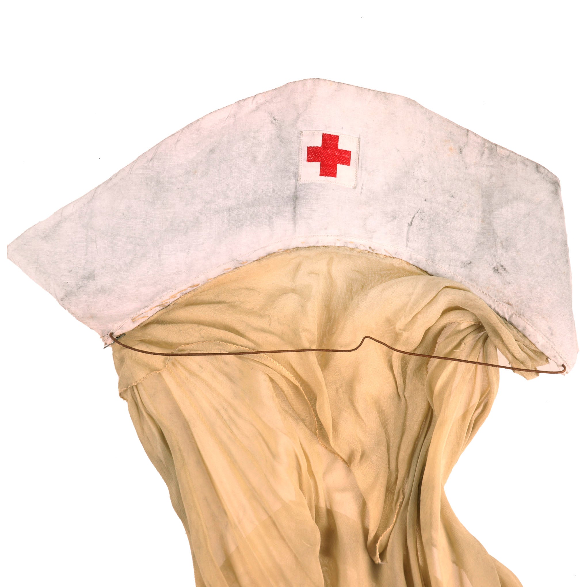 The uniform features long sleeves and a red cross insignia sewn onto the left breast pocket. The veil is long with its elastic string still attached. The uniform retains all of its mother of pearl buttons and is in great shape overall.