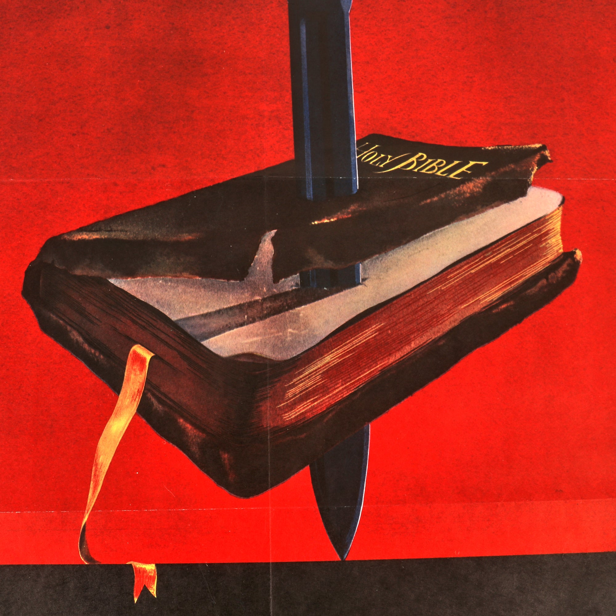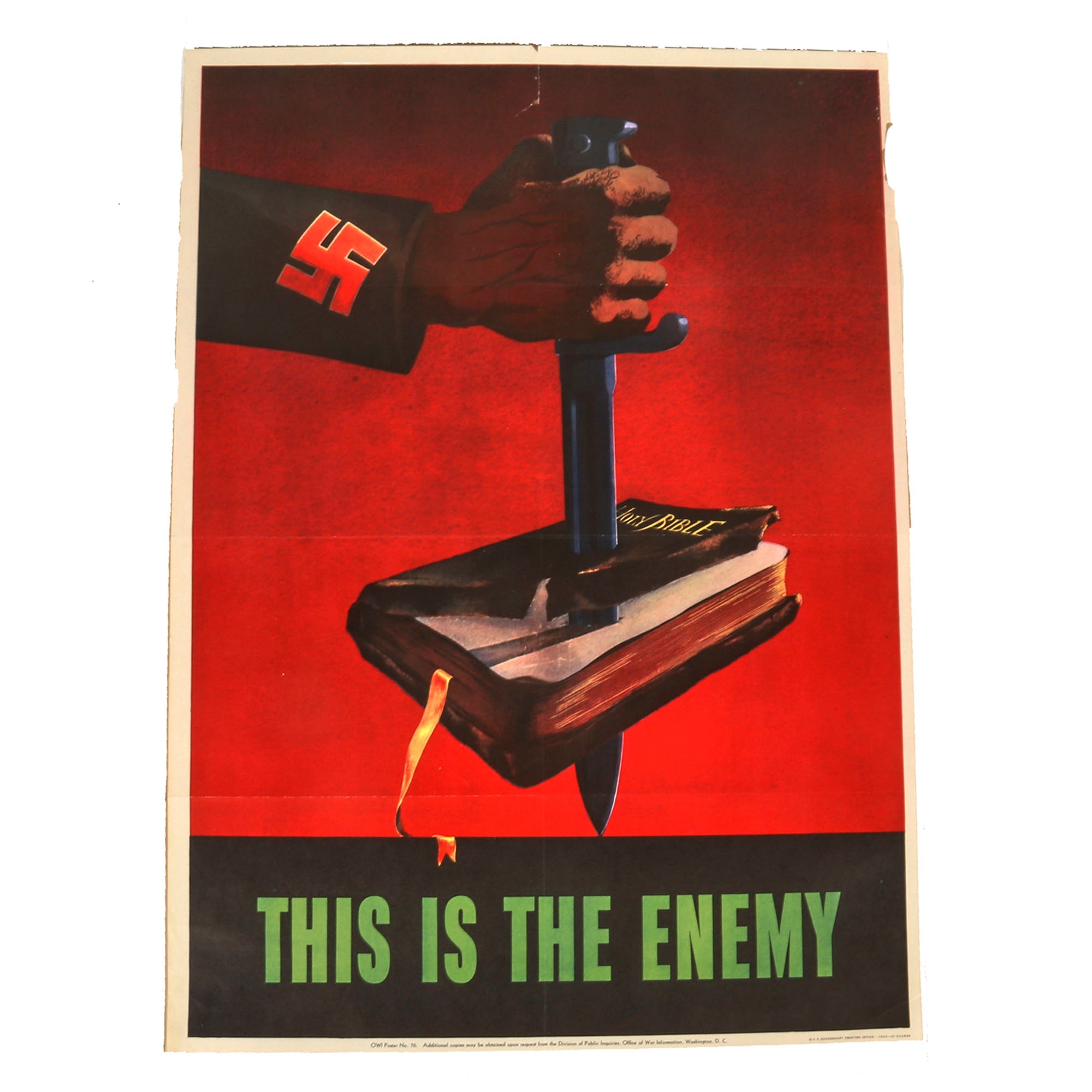 This is a lovely 28½" x 40" World War II Propaganda poster with a gripping image of a swas (hook cross) clad arm, striking down the Holy Bible with a 98k bayonet. At the bottom in green is the text THIS IS THE ENEMY. Almost everyone considers this one of the greatest of World War II propaganda posters. Barbara Marks is sometimes credited as the artist and we know that she did create other World War II posters.