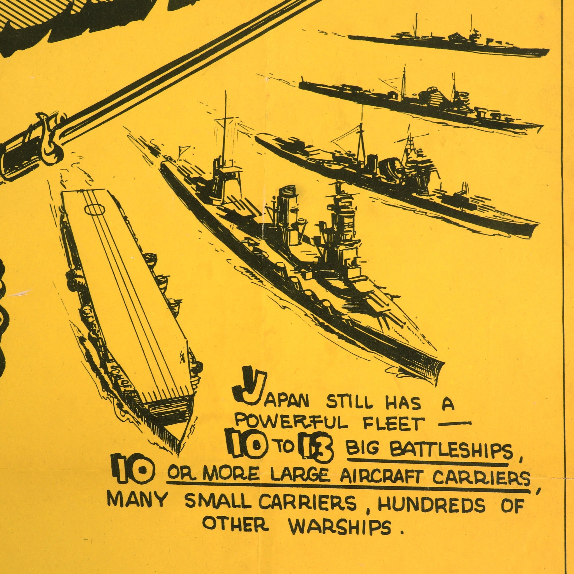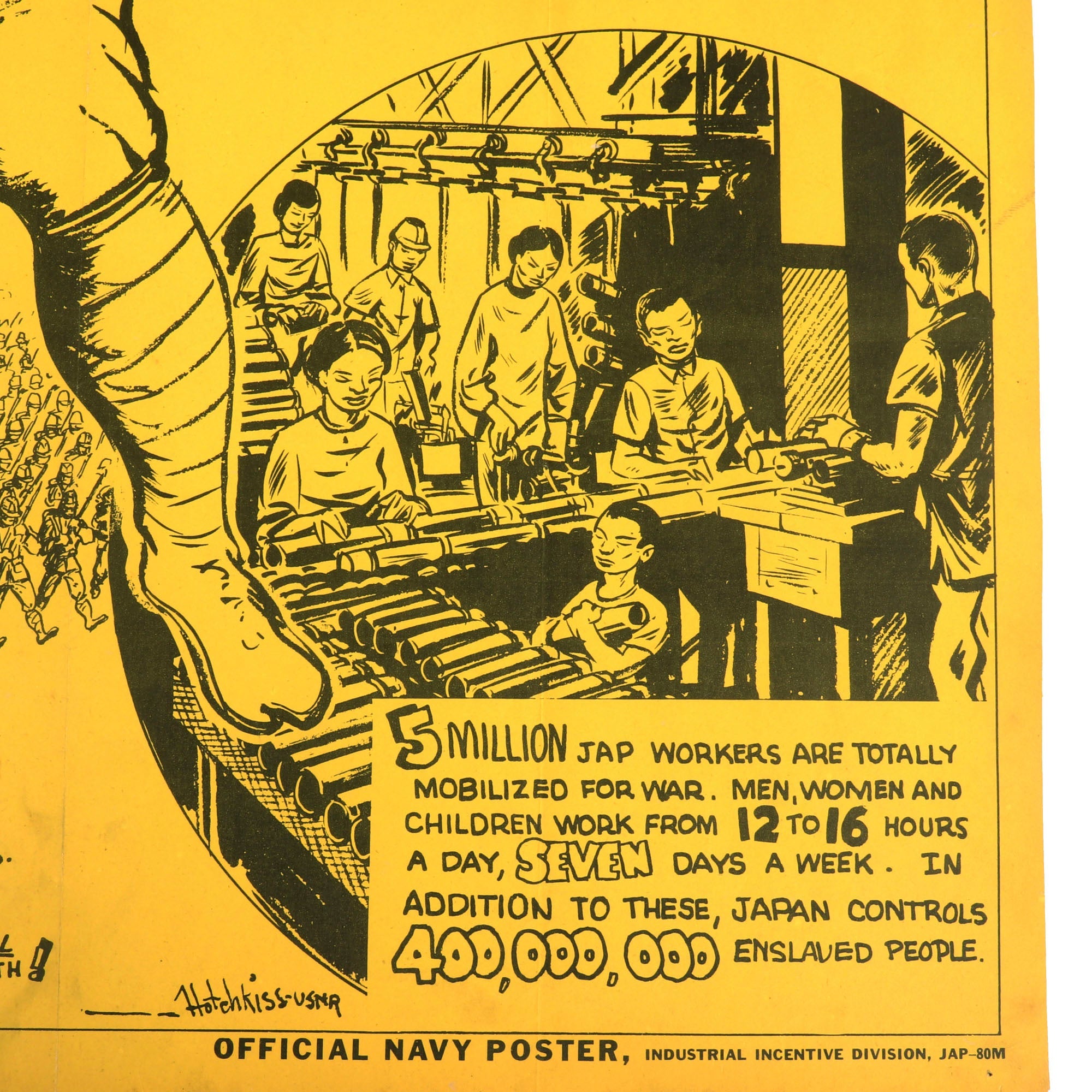 The poster is in great shape with few flaws. The folds and creases are still visible but add to the character of the poster. There are tears on the top and on the sides as shown. The bottom reads U.S. GOVERNMENT PRINTING OFFICE: 1944 O-615176 OFFICIAL NAVY POSTER, INDUSTRIAL INCENTIVE DIVISION, JAP-80M. This is a fantastic poster that will fit well in any U.S. WWII or propaganda poster collection.