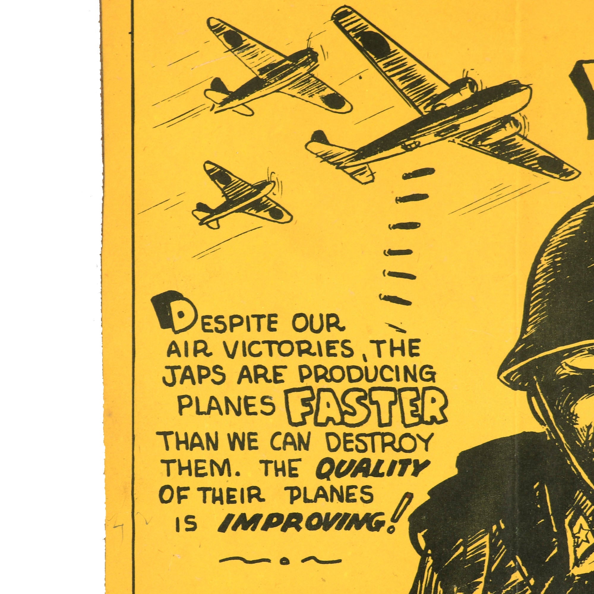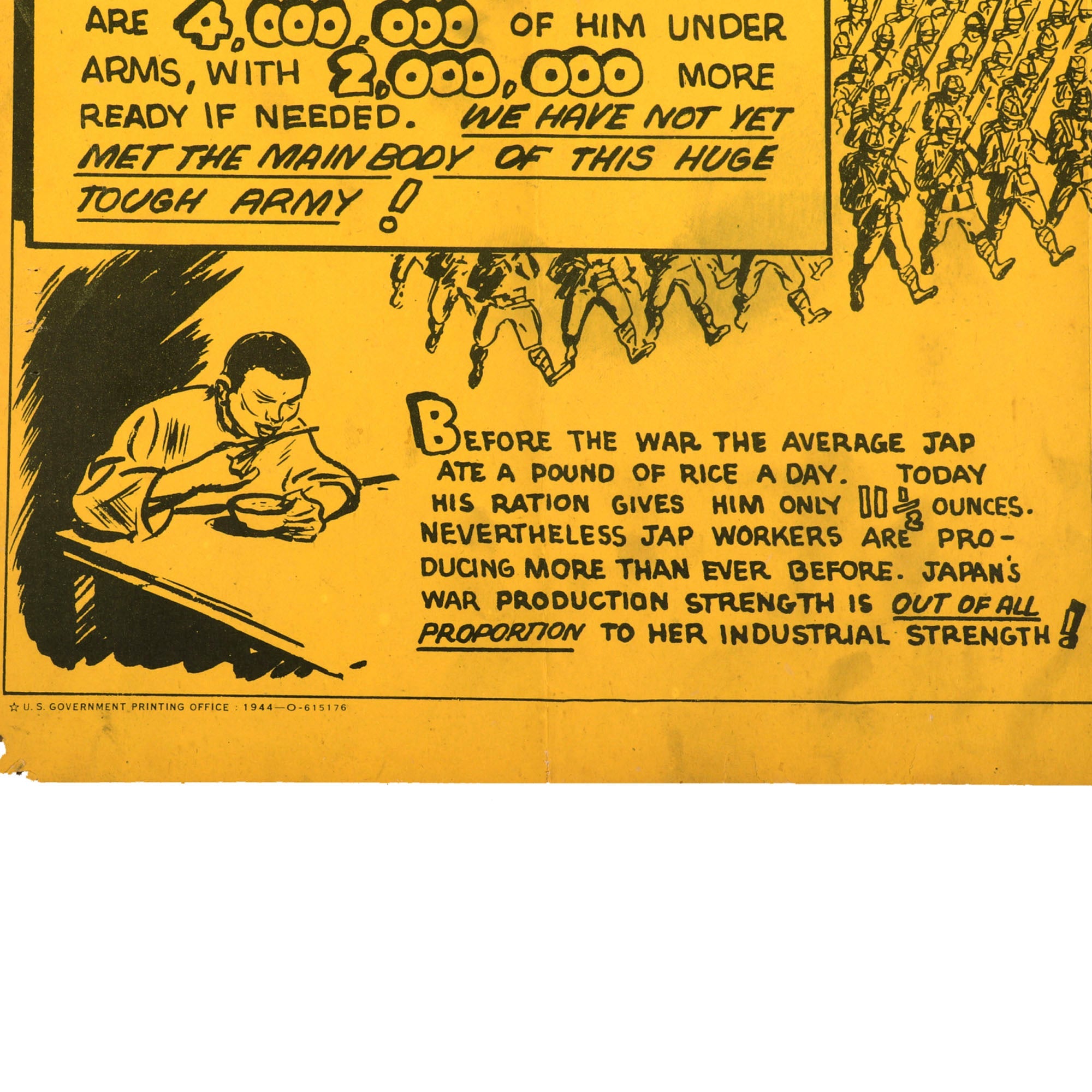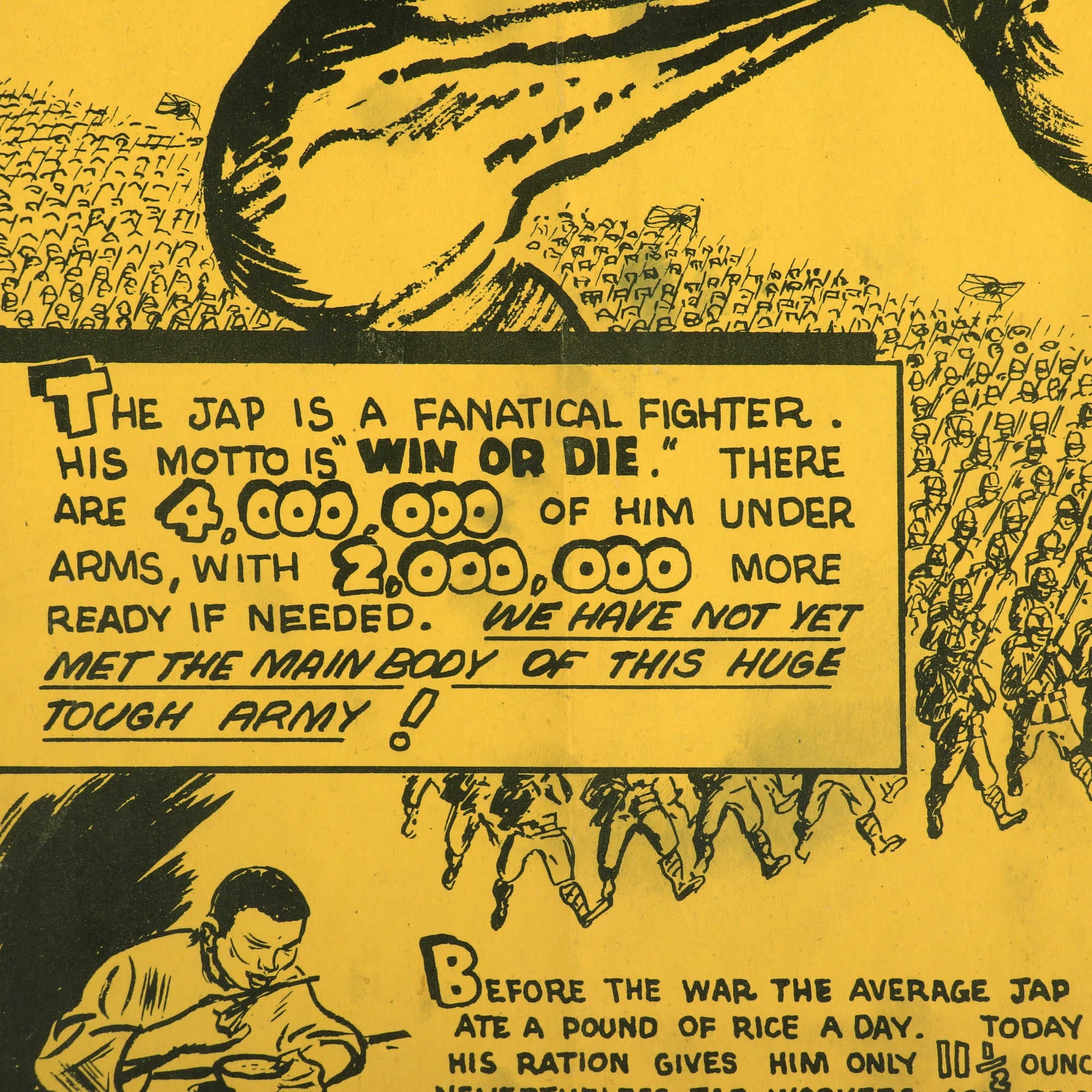 “The Jap is a fanatical fighter. His motto is "win or die". There are 4,000,000 of him under arms, with 2,000,000 more ready if needed. We have not yet met the main body of this huge tough army!” This poster also insinuates Japan’s control over 400,000,000 enslaved people.