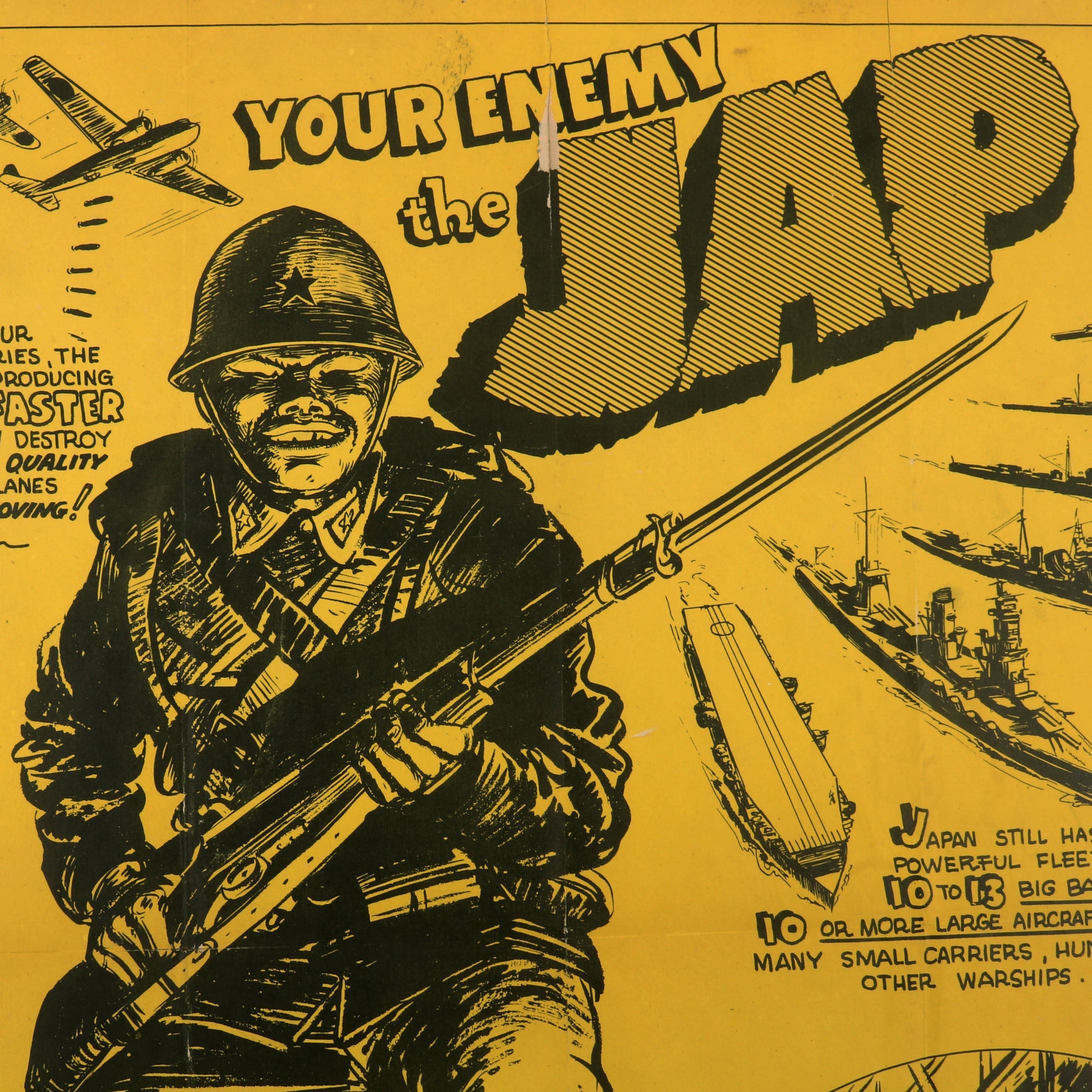 Original Item. Only One Available. This is a very rare official Navy propaganda poster that depicts a stereotype Japanese soldier, your enemy the Jap. It lists the achievements of the Japanese military to try and urge American sailors to fight harder. The cartoon's almost comic-like appearance made it more appealing to soldiers during wartime. The poster measures about 18” x 23 ½". The artist was Hotchkiss, USNR.