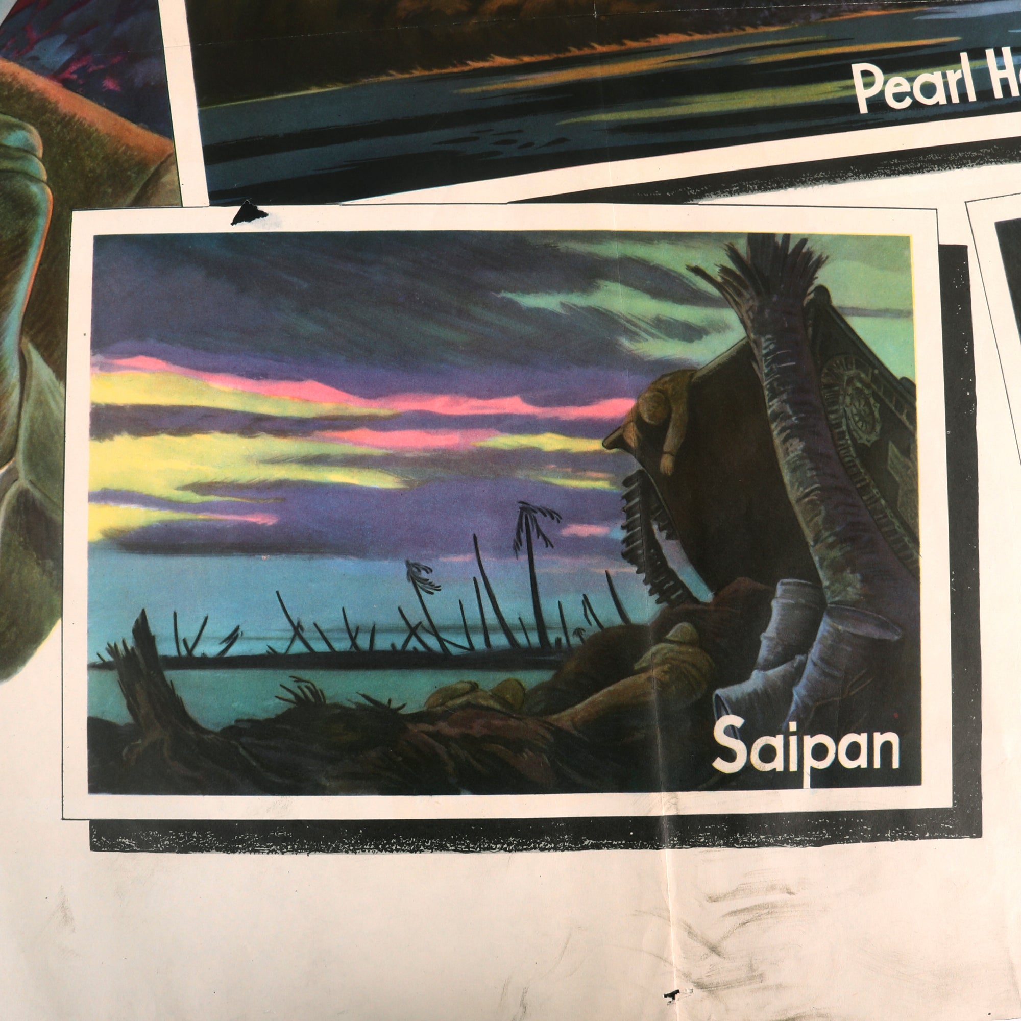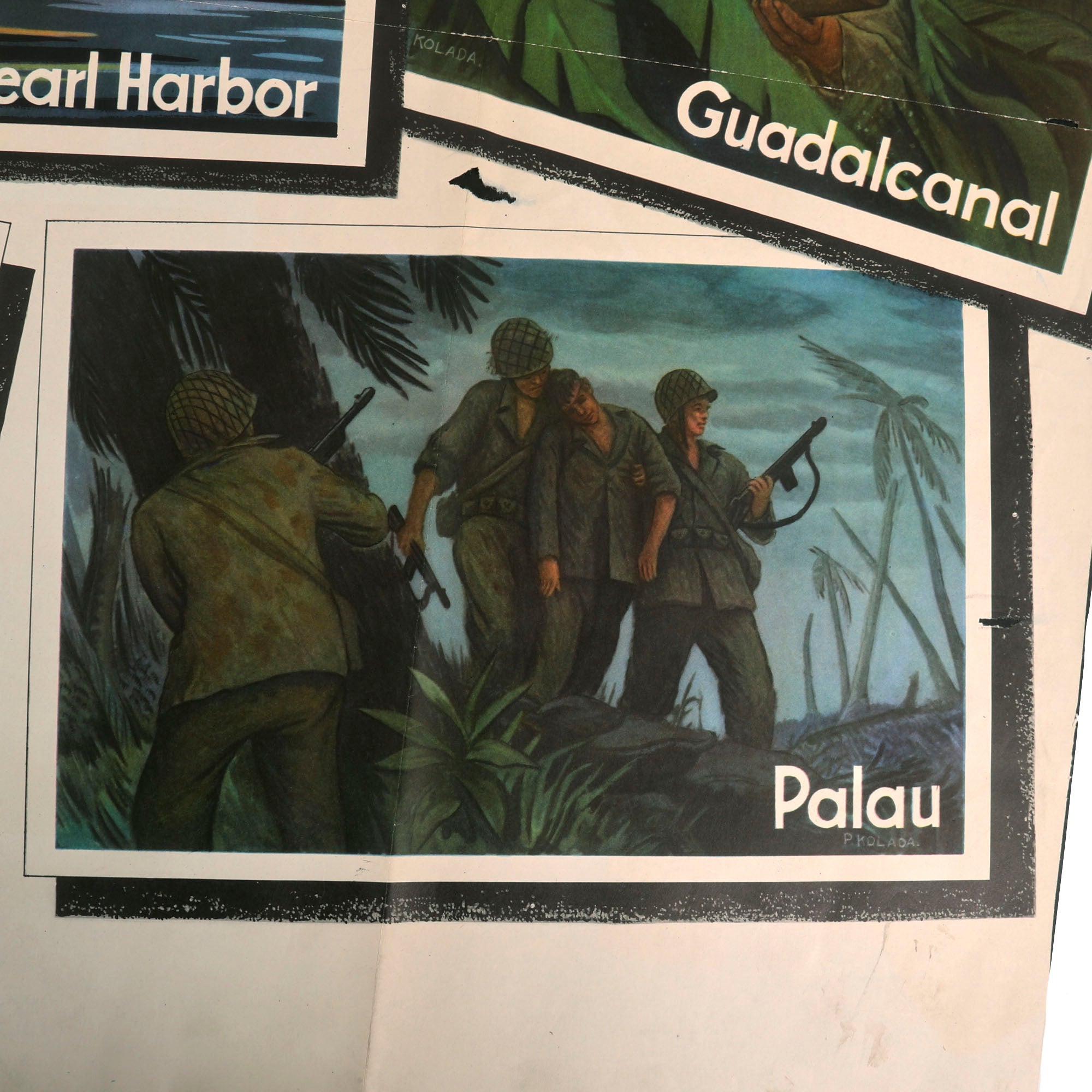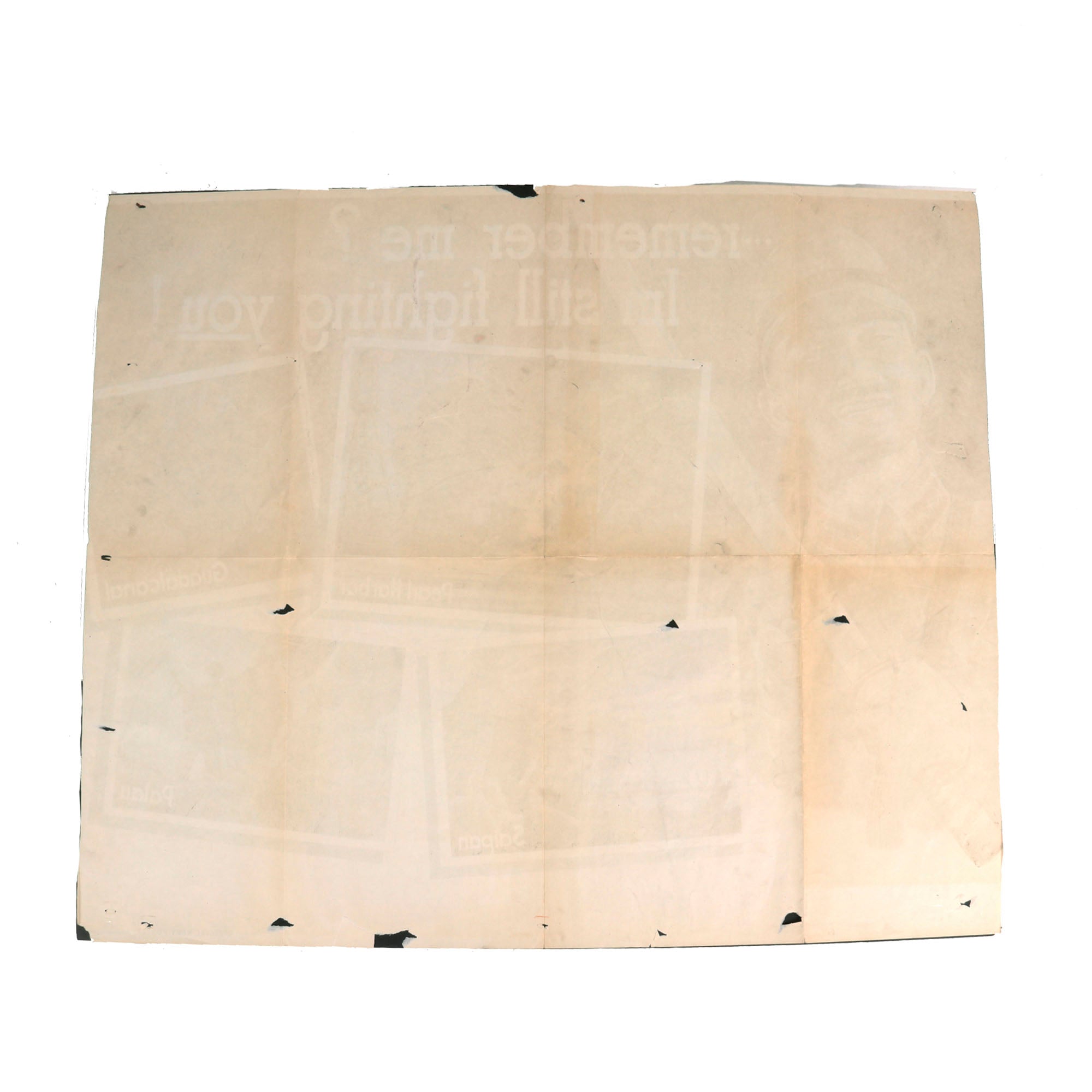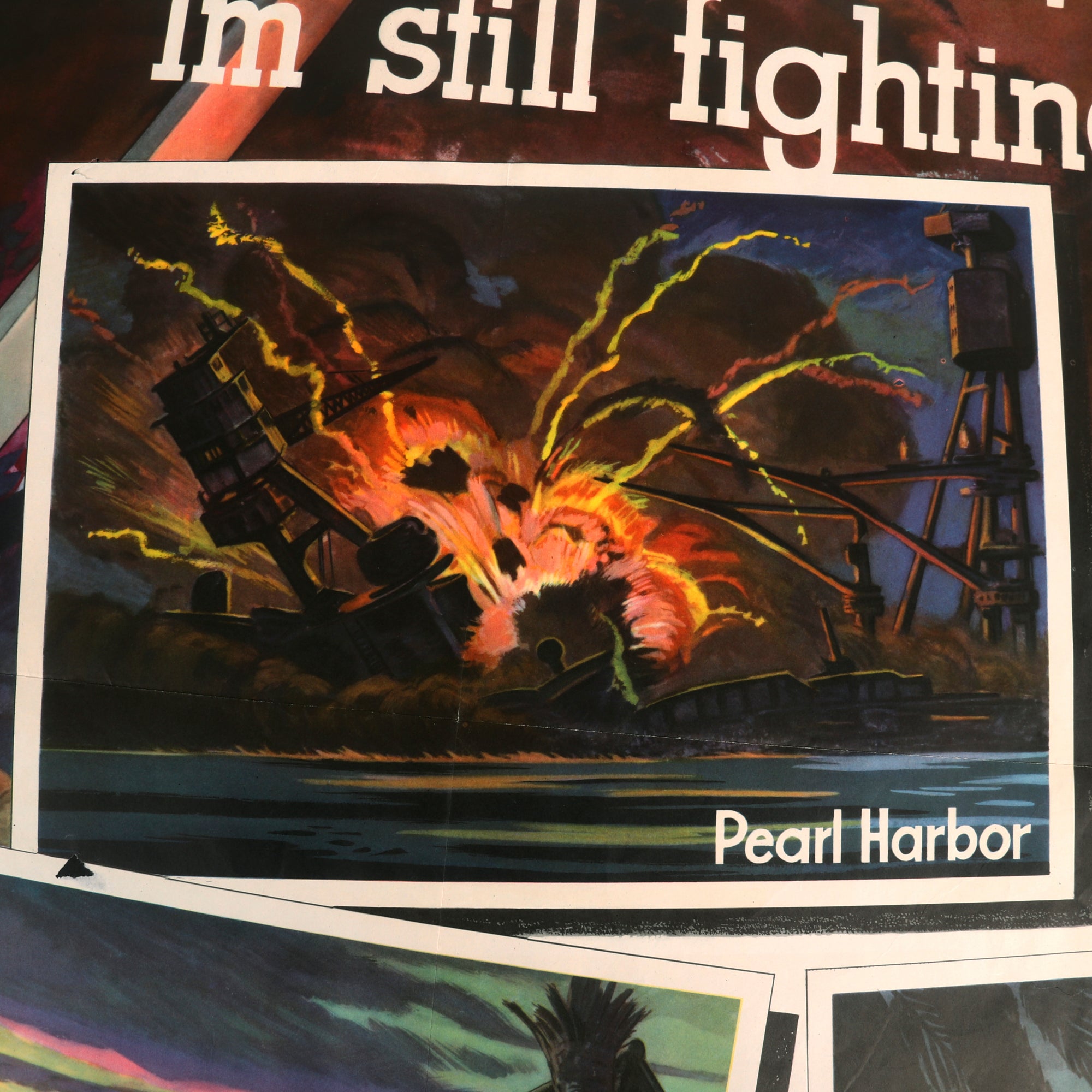 This is a phenomenal colorful WWII propaganda poster of a grinning Japanese Officer holding a samurai sword and looking at four pictured battle scenes (Pearl Harbor, Guadalcanal, Saipan and Palau). Patriotic printing at the top "...remember me? I'm still fighting you!" The poster measures 36" x 28 ½”. The poster is in overall fair shape, but appears to have been partially cut off on the left side, as some of the logistical print at the bottom is cut off.