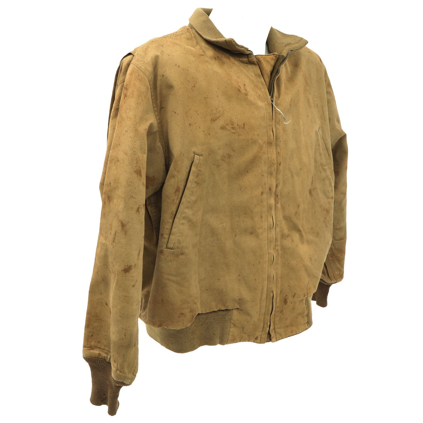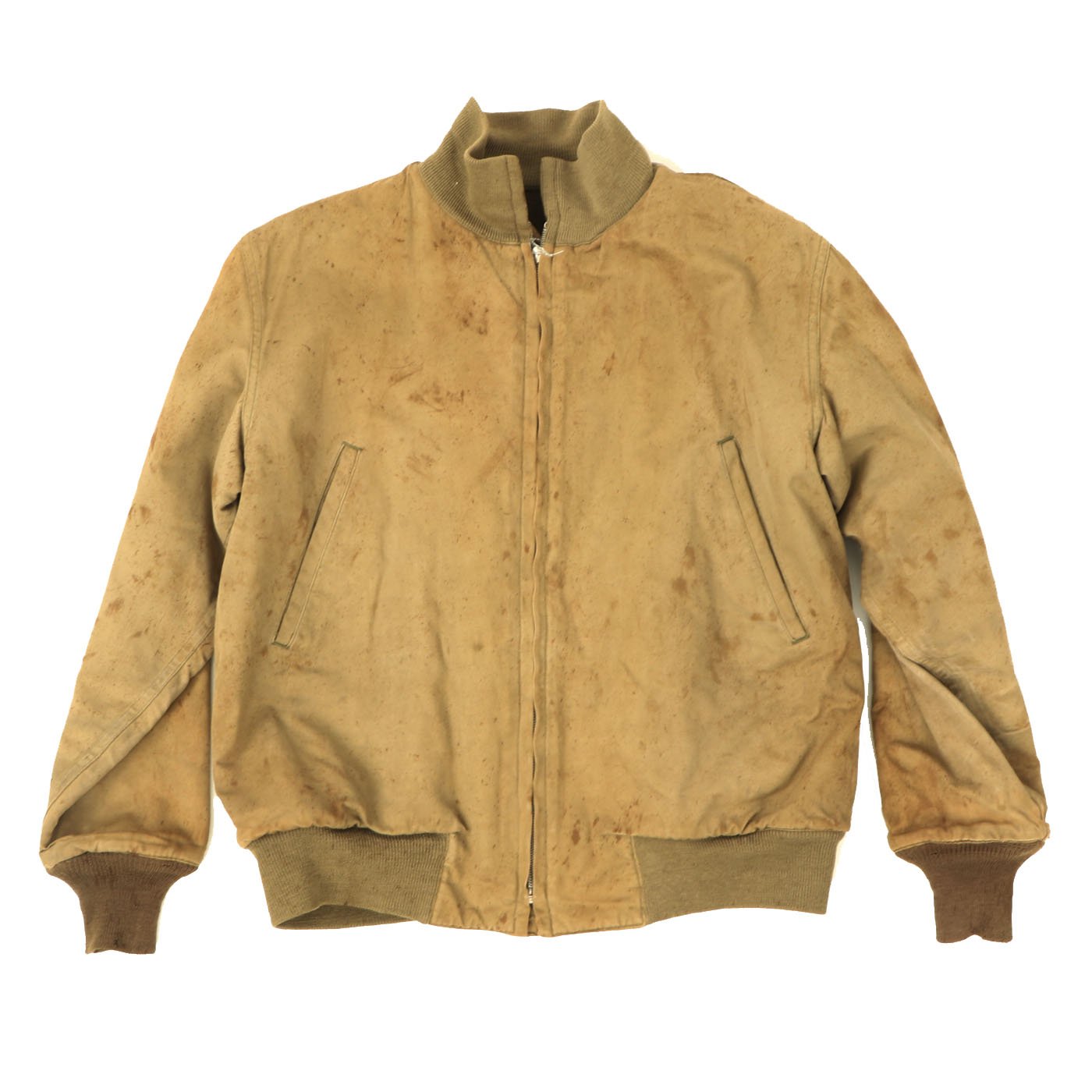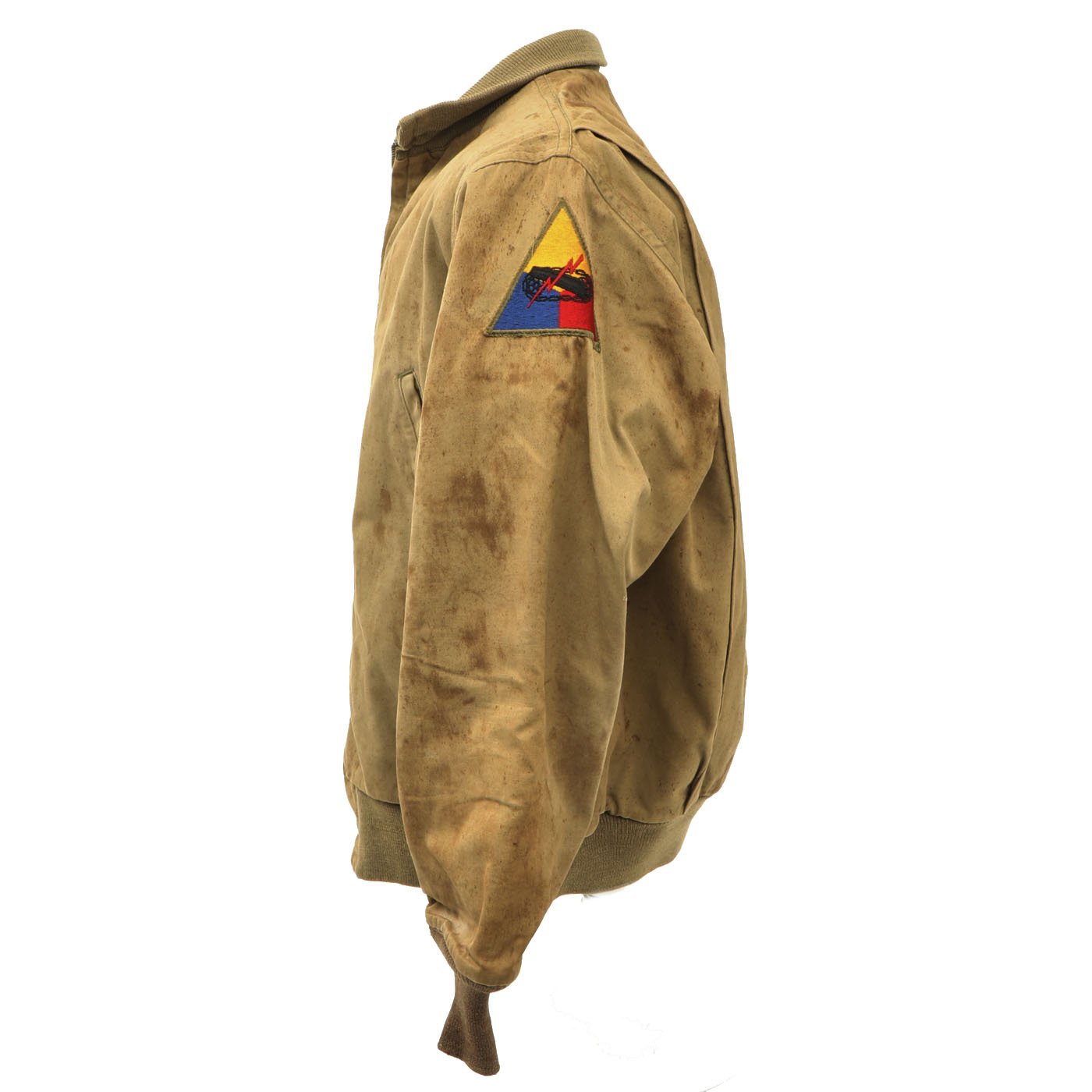 This jacket is in good condition, the "gold" hued color is still strong while the cuffs, collar and waist band display minor wear and are sturdy and totally wearable. The jacket shell and liner are in good condition with little wear or damage but there is splattered staining. Original tag is present but faded. Zipper functional but original zipper pull is missing. Left shoulder bears a Armor Division patch. This is a very nice hard to find jacket.