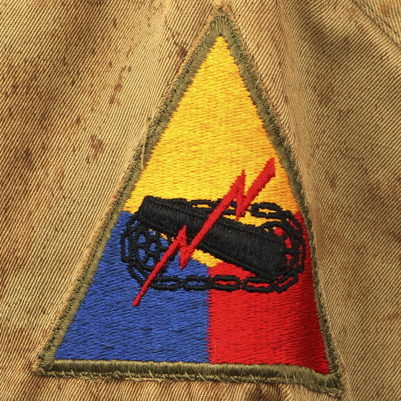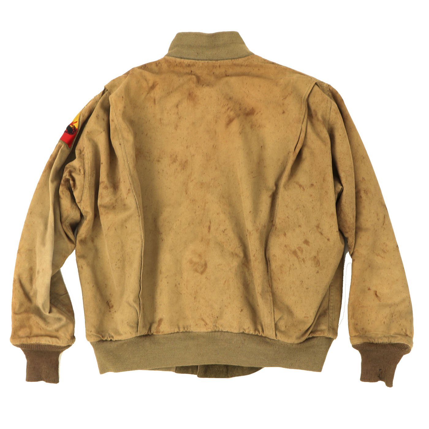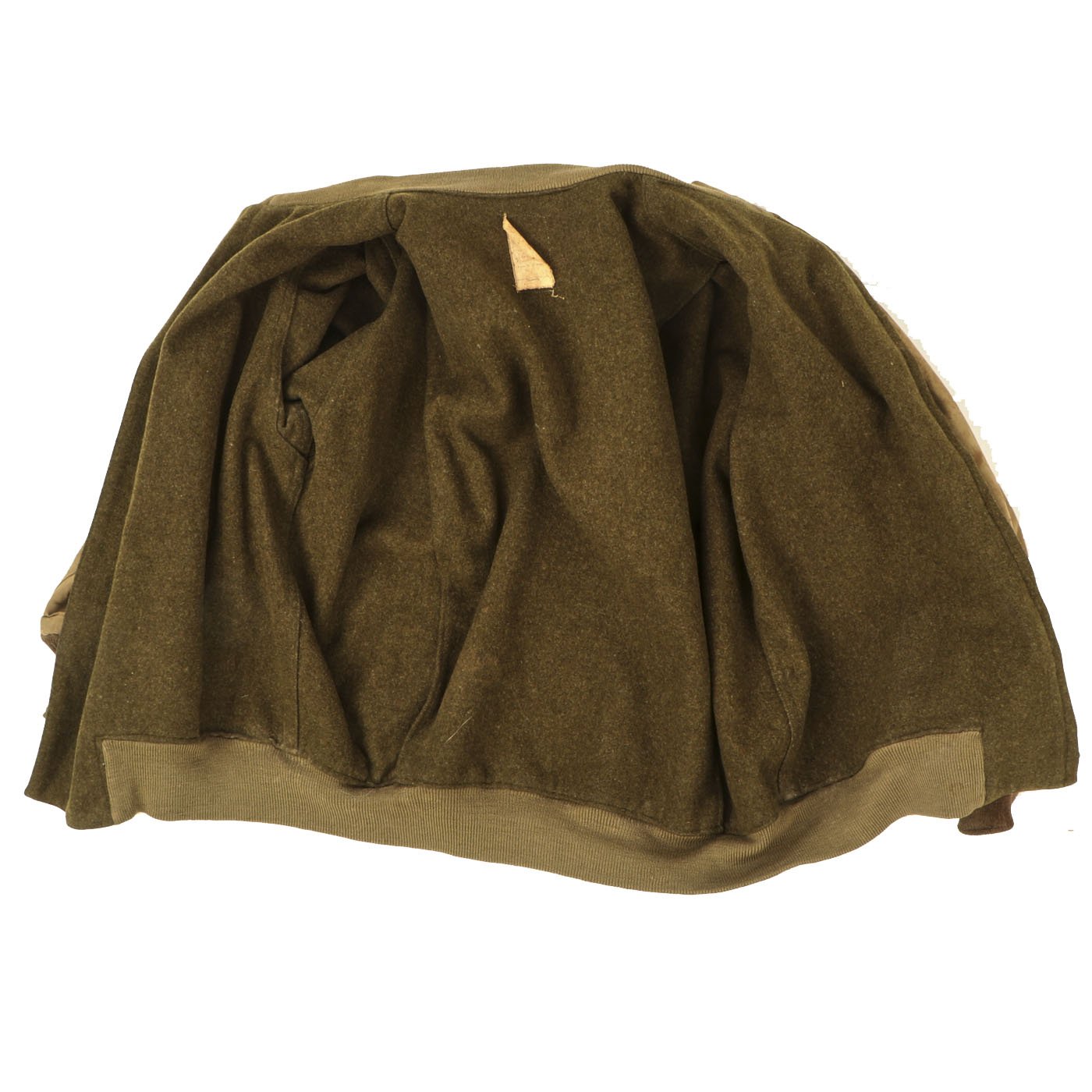 This jacket is in good condition, the "gold" hued color is still strong while the cuffs, collar and waist band display minor wear and are sturdy and totally wearable. The jacket shell and liner are in good condition with little wear or damage but there is splattered staining. Original tag is present but faded. Zipper functional but original zipper pull is missing. Left shoulder bears a Armor Division patch. This is a very nice hard to find jacket.