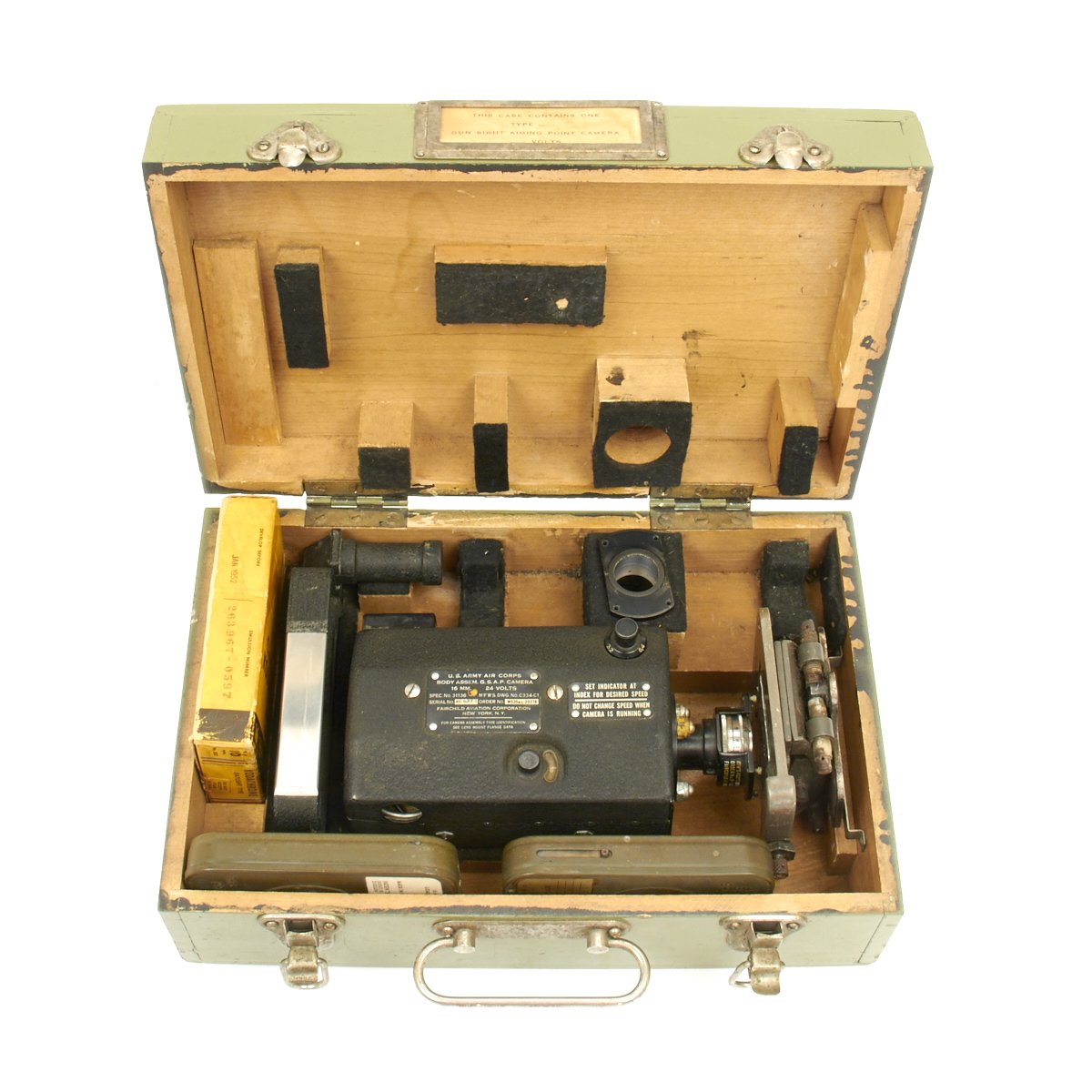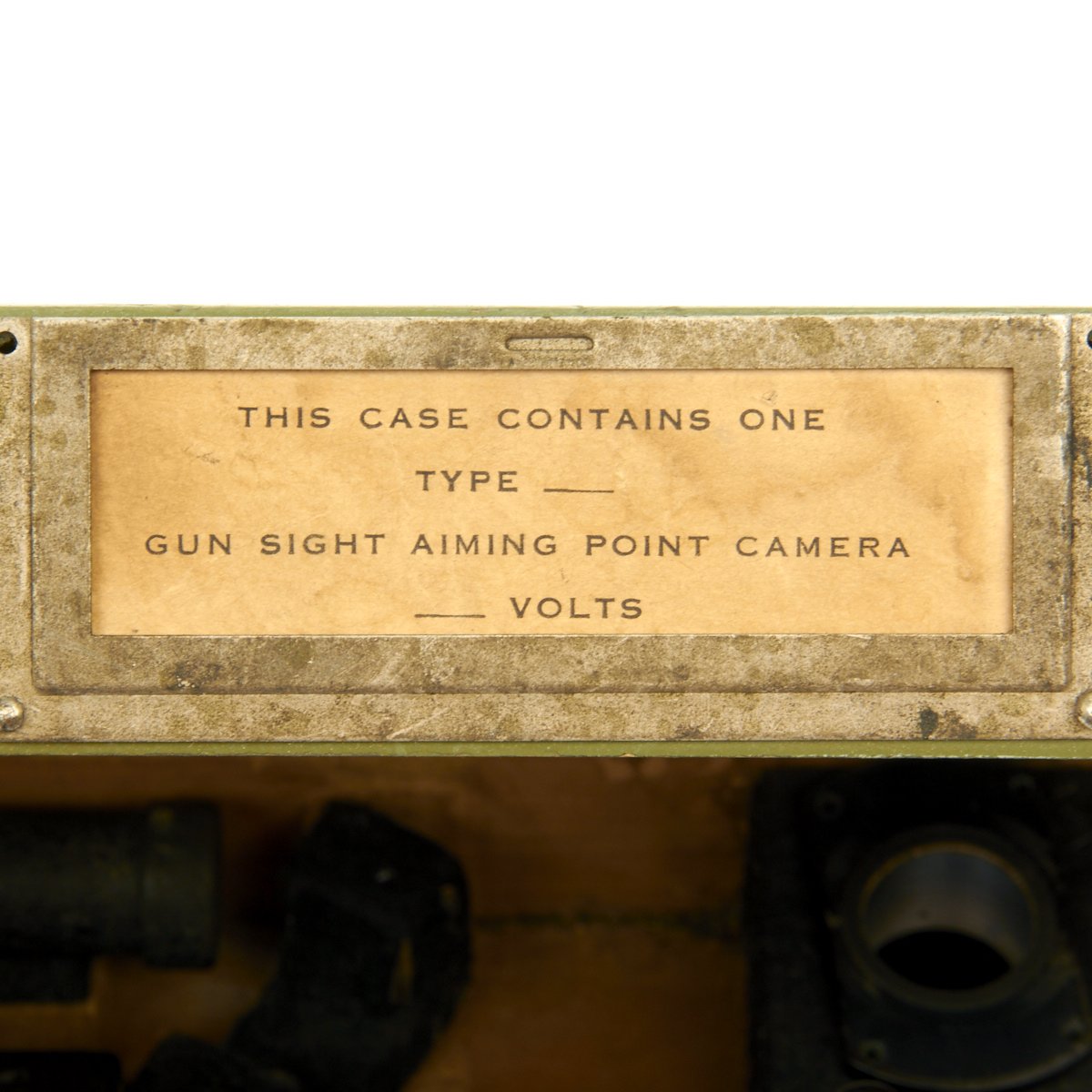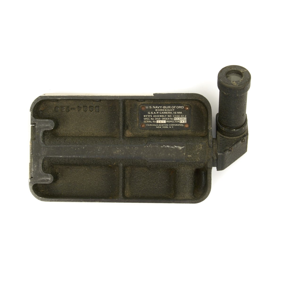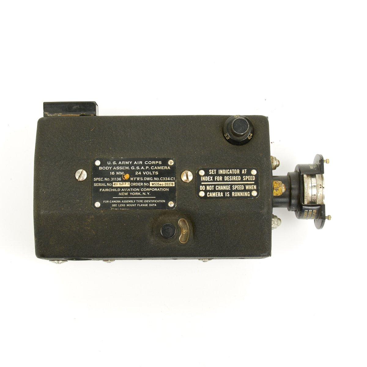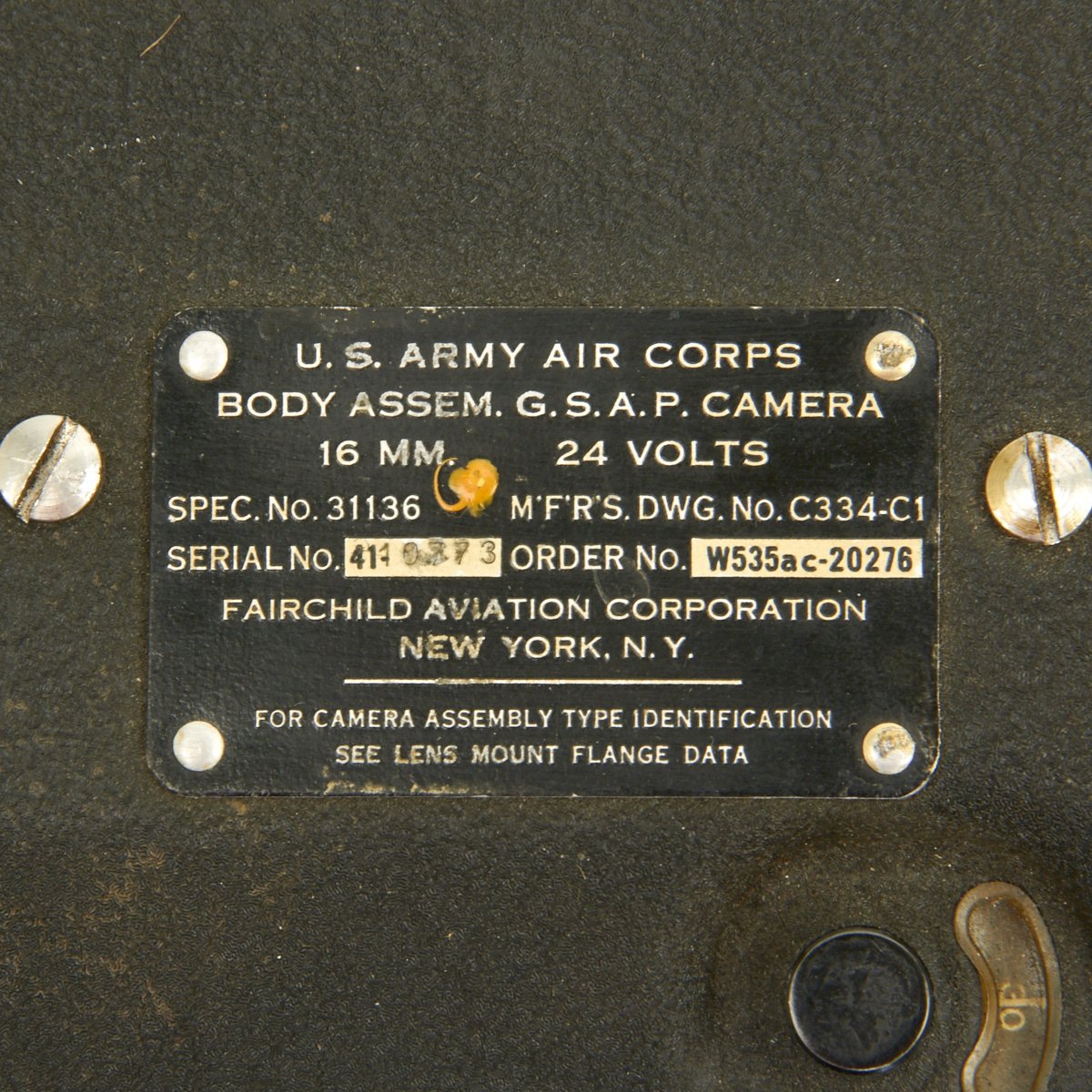 Original Item: Only One Available. This is a wonderful complete G.S.A.P. (Gun Sight Aim Point) 16mm gun sight movie camera with 35mm 3.5 lens and yellow filter. This camera was the standard United States Army Air Force cine-gun camera during World War II. It was used mostly on fighter aircraft such as the P-51, P-47 and P-38 to record and confirm hits during air to air and air to ground gunnery. The camera operated only when the aircraft's gun trigger button was pressed. This type of camera was also fitted to the remote gun turret aiming controls of the Boeing B-29 heavy bomber.