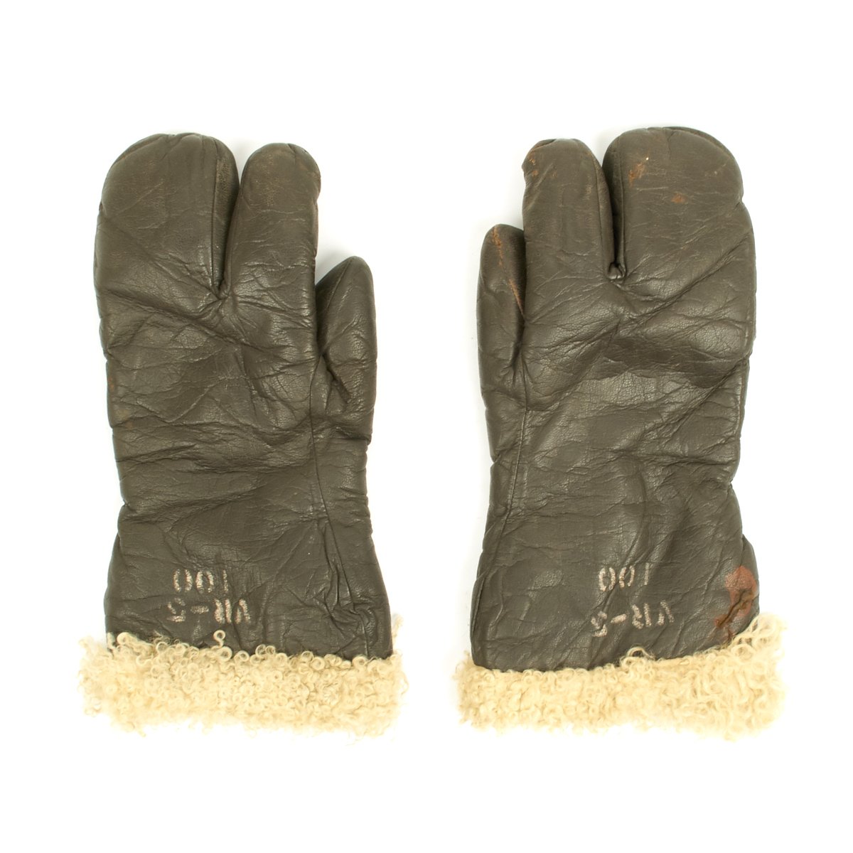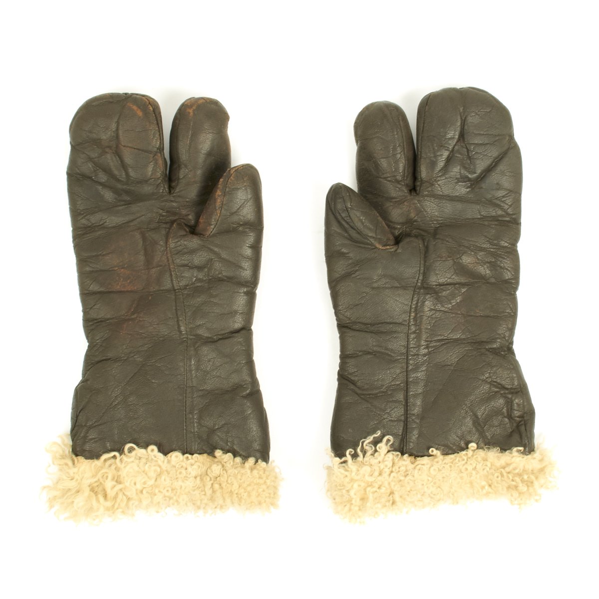 Original Item: Only One set Available. Genuine Vintage WWII cold weather lambskin flight mittens with trigger finger. Condition of these gloves is excellent. The brown finished leather is supple with no stains, cracks or open stitching. The lining is curly white lamb's wool. Size is medium.