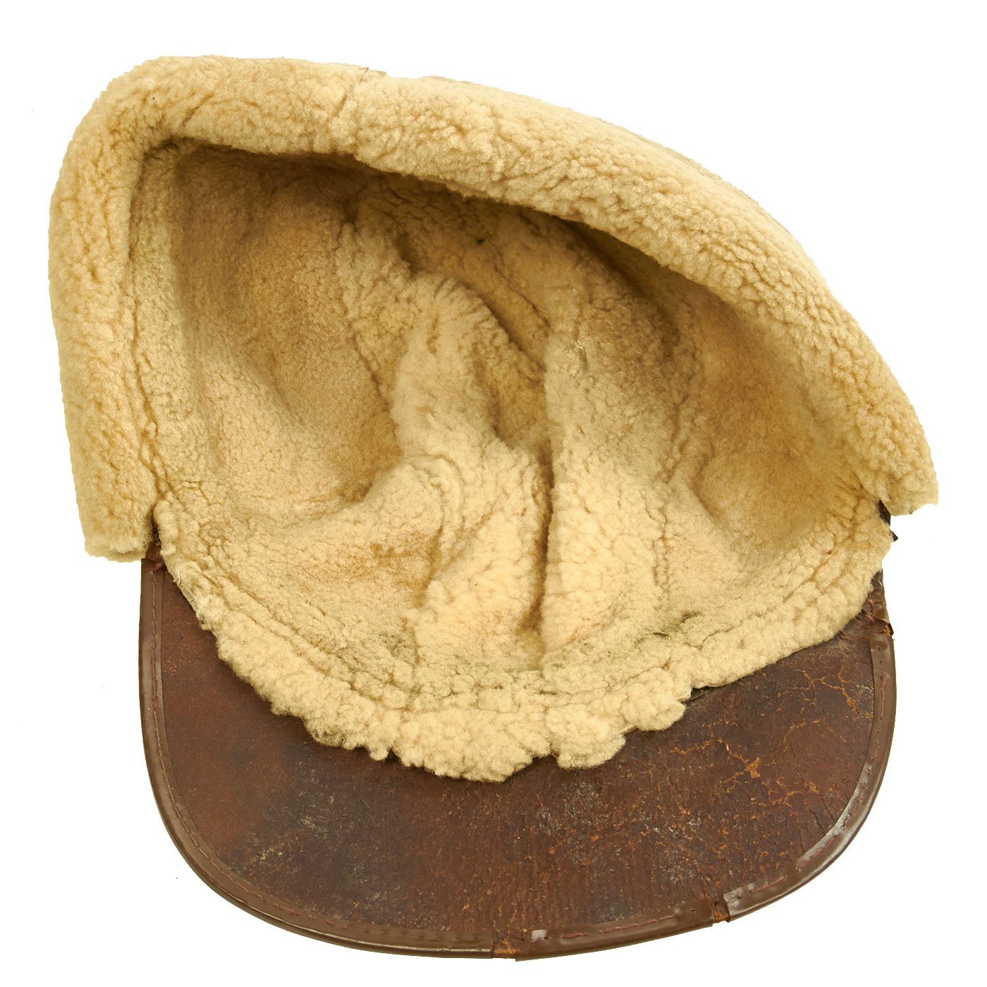 The cap is in good condition, with great shearling wool still intact on the inside of the cap, and the correct folded up neck flap, which could be folded down but was not often done. The exterior has some wear to the leather finish, and some small areas of loss in the piping. The pressed paper brim is in good shape as well. Size is medium which translates to a US 7 (56cm).