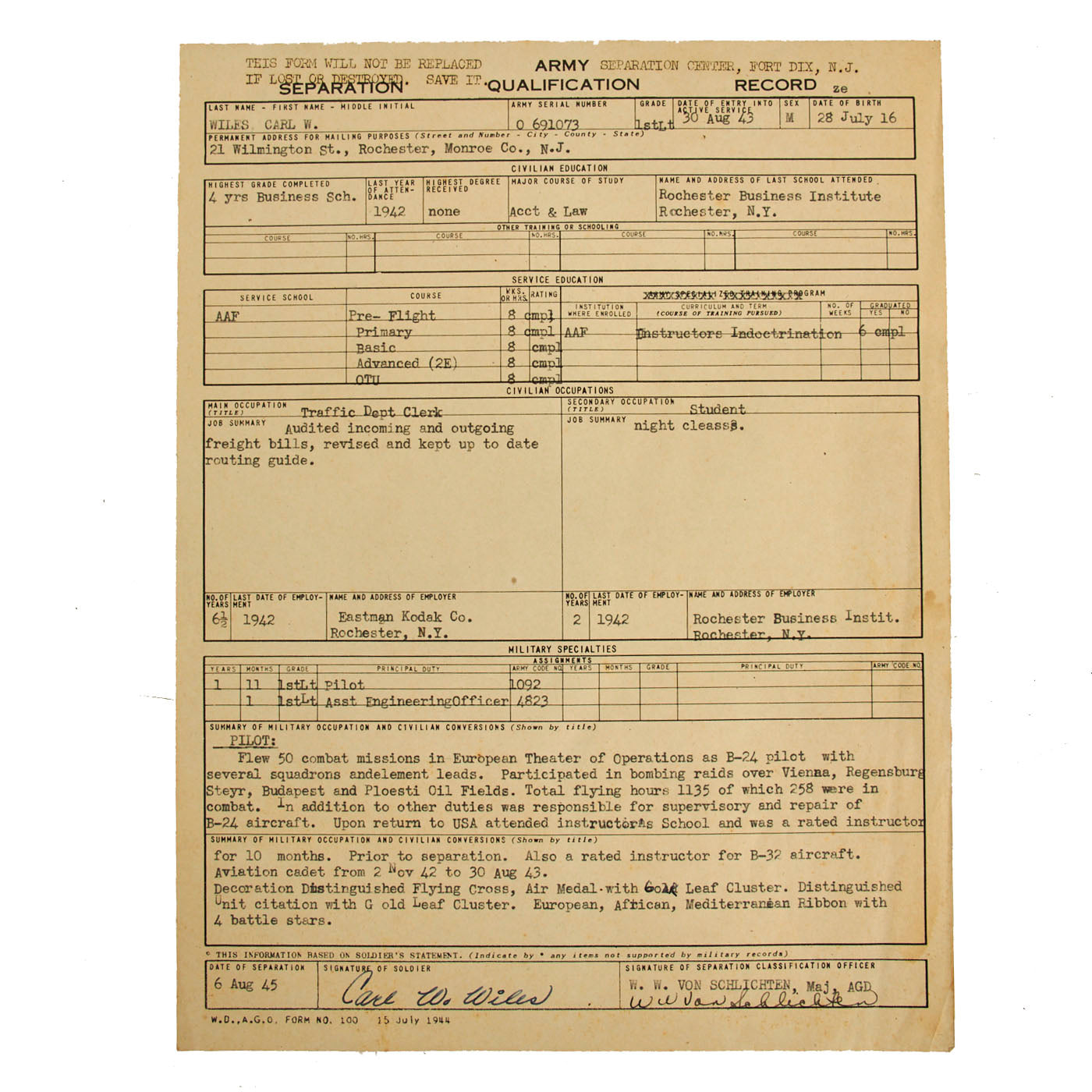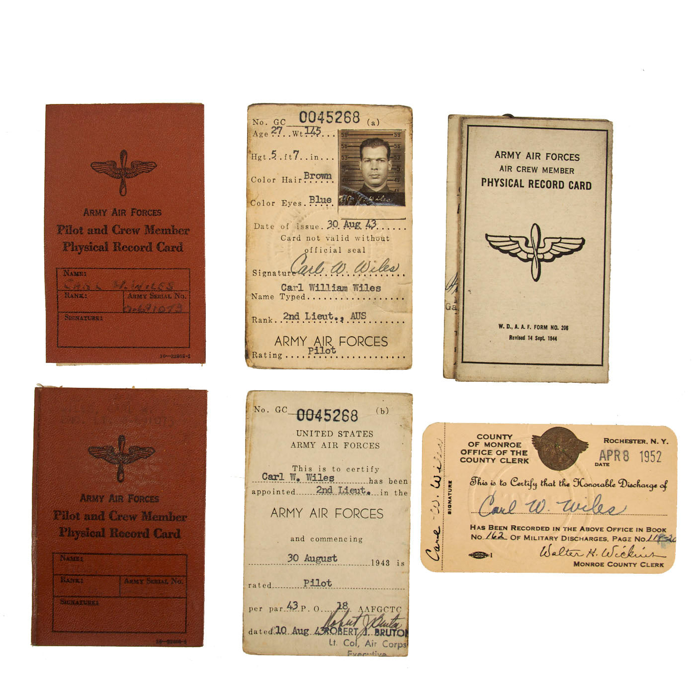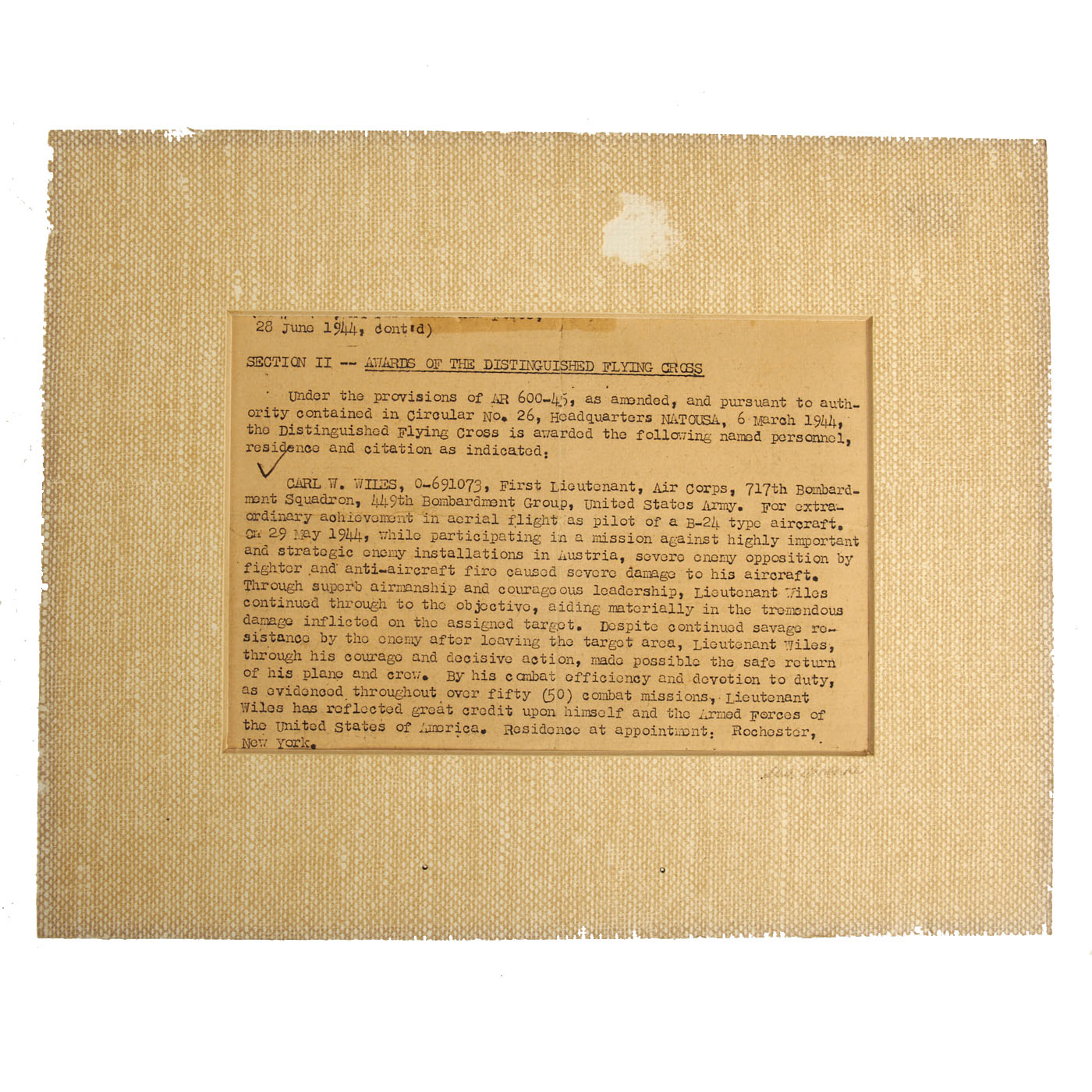Original Items: Only One Grouping Available. This is a lovely grouping attributed to 1st Lieutenant Carl W. Wiles, a pilot who served with the 717th Bombardment Squadron, 449th Bombardment Group. Wiles was a B-24 pilot during WWII who received multiple Air Medals and a Distinguished Flying Cross for actions during a mission against an important and strategic enemy installation in Austria.