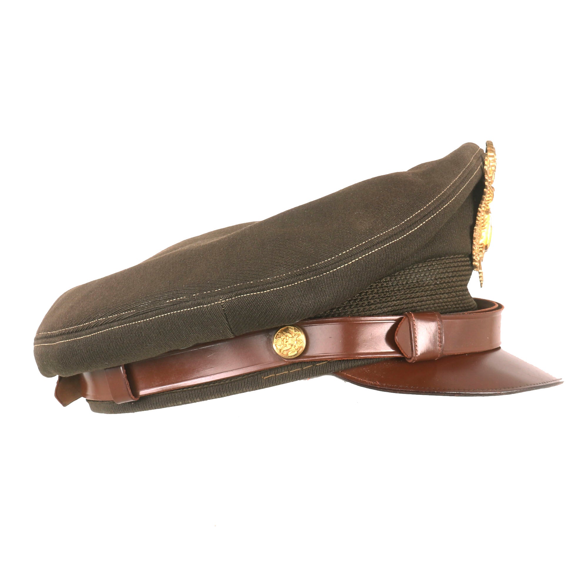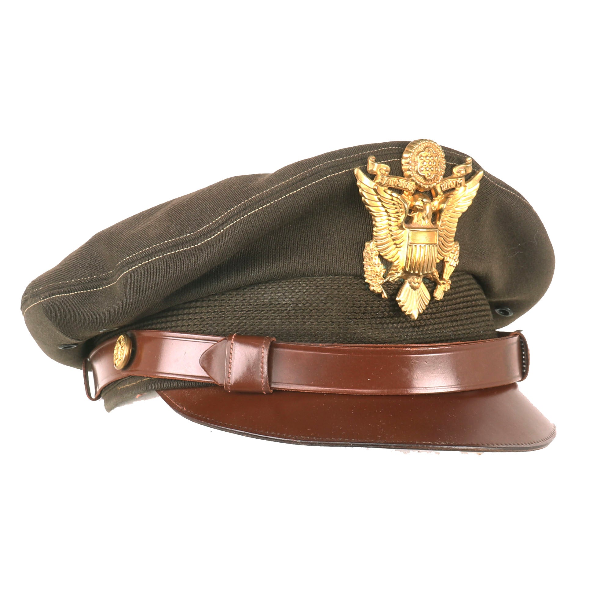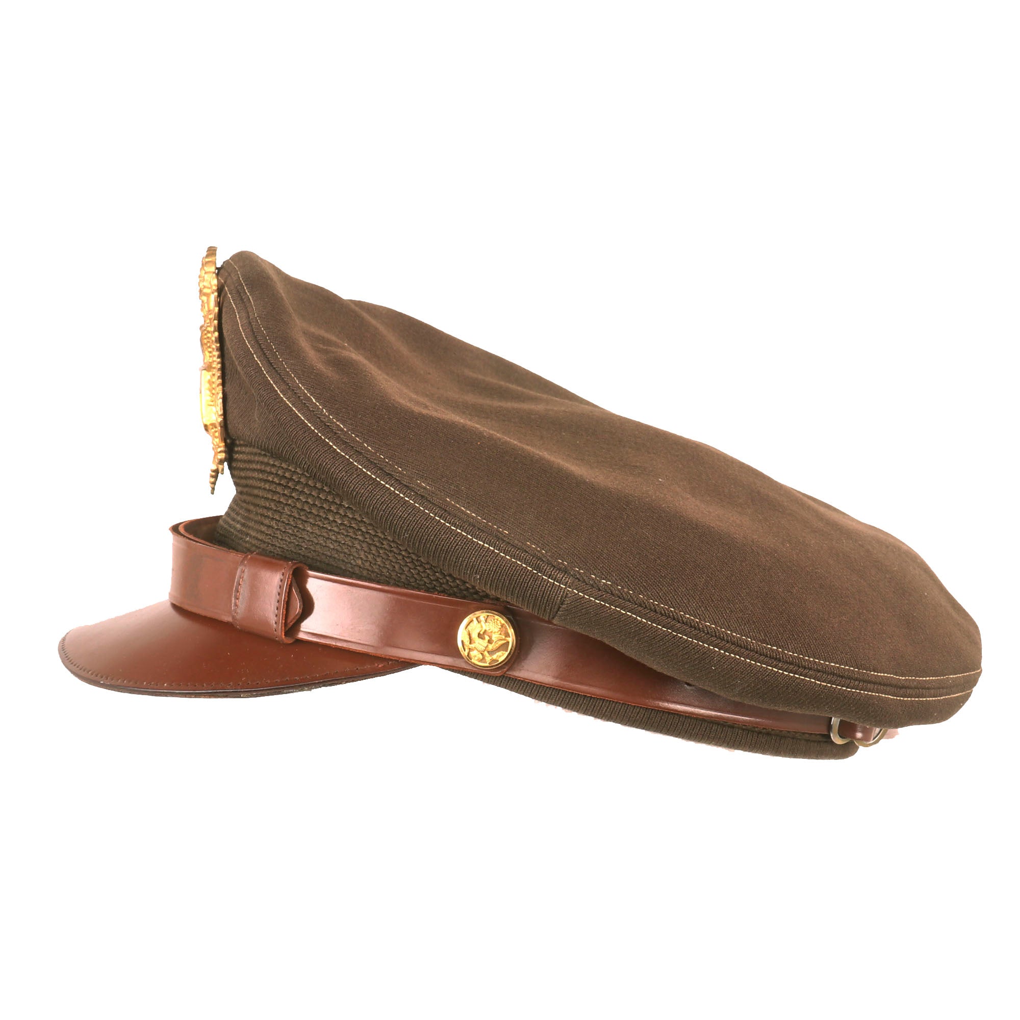 Original Item: One-of-a-kind. This visor cap, in olive drab wool elastique, was made by FLIGHT ACE, which is marked on the side of the sweatband, along with the original owner’s initials “H.S.A.” perforated on the opposite side.