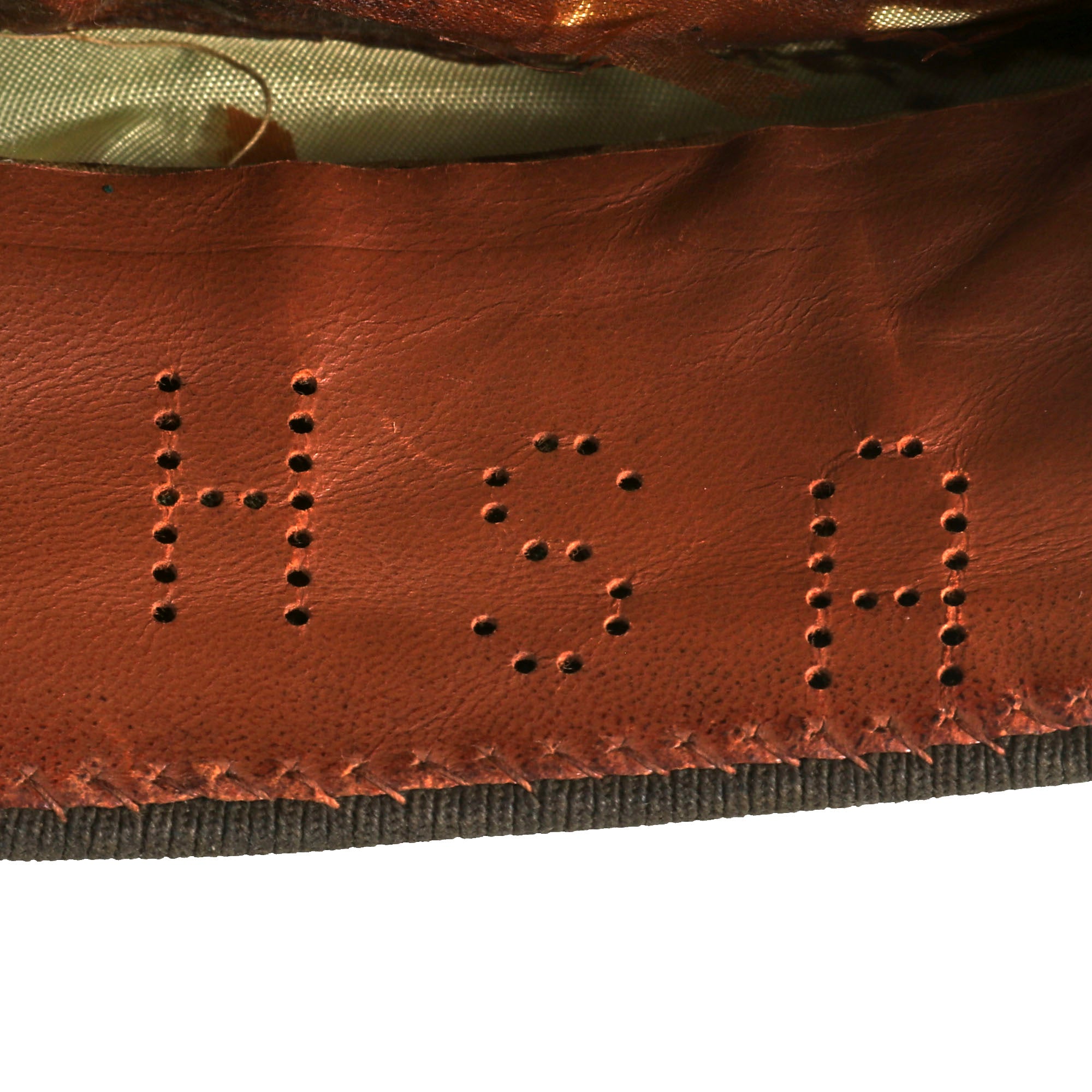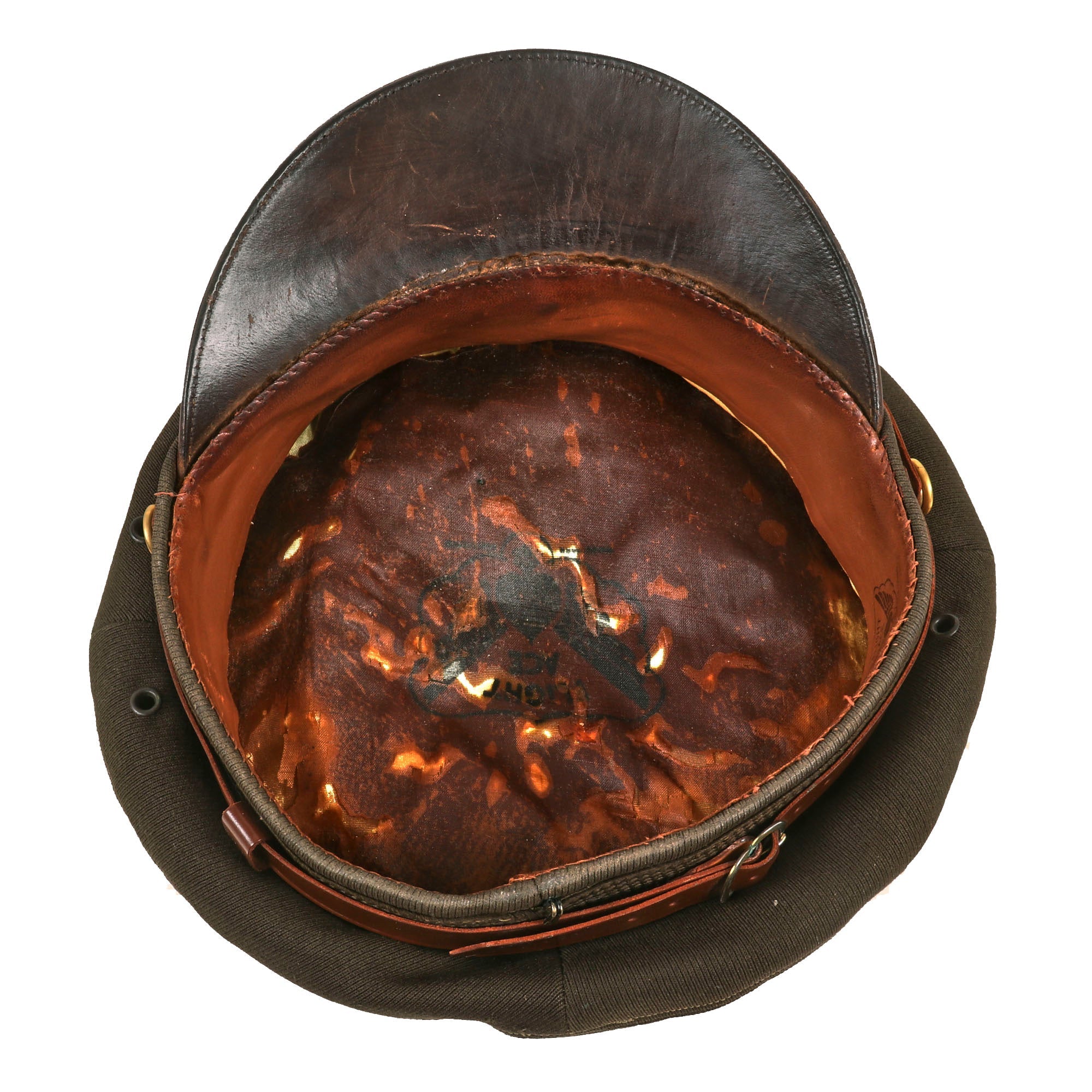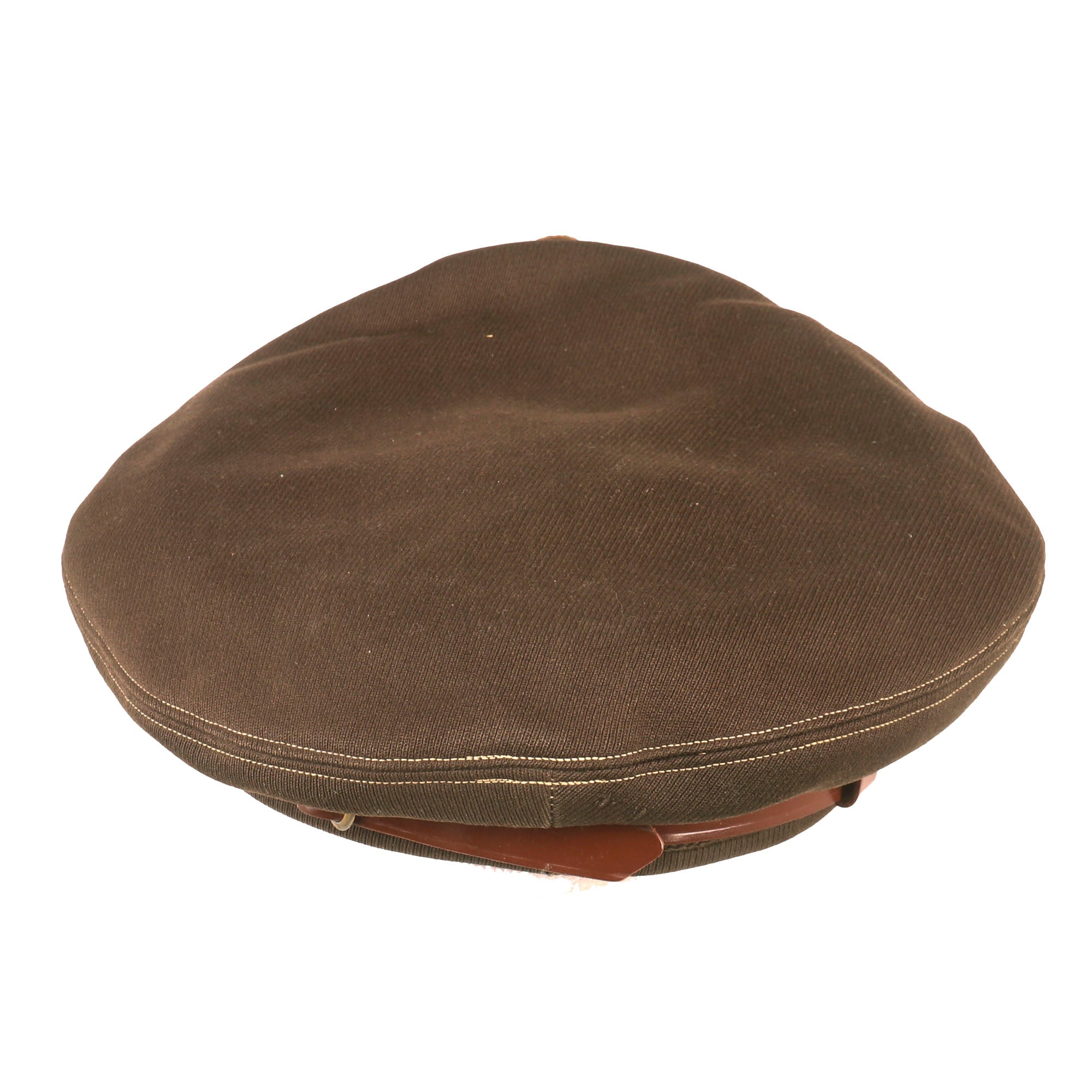 Original Item: One-of-a-kind. This visor cap, in olive drab wool elastique, was made by FLIGHT ACE, which is marked on the side of the sweatband, along with the original owner’s initials “H.S.A.” perforated on the opposite side.