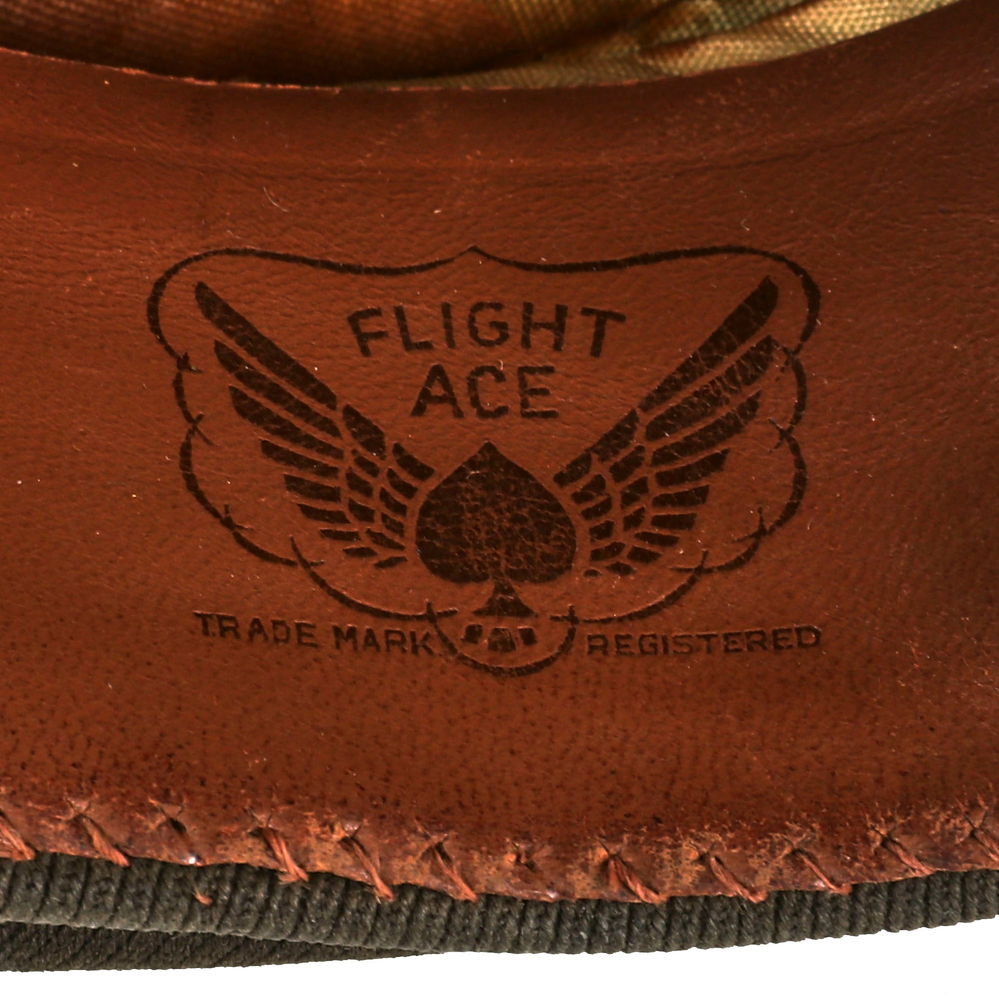 The size is marked on the sweatband, 7 1/4. The cap is worn but in very nice condition with the iconic "crush" shape. The liner is marked FLIGHT ACE TRADEMARK REGISTERED. This peaked cap features a gold tone WWII Officer’s Eagle device (of unknown maker) over the flexible single layer visor. Weatherproofing within the lining is very worn.