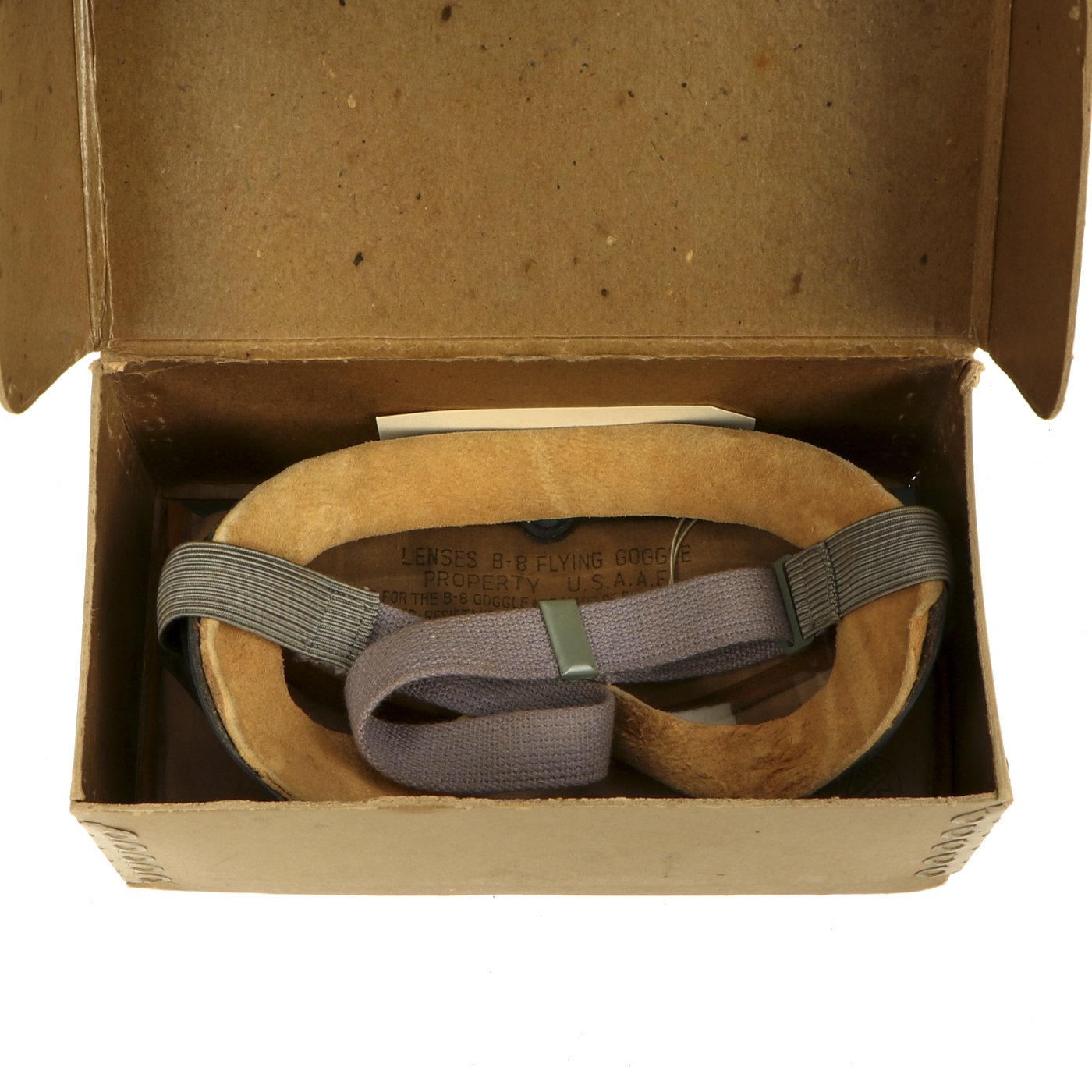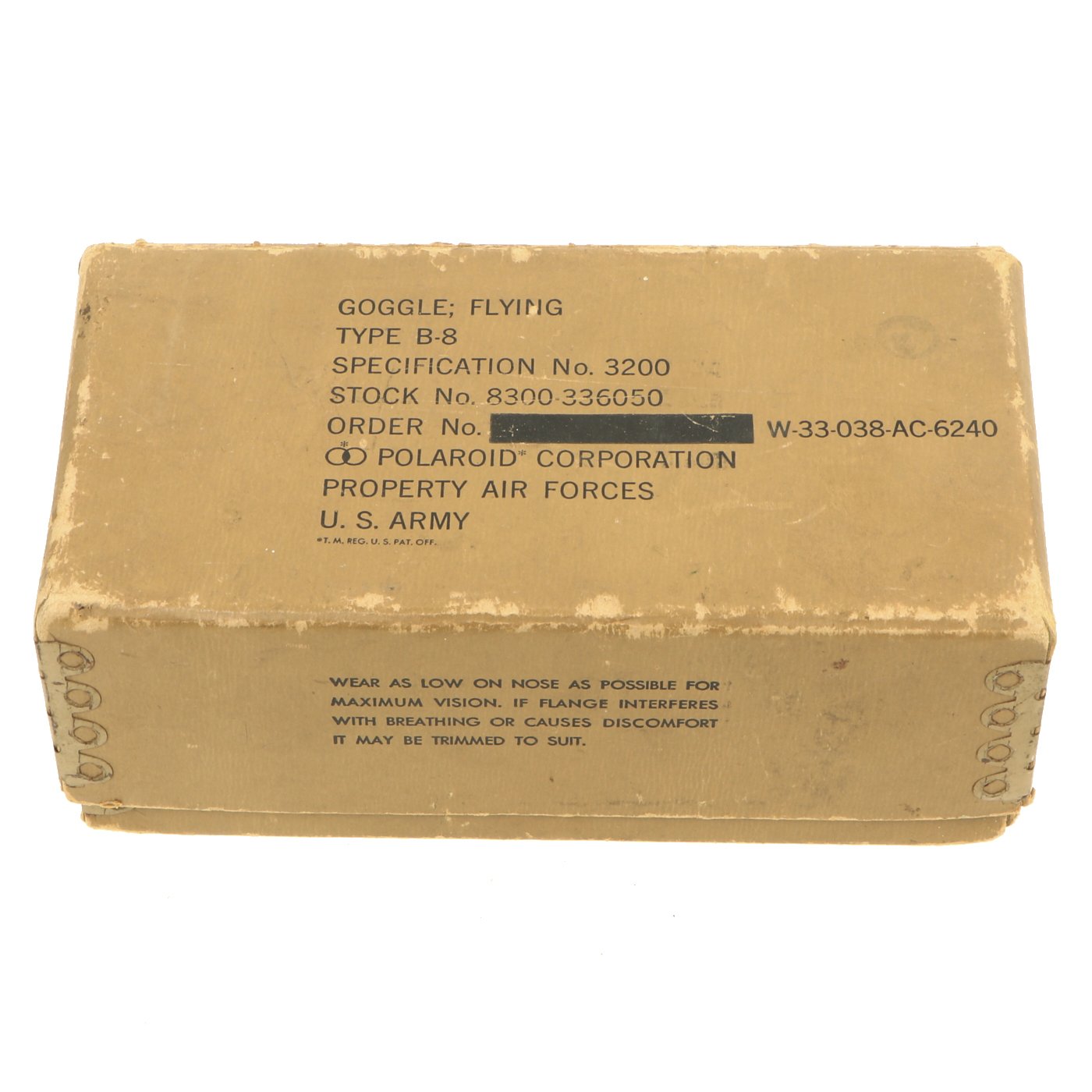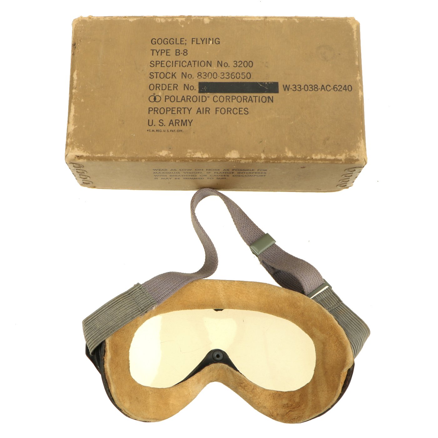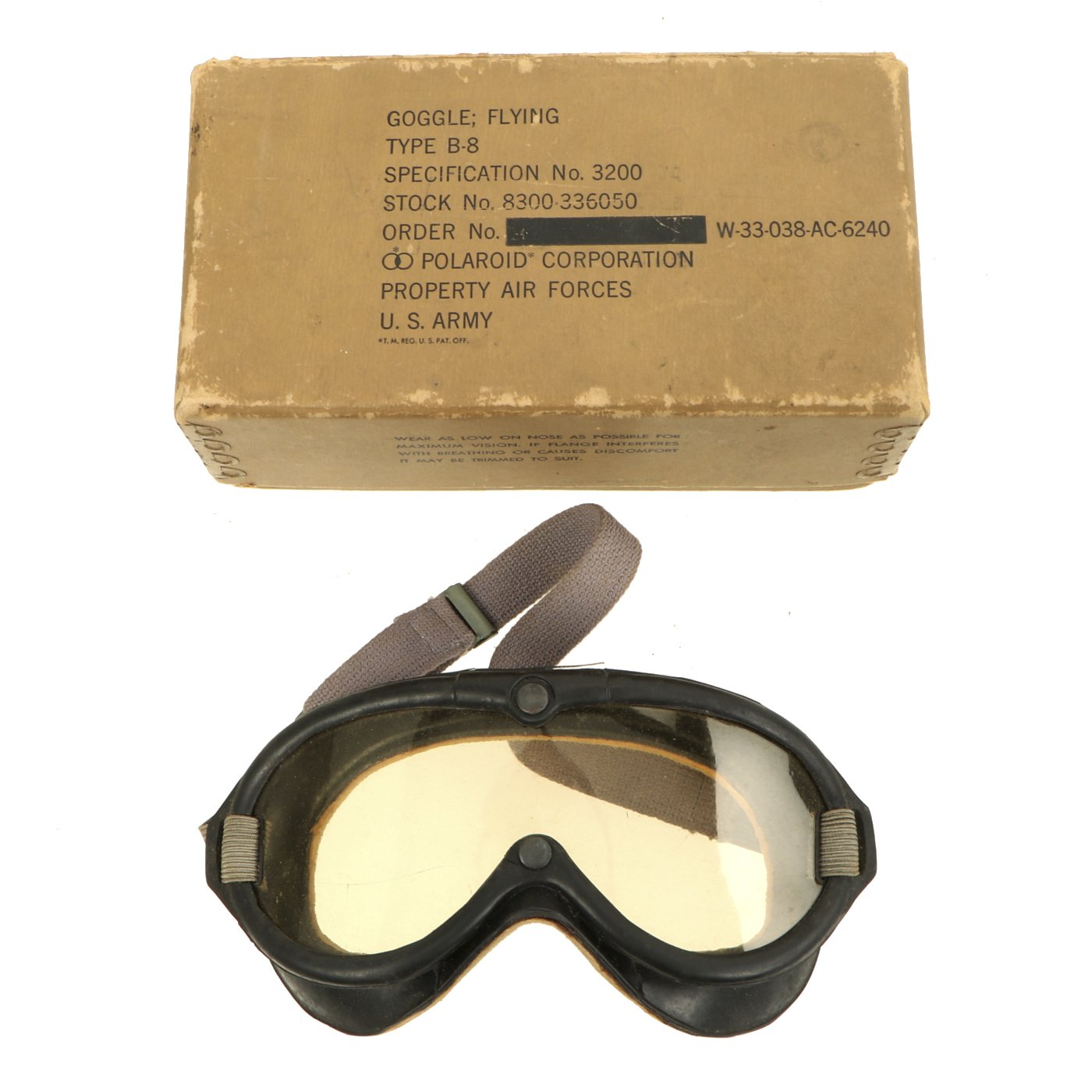 - WWII U.S. FLYING GOGGLE A.A.F. TYPE B-8 by POLAROID, with a very nice clear lens. The rubber surrounds are still quite supple, and the chamois backing is fully intact and does not have any major damage, just wear and some light staining. The strap is in great shape. Also included is the original box.