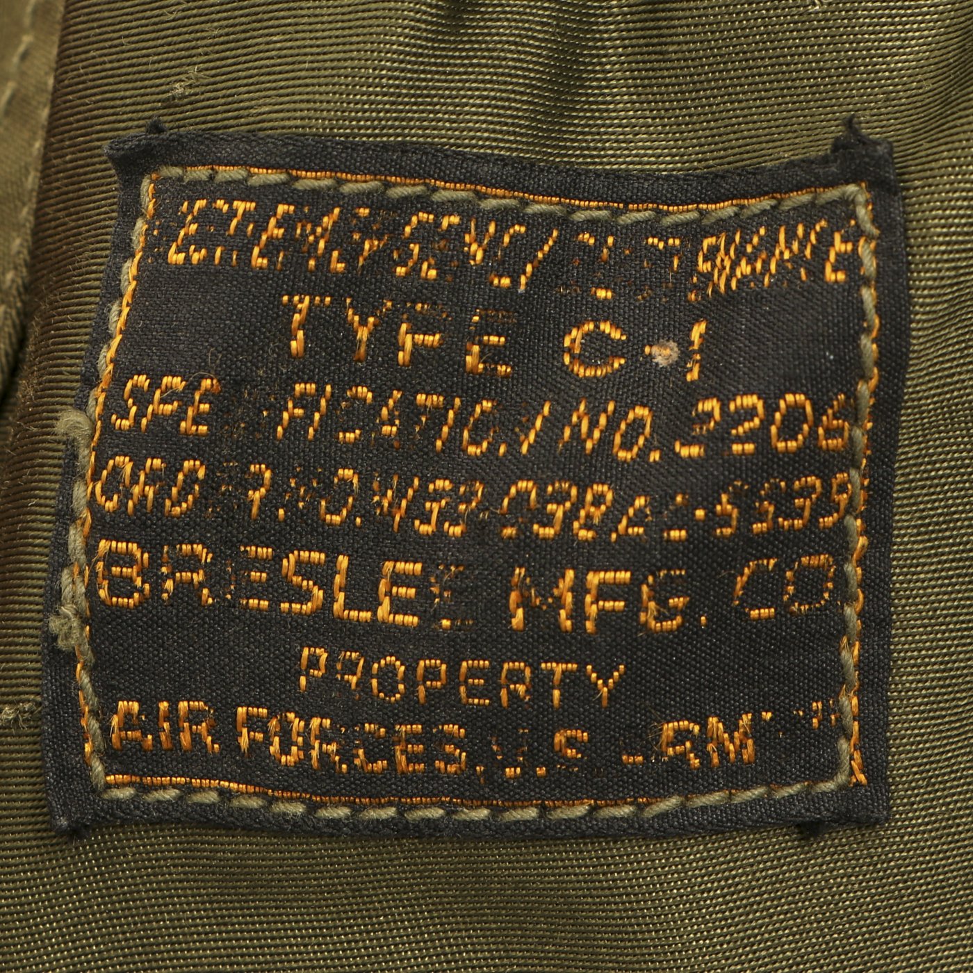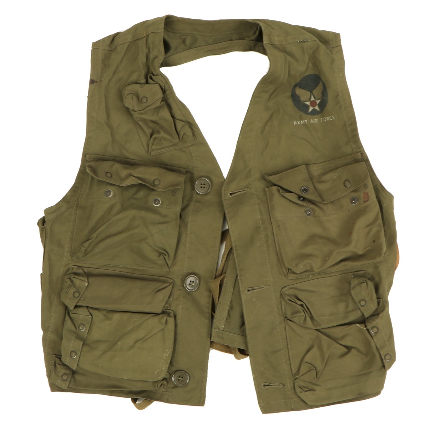 - Original U.S. WWII USAAF Pilot Type C-1 Emergency Sustenance Vest. The C1 survival vest was developed during World War two for use by the Army Airforce. The C1 vest has seen service by both Air force and navy personnel from World War Two through Korea and to a limited extent in Vietnam. The vest was made of dark olive colored green tackle twill and weighed 11 pounds when complete with survival contents. There were three large buttons on the front for closure. The vest was used alone and in conjunction with various seat and back pad survival kits which were also initially developed during World War Two. The C1 vest was designed for use in all parts of the word, however, the C1 proved better suited to the tropical and Arctic regions. The C1 was issued in one size but was adjustable through three ties at the back and was intended to be worn under the mae west life vest, body armor and the parachute harness, but over the uniform and A2 leather jacket. This however, proved to be too cumbersome when worn in some theaters of operation when all the survival equipment was carried so a modified musette bag that attached to the parachute harness upon bailout was developed. After landing, the crew member could then remove and wear the vest.