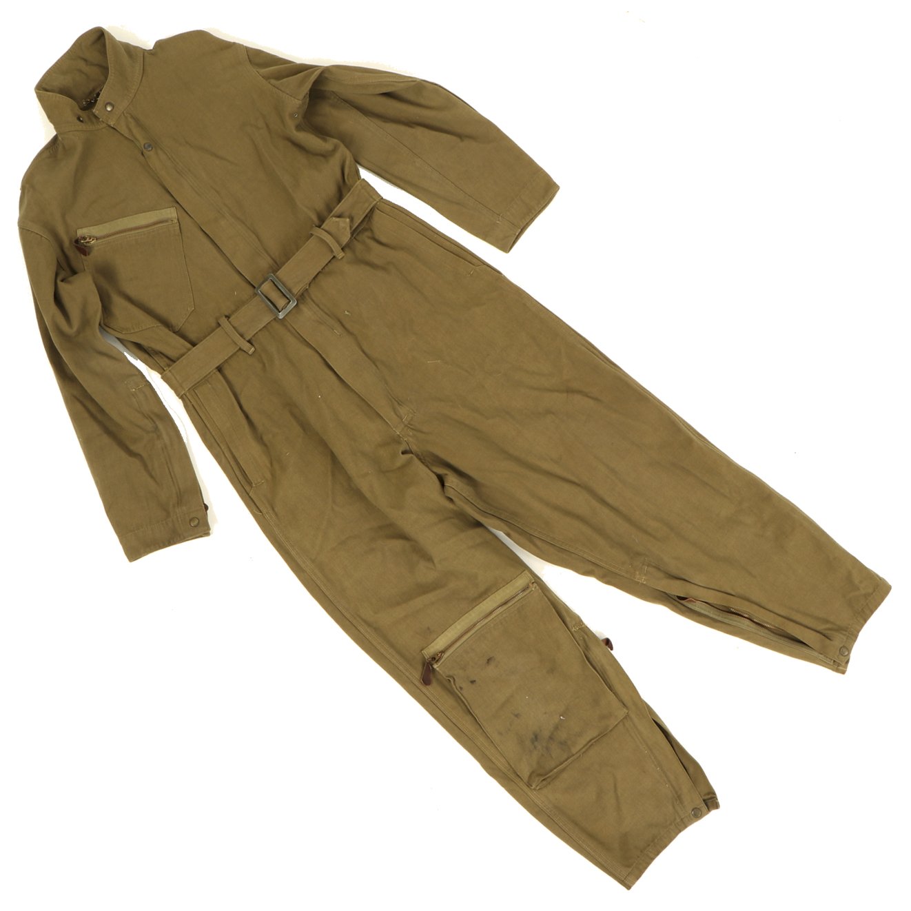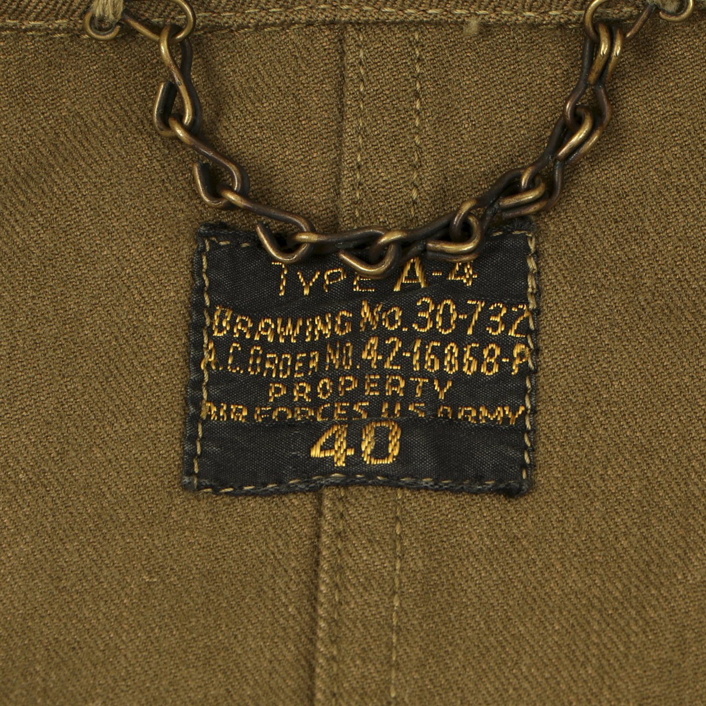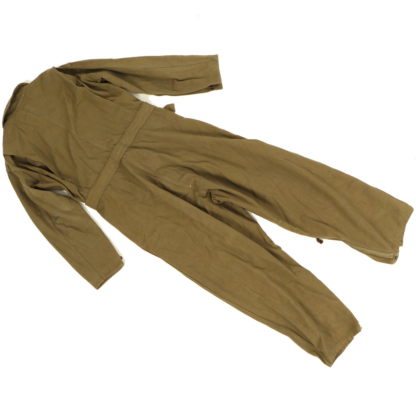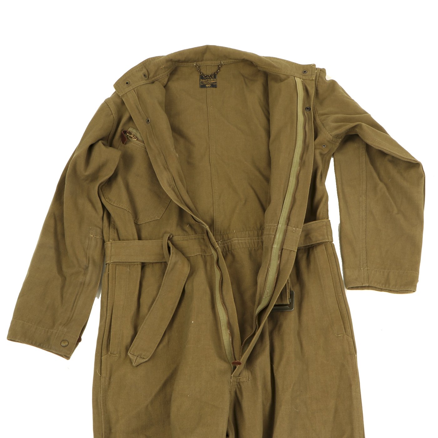 - Size 40 WWII US Army Air Force Summer Type A-4 Flight Suit - When the United States entered World War Two much of the military was unprepared for combat. The uniforms and equipment employed was very antiquated, most of it dated back to World War one. Advancements in the field of aviation require that the US Army Air Force develop a new line of uniforms known as flight suits. The one featured here is designed for summer wear. It was manufactured of a cotton and wool material and they were khaki in color. The design of the flight suit consisted of a khaki colored jump suit. With a zipper that secures the front shut. Additional zippers are placed at the bottom of the legs. This feature makes it easier to put on and take off the flying boots. A belt is permanently attached to the waist area. A metal buckle is provided. These were designed and put into production pre-WWII so they are well used by the Army Air Corps and the Army Air Forces. These were used by all pilots and flight crews during the war and were see in all theaters of the war. As described in the book "Gear Up," the A-4 Type suit was made of olive drab gabardine with a zipper front and belted waist. It usually had a diagonal chest pocket and an open pocket on the right shin. This suit was standardized March 18, 1930 and was used in various forms throughout WWII.
