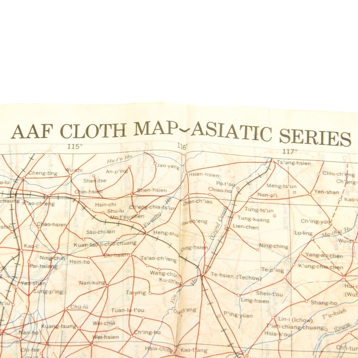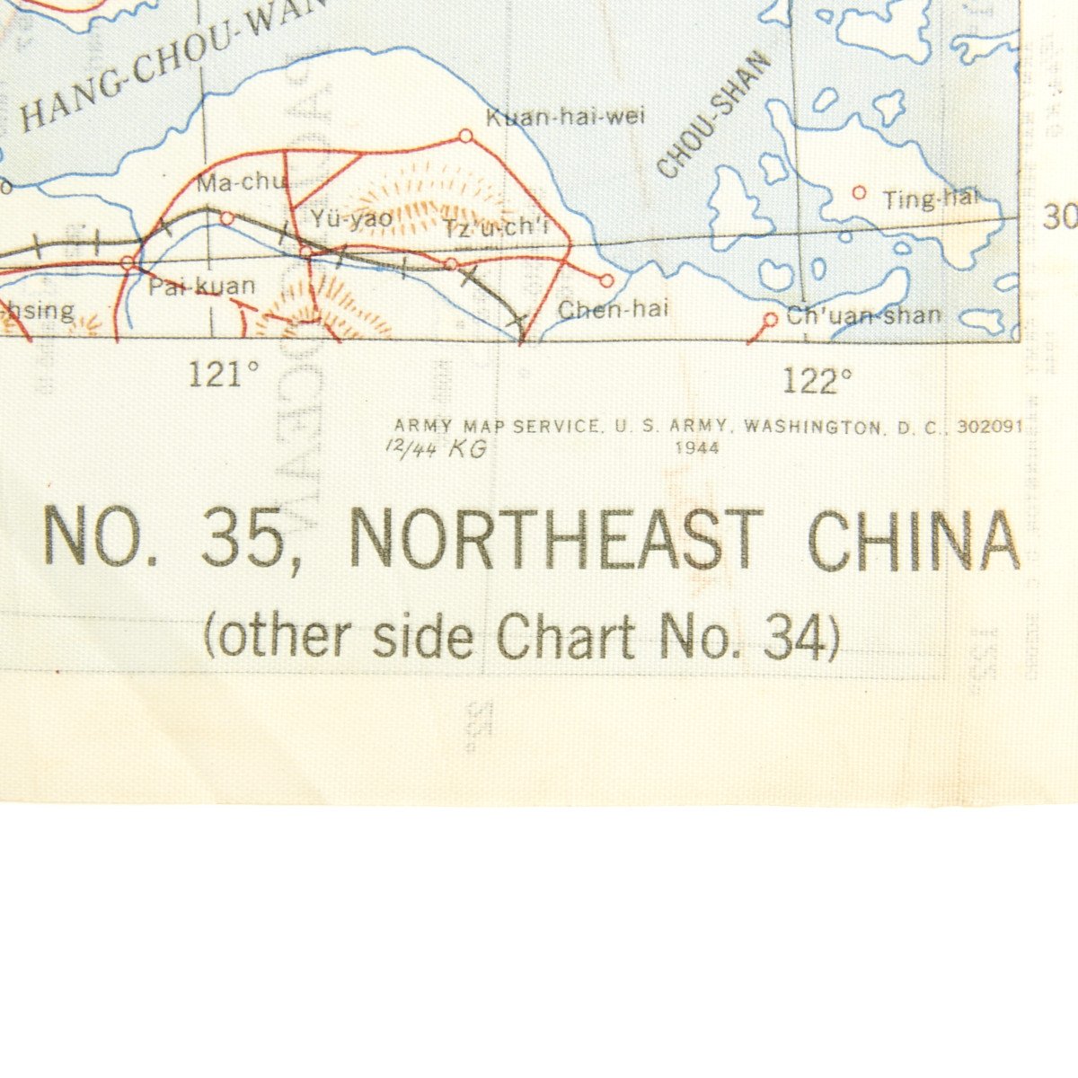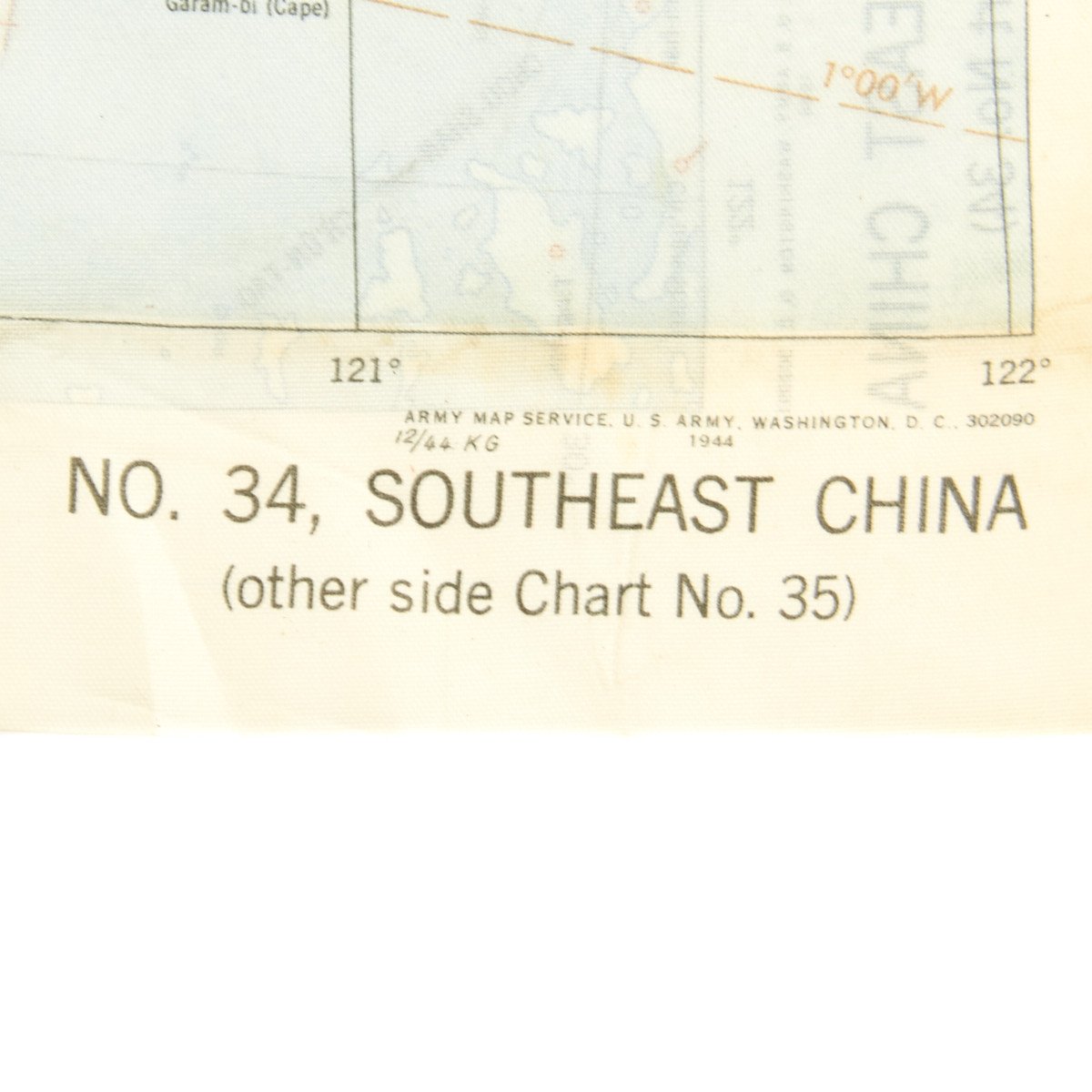 The second reads AAF CLOTH MAP - ASIATIC SERIES - at the top center and titled: NO. 34, SOUTHEAST CHINA the reverse reads B>NO. 35, NORTHEAST CHINA