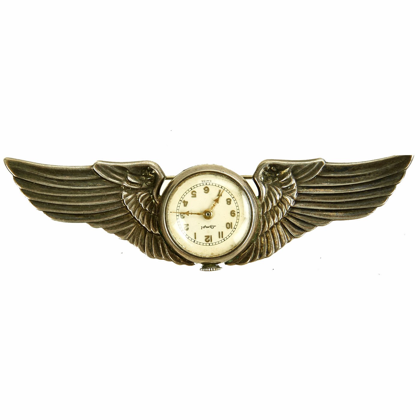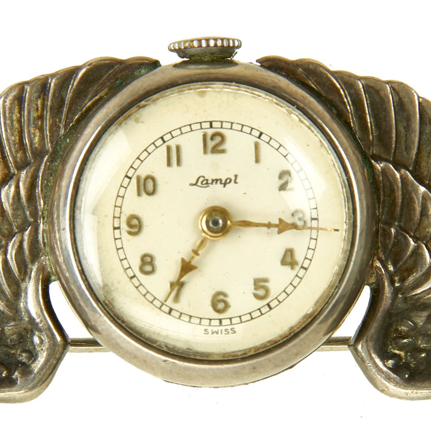 This set of fantastic wings in sterling silver with a large wingspan of 3 1/2", the style is undeniable that of Walter Lampl. Ingeniously inserted in to the center recess of the wing is a watch which is marked on the face LAMPL and SWISS. The watch face is mounted upside down. Why? So the wearer could affix the wings to their chest then turn the wings up and read the time. These wings were designed for doctors and nurses to wear while treating patients so they could take a pulse and tell the time for medications and other medically important tasks. This is a unique and ingenious design by one of the most respected and creative costume jewelry makers of the Wold War Two era!