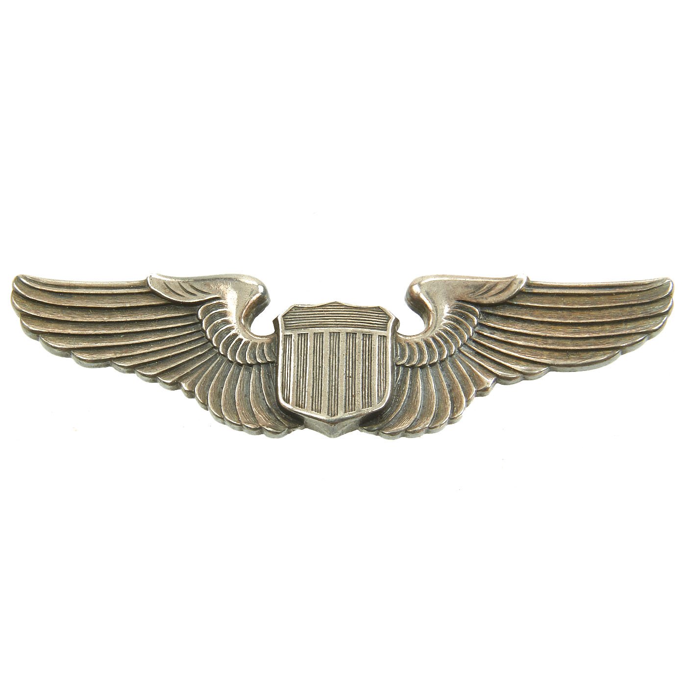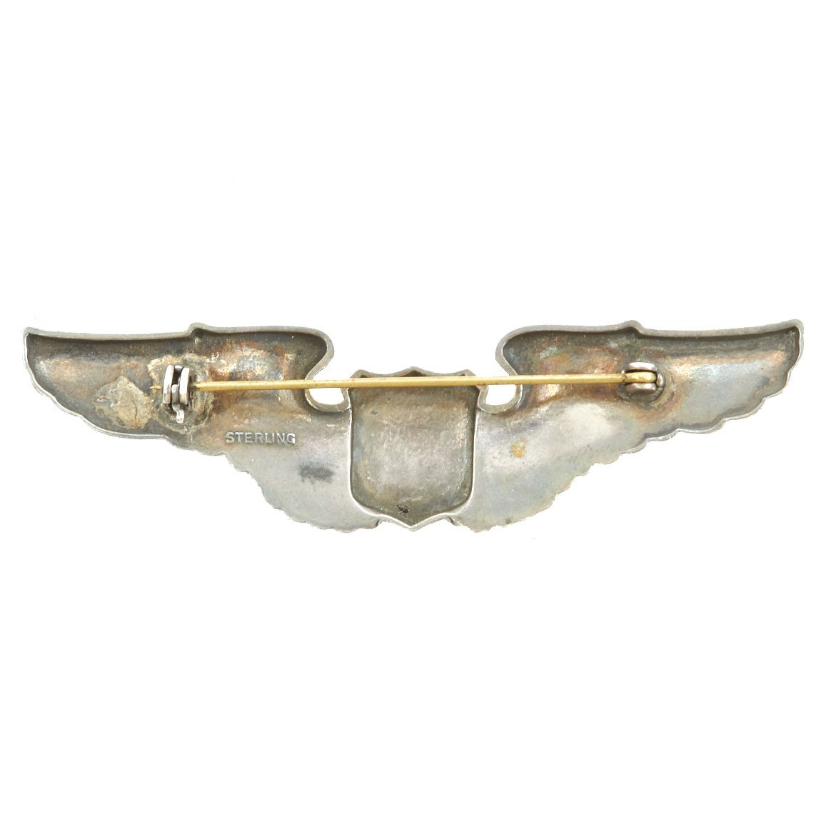 Anyone trained in flight operations was authorized to wear this badge, including pilots, bombardiers, navigators, flight engineers, radio men and gunners. The badge was also awarded to certain ground personnel at the discretion of their commanding officer. Non-crewmembers eligible for the badge were individuals with flying status such as aircraft maintenance supervisors and technical inspectors. These wings measure 3" across are marked STERLING on the reverse. Pin back (pin back, hook close, complete).