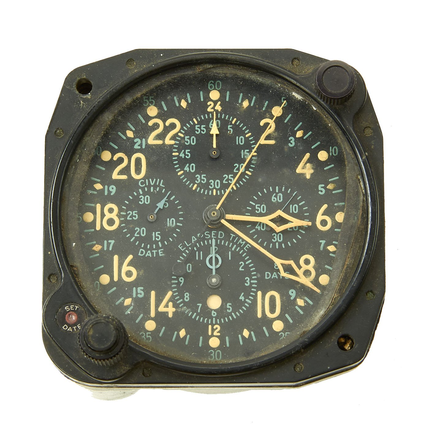 Original Item: Only One Available. This is a great example of the Elgin-Hamilton developed USAAF AN5741-1 8 Day clock, designed for Airships. These really are a marvel of Watchmaking design, featuring FIVE dials, the main 24 hour clock face, and 4 sub dials. These include a dial for the clocks seconds, a 32 day CIVIL DATE dial, a 12 hour dial for ELAPSED TIME, and a dial for 60 minutes or hours. Additionally, the clock also has a chronograph function, which is what some of the dials are for. All together this is an amazingly complicated and beautiful piece that shows the amazing engineering the U.S. was once capable of.