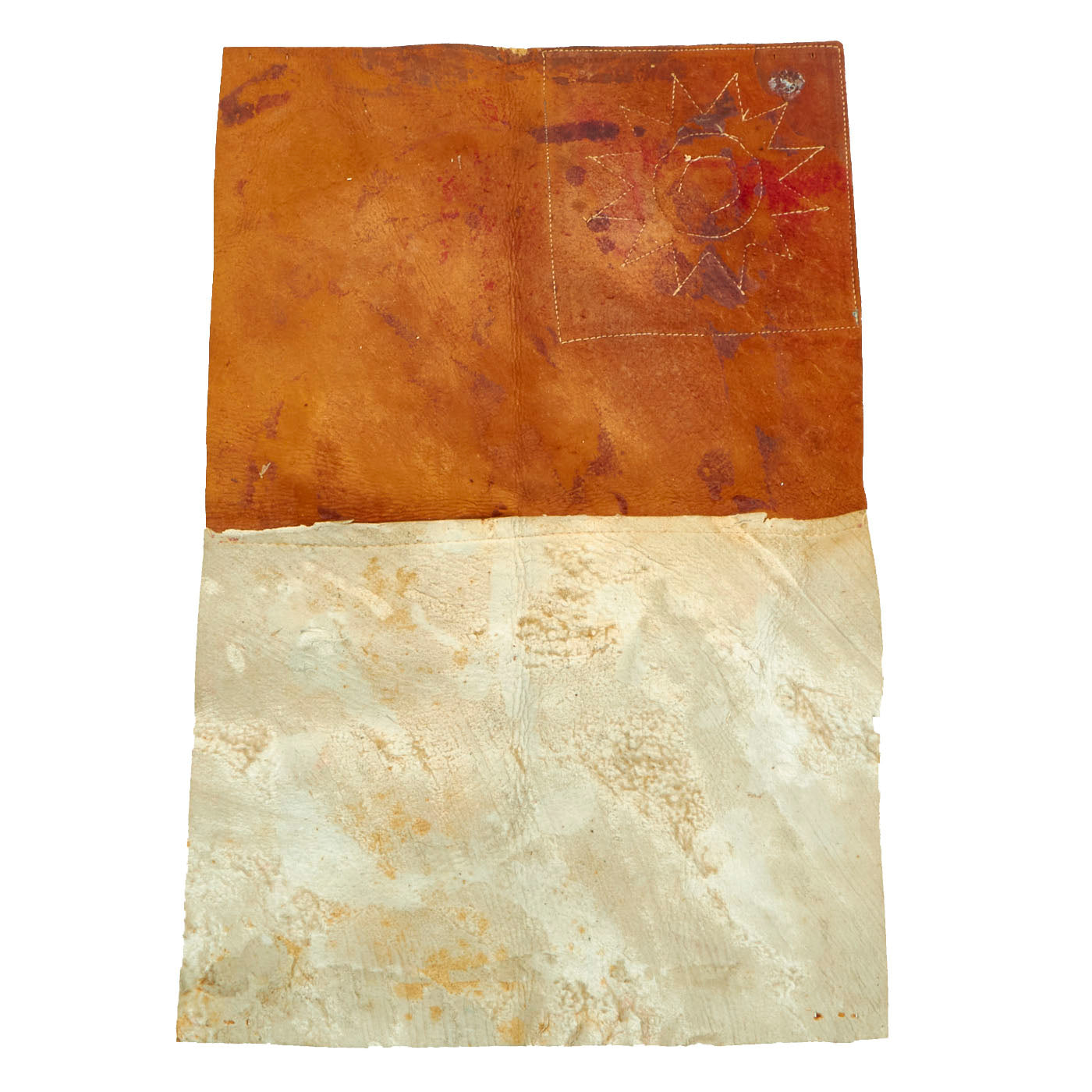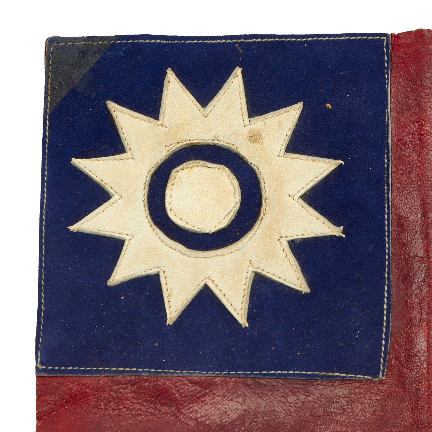 Original Item: Only One Available. This is a very lovely original leather blood shit. It bears a World War Two Chinese National Flag with Chinese Characters at the bottom painted. Every aspect of this chit is constructed out of separate pieces of leather except for the handwriting. Measures 7 3/4"W x 11 1/2"H.