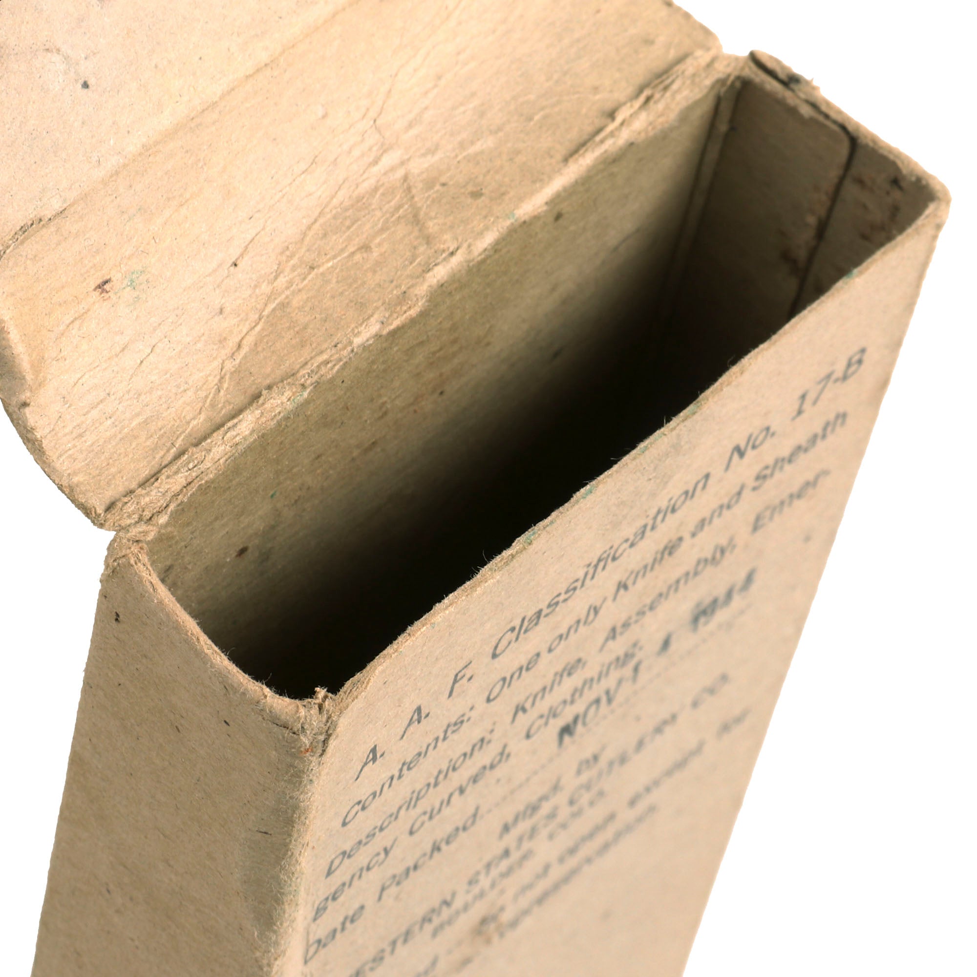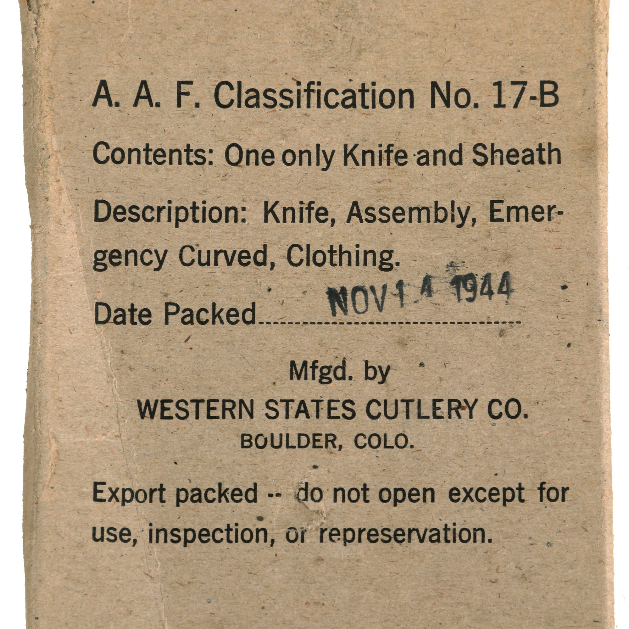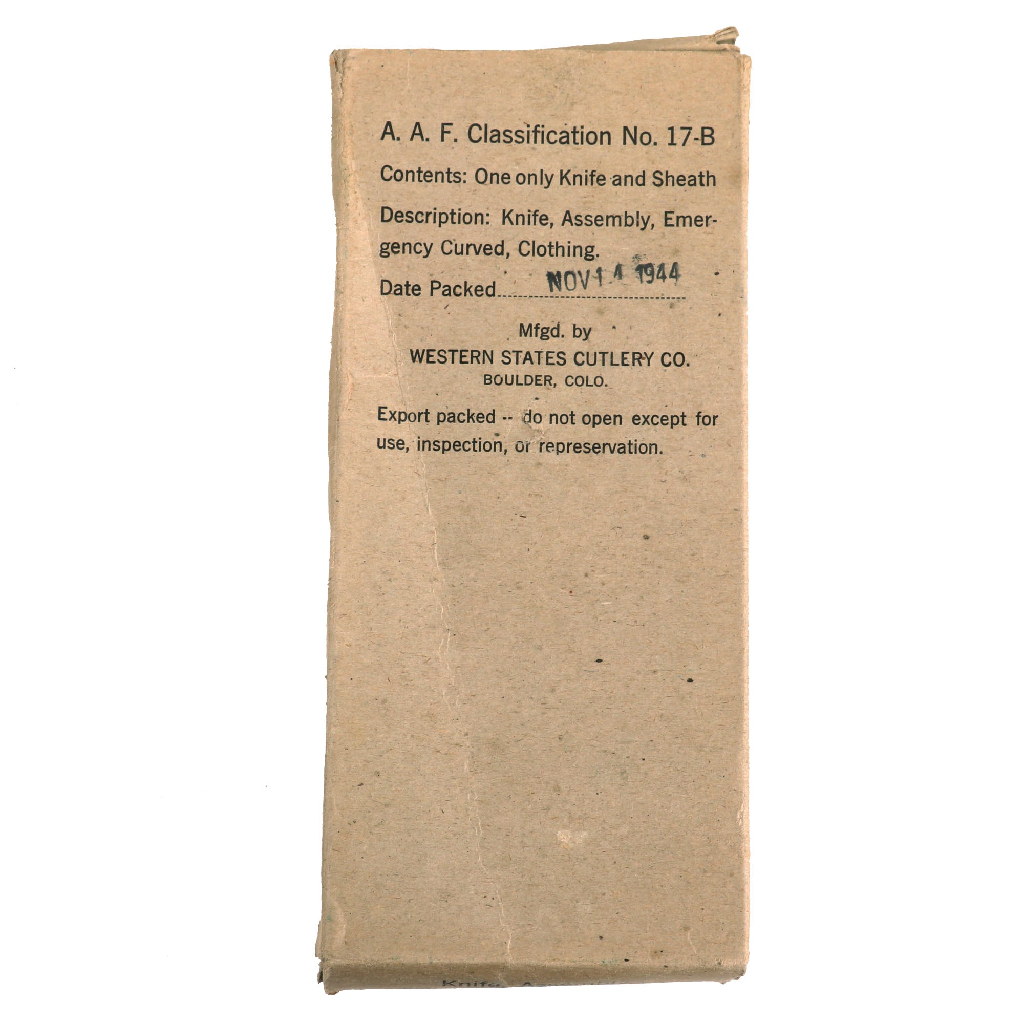 -A.A.F. Classification No.17-B Knife, Assembly, Emergency Curved, Clothing, with its original sheath and box. The yellow of the wood is still as perfect as the day it was painted, and the leather sheath barely fits it due to having been stored apart for so many years. Measures roughly 6” and is connected to sheath via rope.
