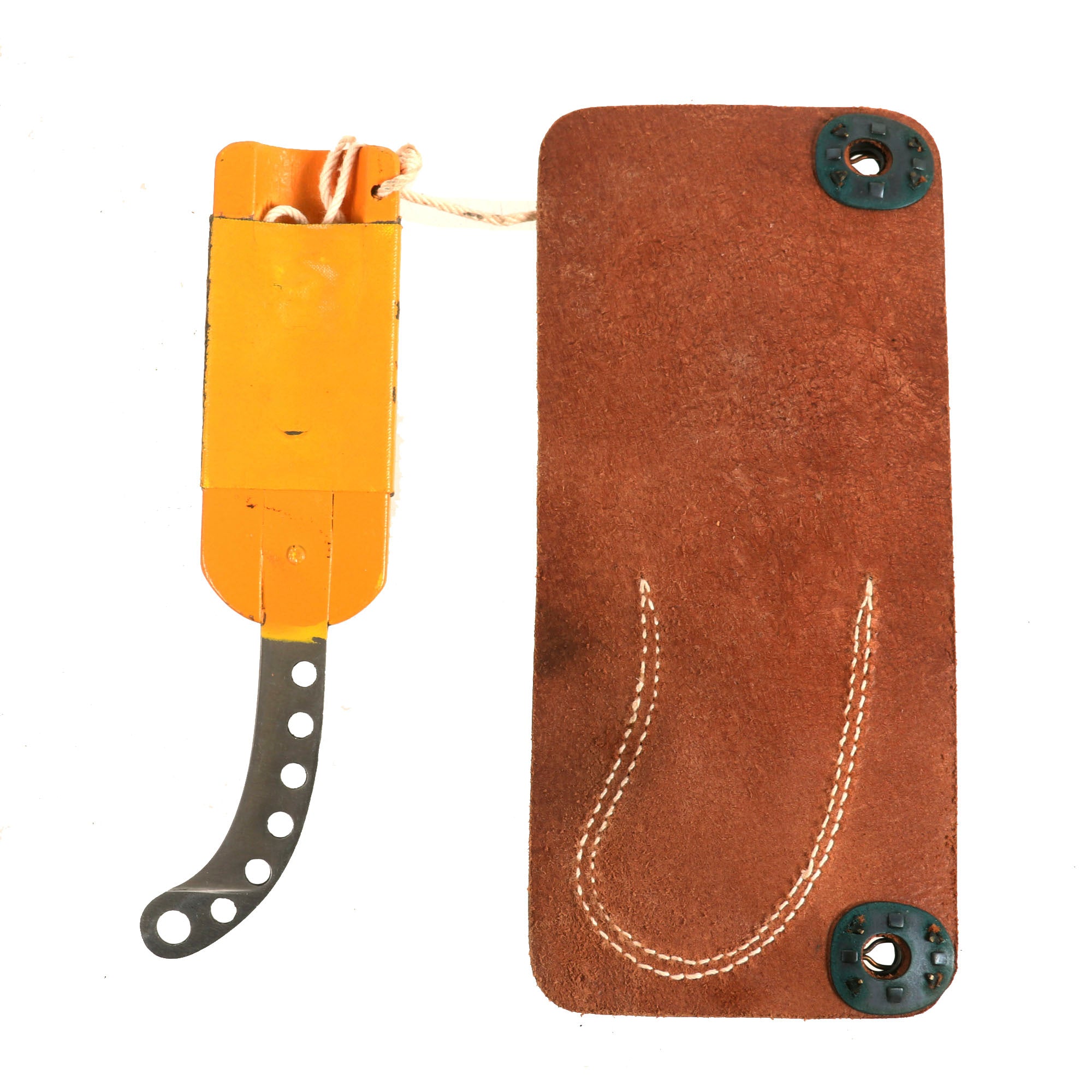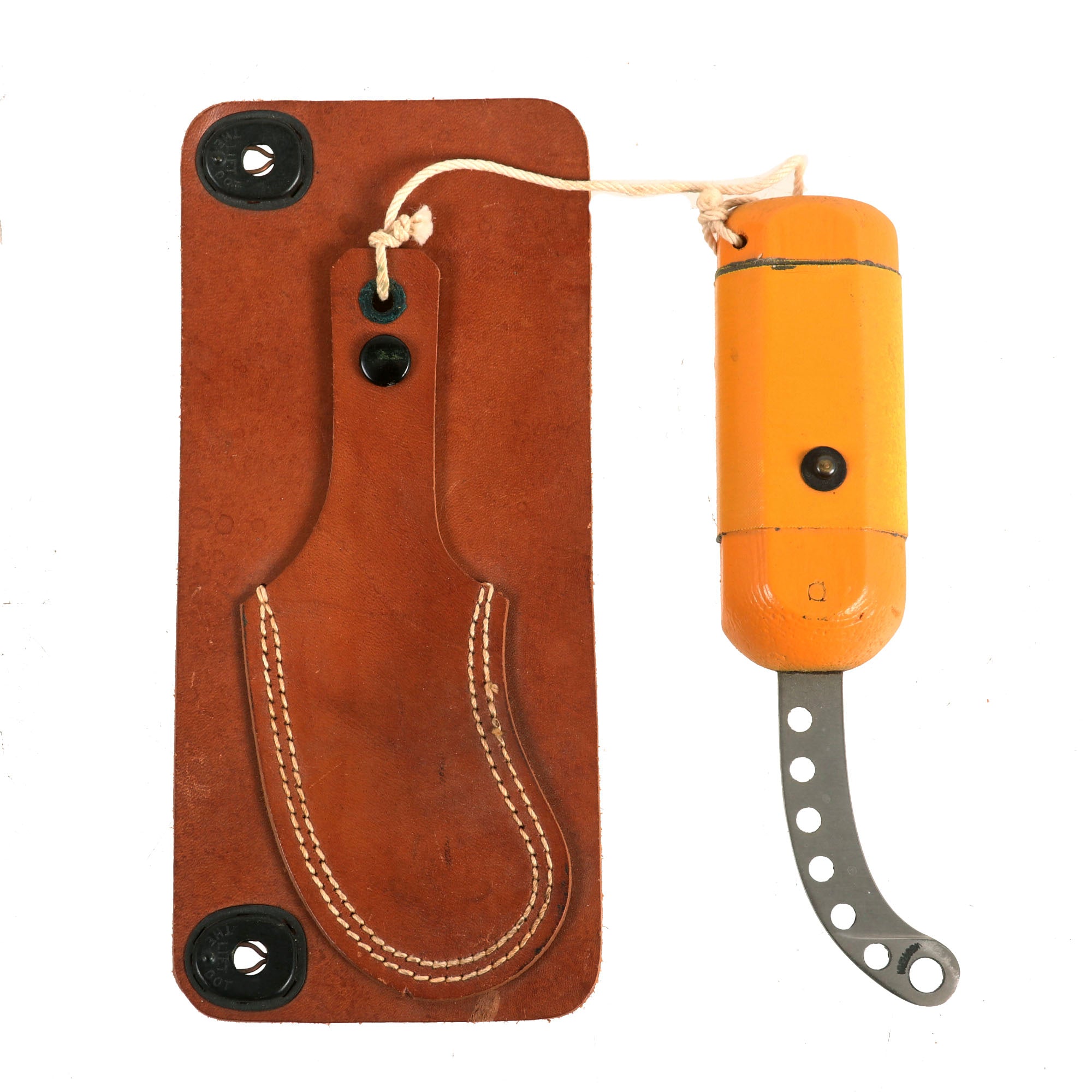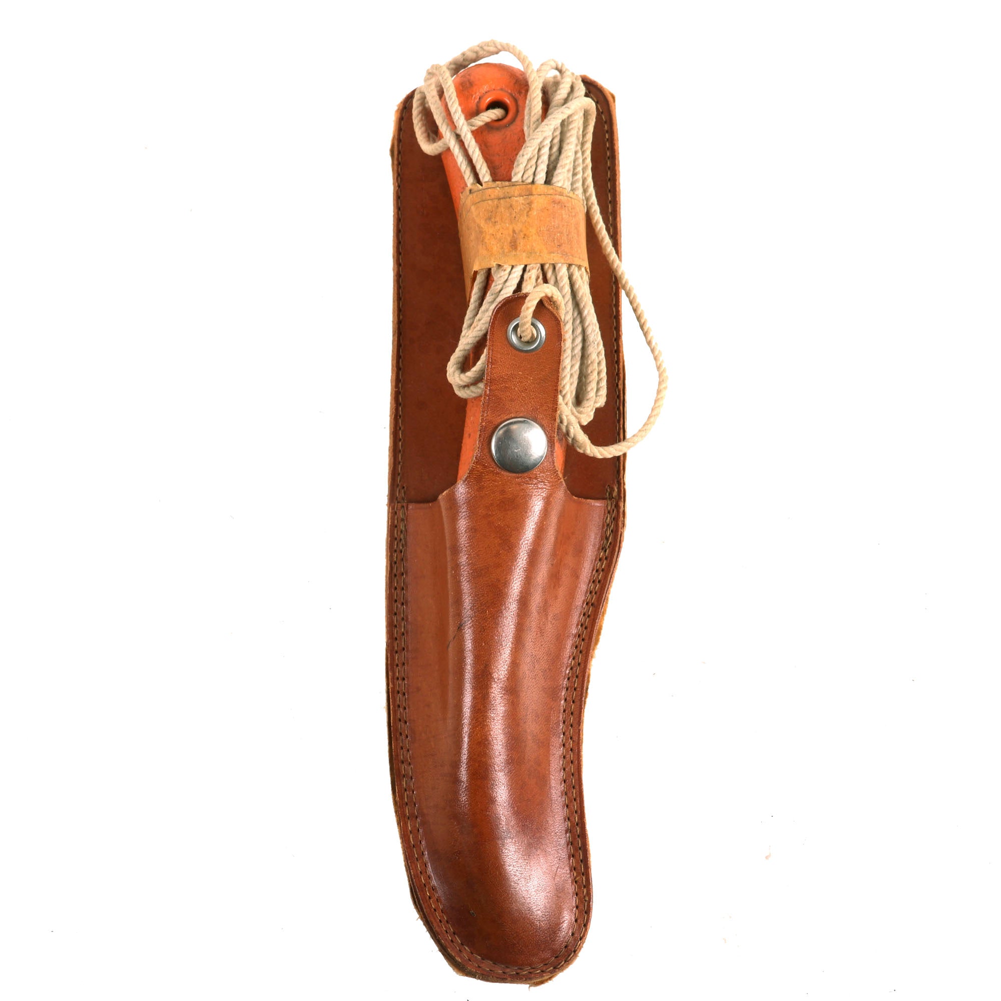 -A.A.F. Classification No.17-B Knife, Assembly, Emergency Curved, Clothing, with its original sheath and box. The yellow of the wood is still as perfect as the day it was painted, and the leather sheath barely fits it due to having been stored apart for so many years. Measures roughly 6” and is connected to sheath via rope.