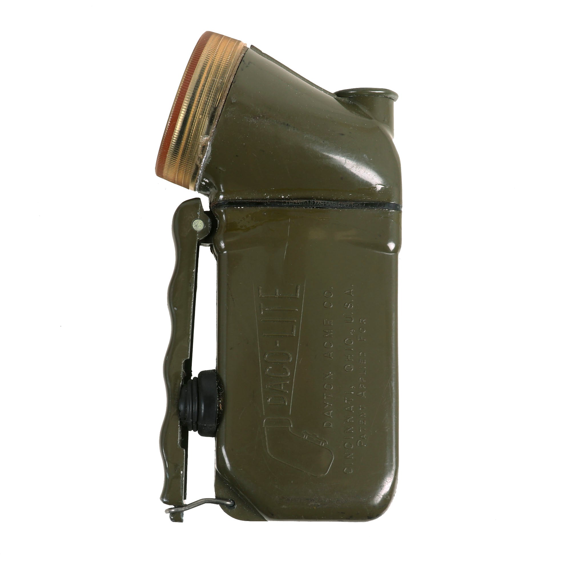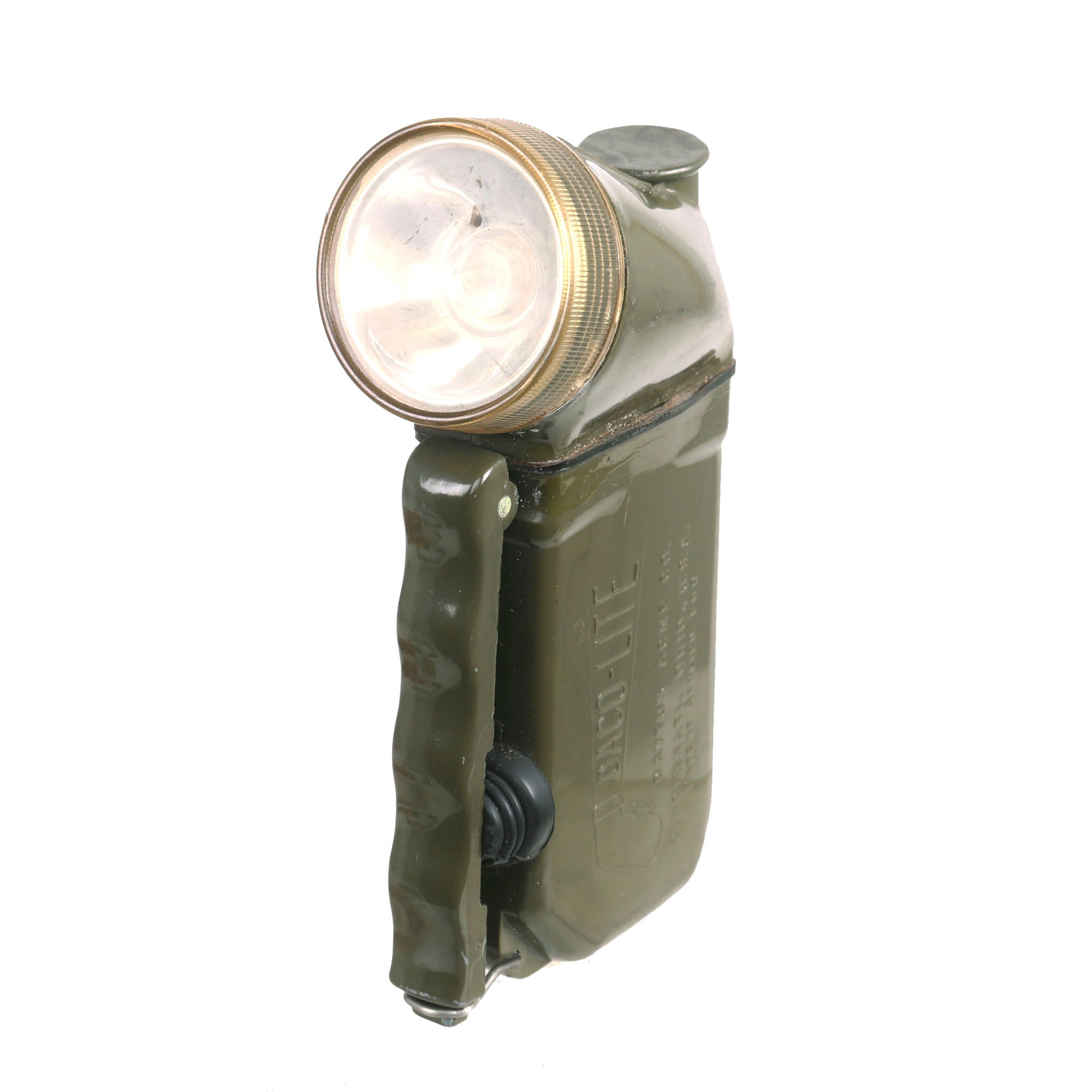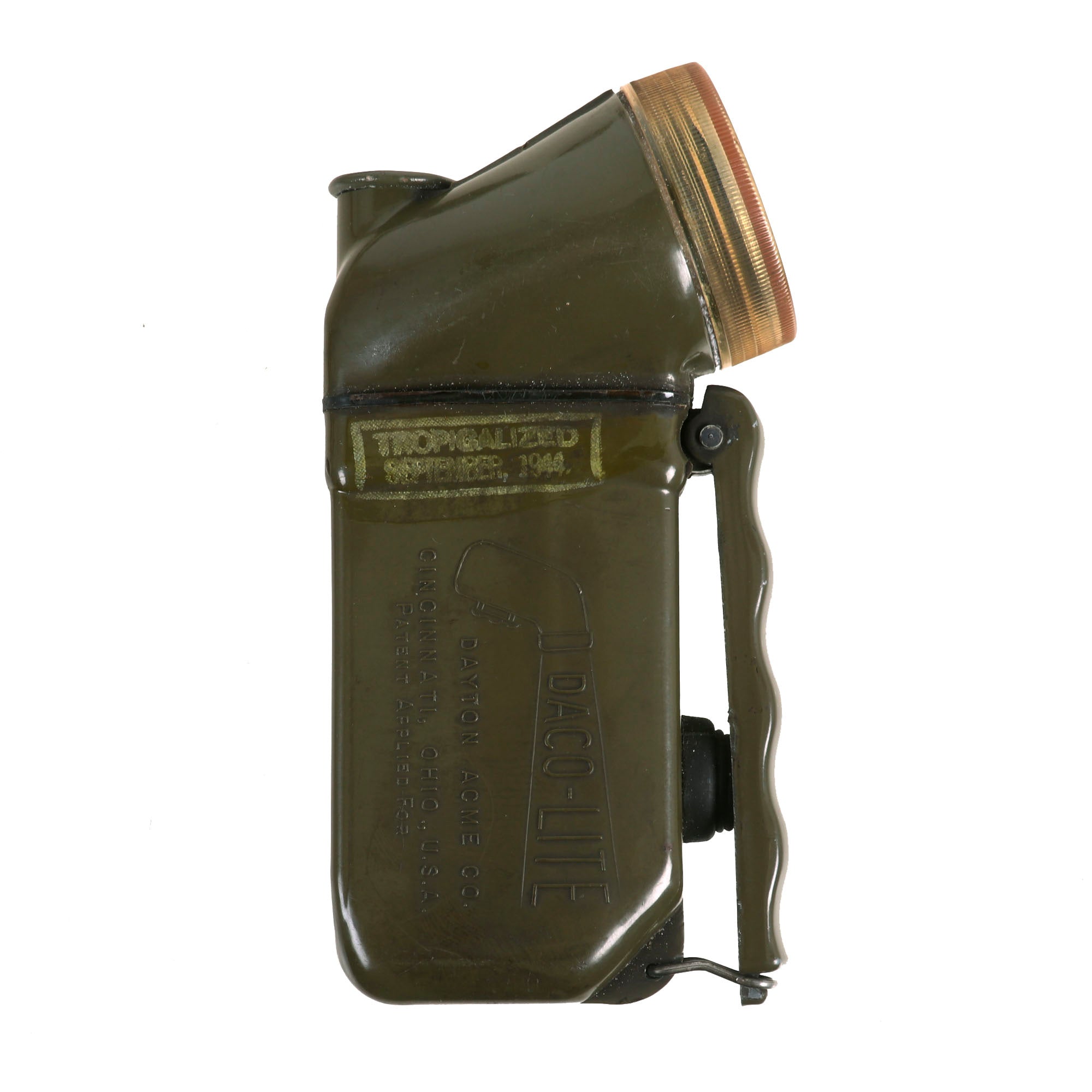 -Tropicalized DACO-LITE Hand-Crank Flashlight, made by Dayton Acme Co. in Cincinnati, Ohio. Stamped and dated TROPICALIZED SEPTEMBER, 1944. PROPERTY AIR FORCES, U.S. ARMY. Has a spare bulb behind the light. When the metal tab is released, you can push down on the handle to light the bulb. Still functions!