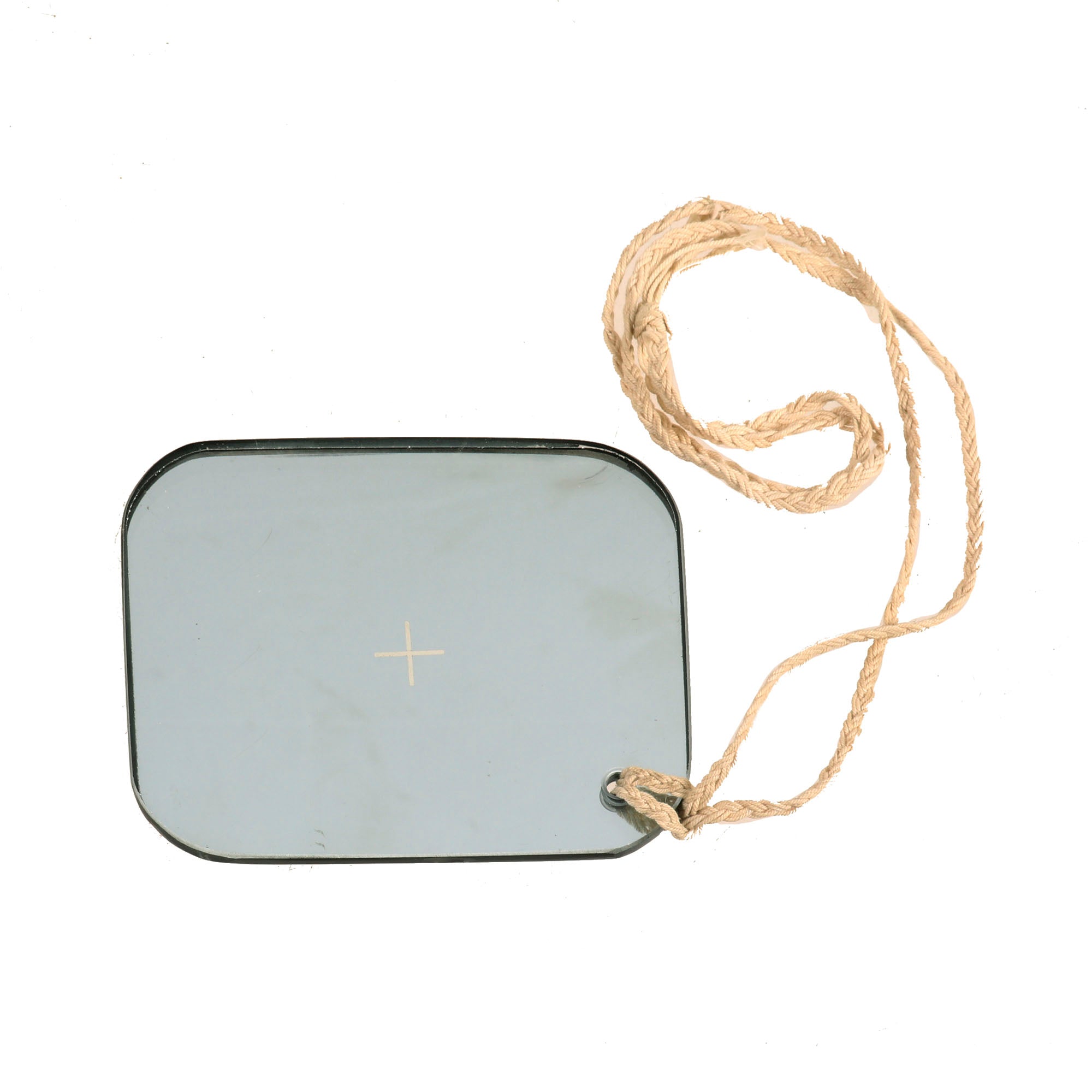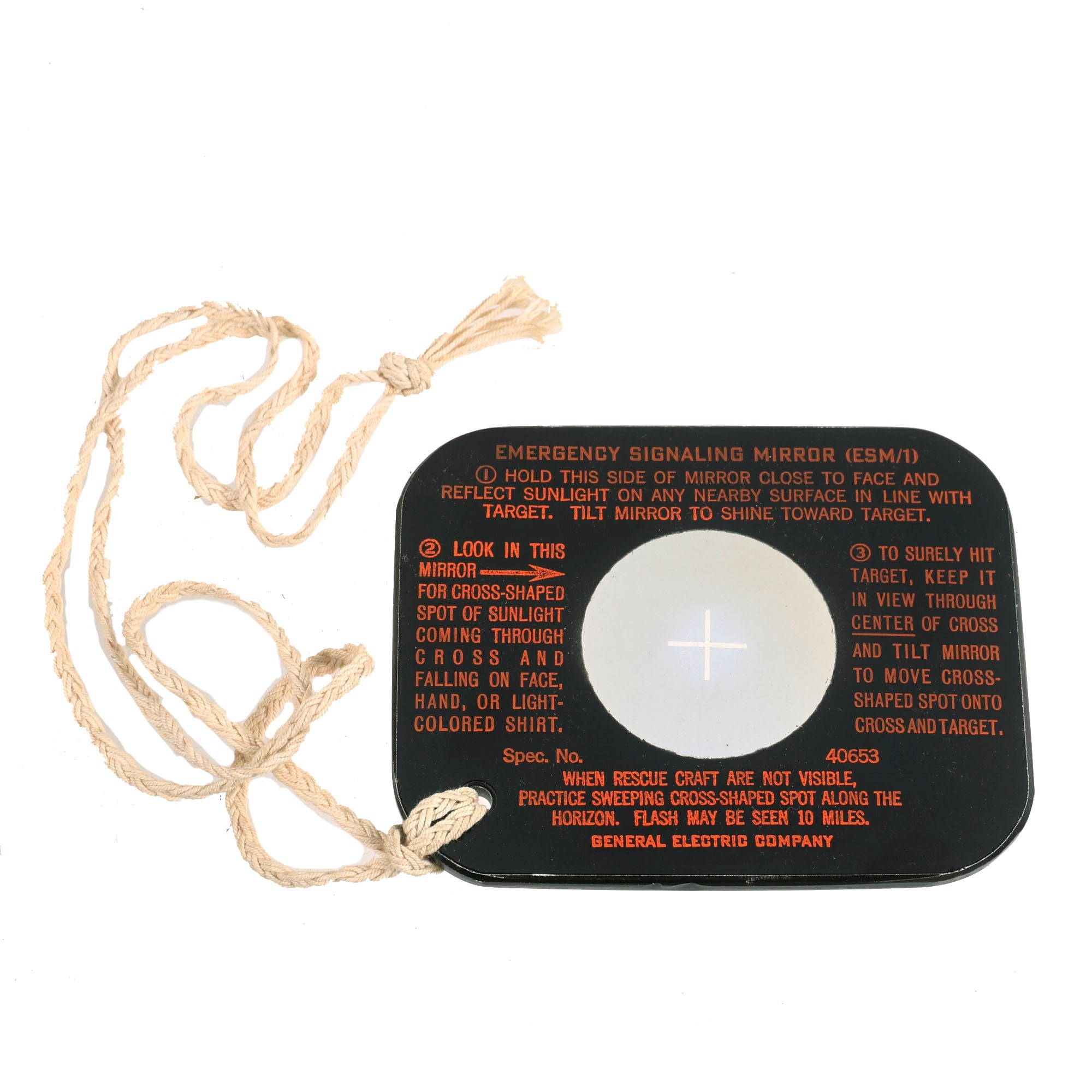-Emergency Signaling Mirror (ESM/1). Double sided mirror for signaling rescue ships or planes, attached to woven rope. Spec. No. 40653. In great unissued condition, made by the General Electric Company.
