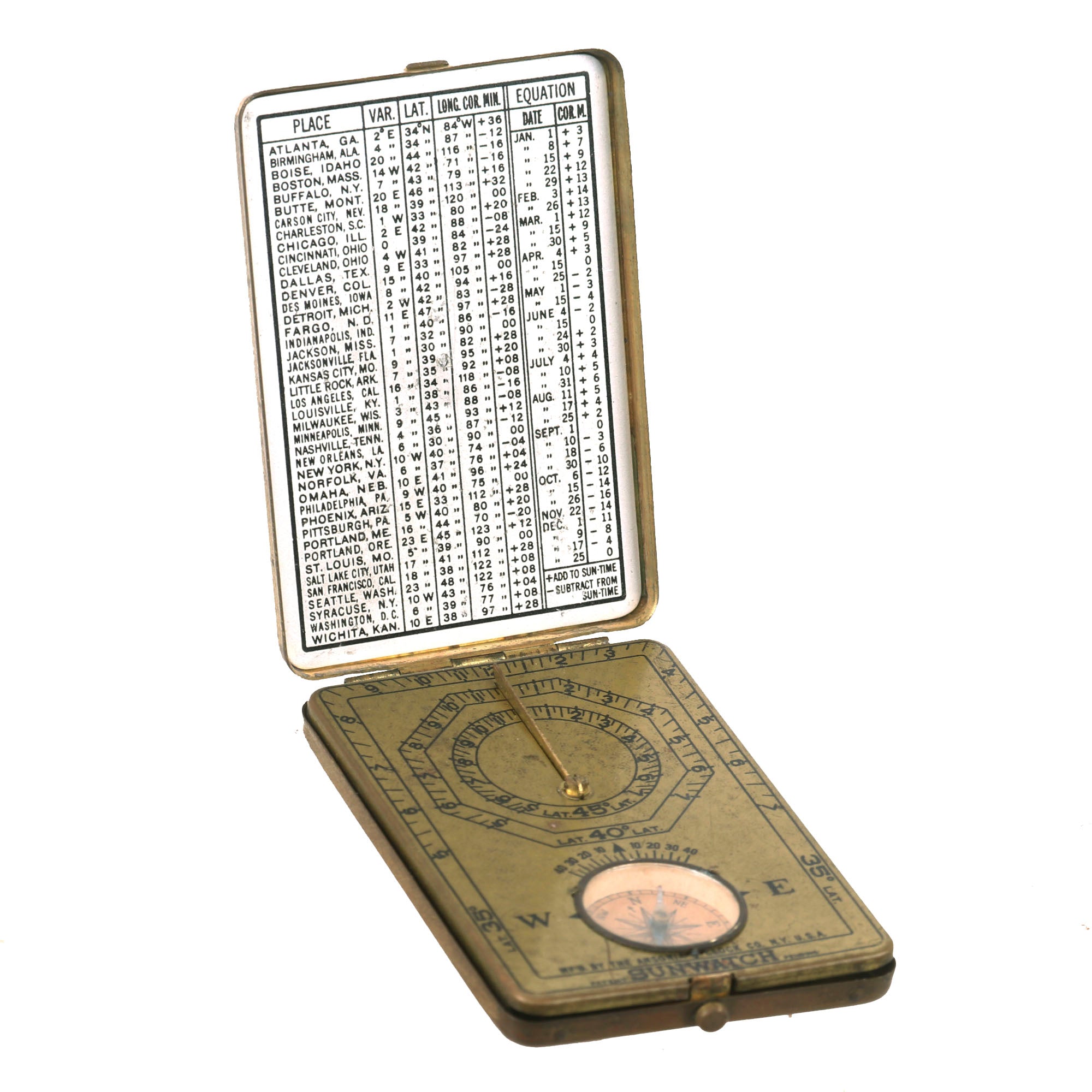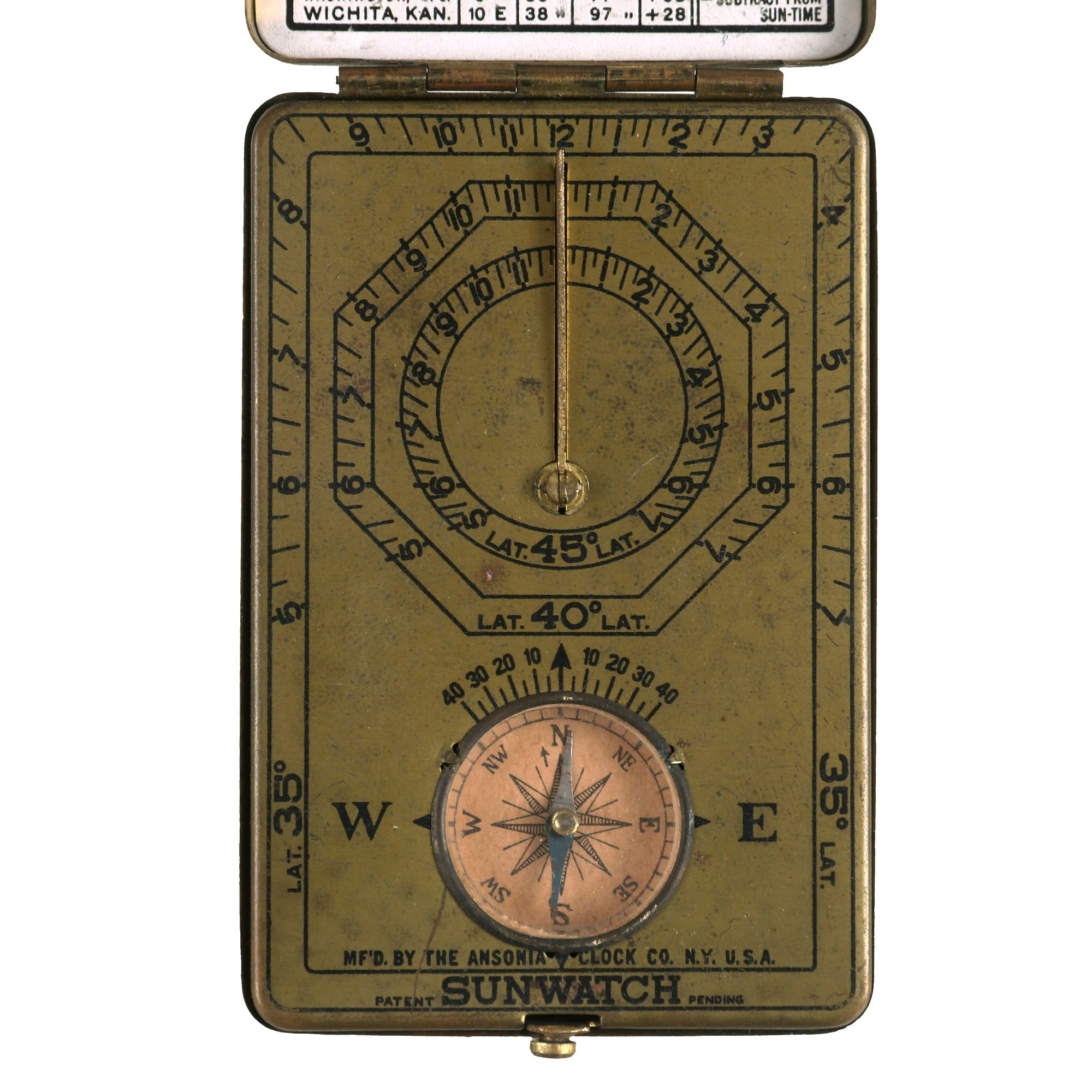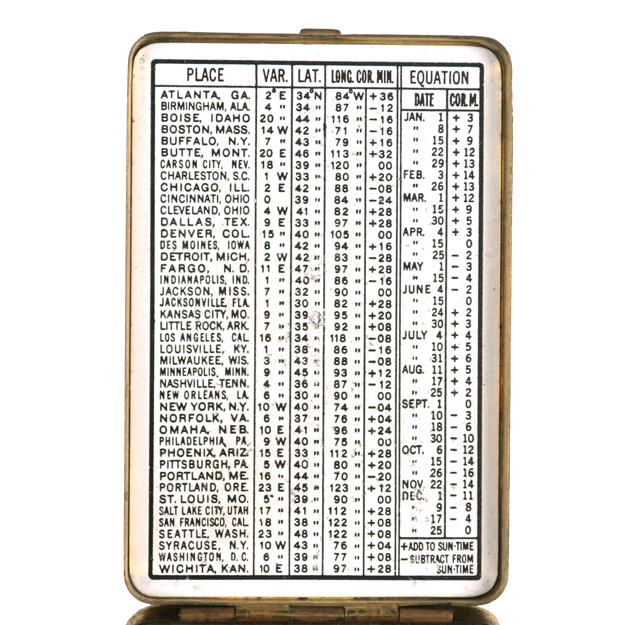 -Sunwatch case with compass and list of places with associated variation, latitude, longitude, and equations. Manufactured by Ansonia Clock Company, N.Y. Measures 3 x 1⅞”.