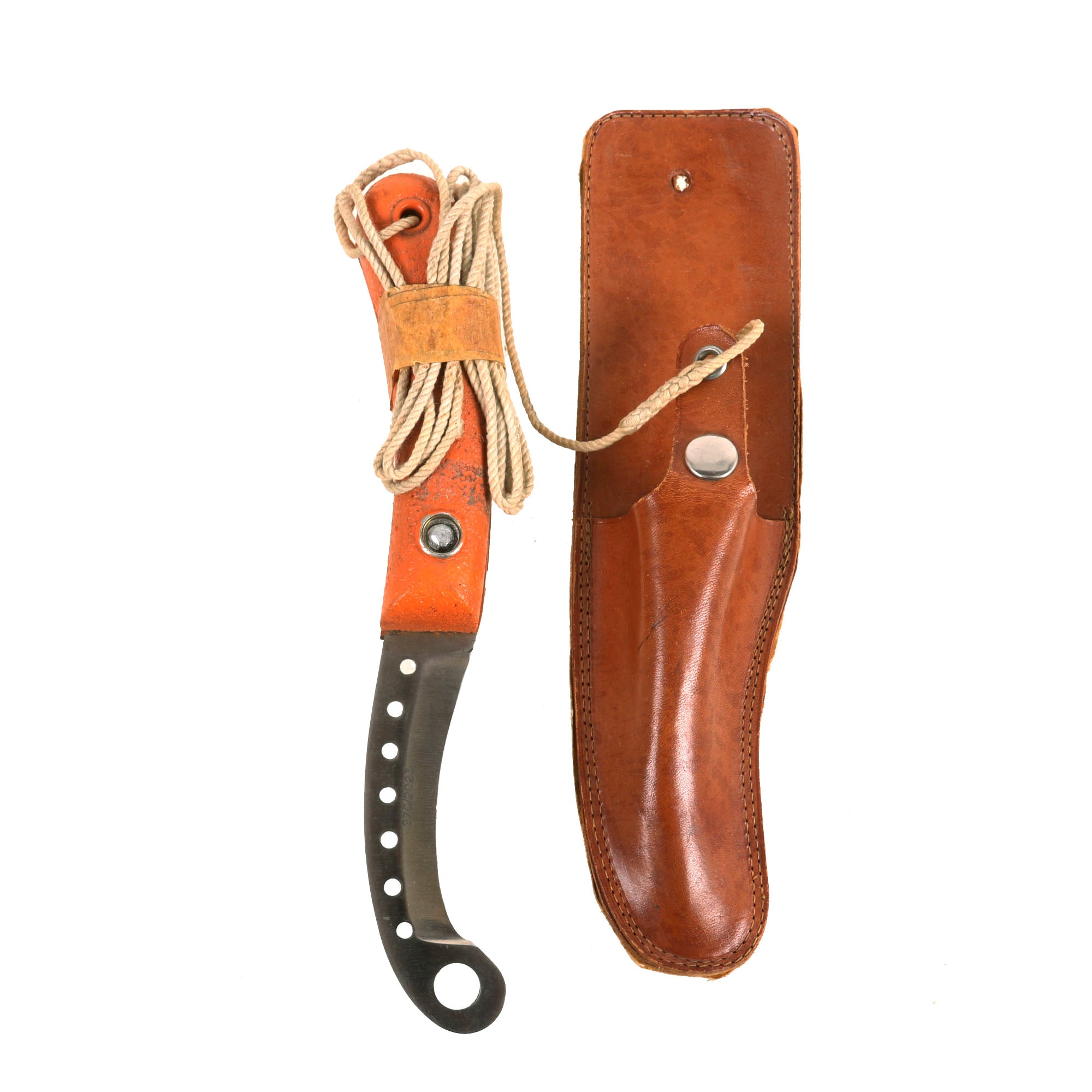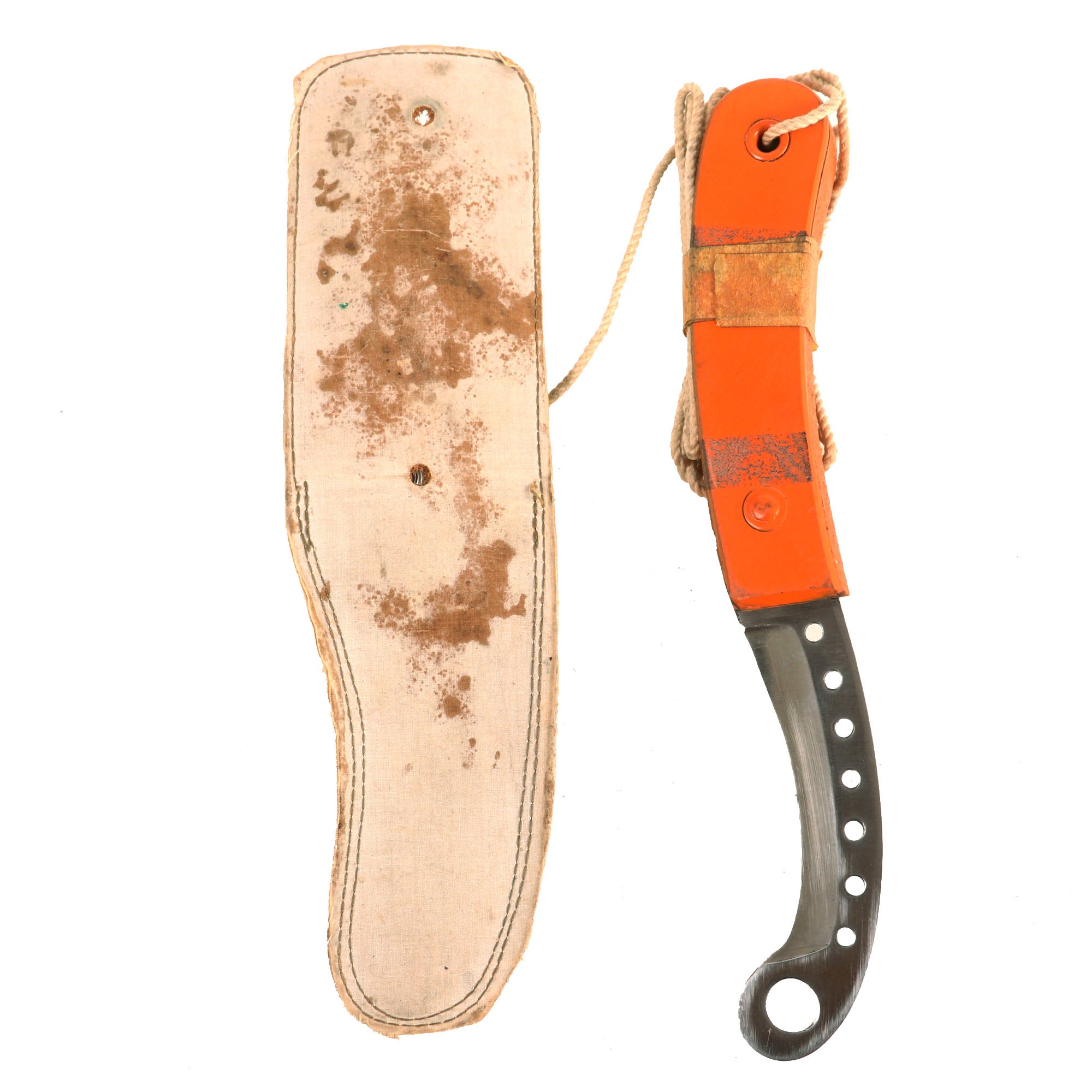 -27C/2023 Emergency Curved Knife with original sheath. It is connected to the sheath with a rope that is still taped around the handle of the knife with its original packing tape. Good shape overall. Measures roughly 9¾” long.