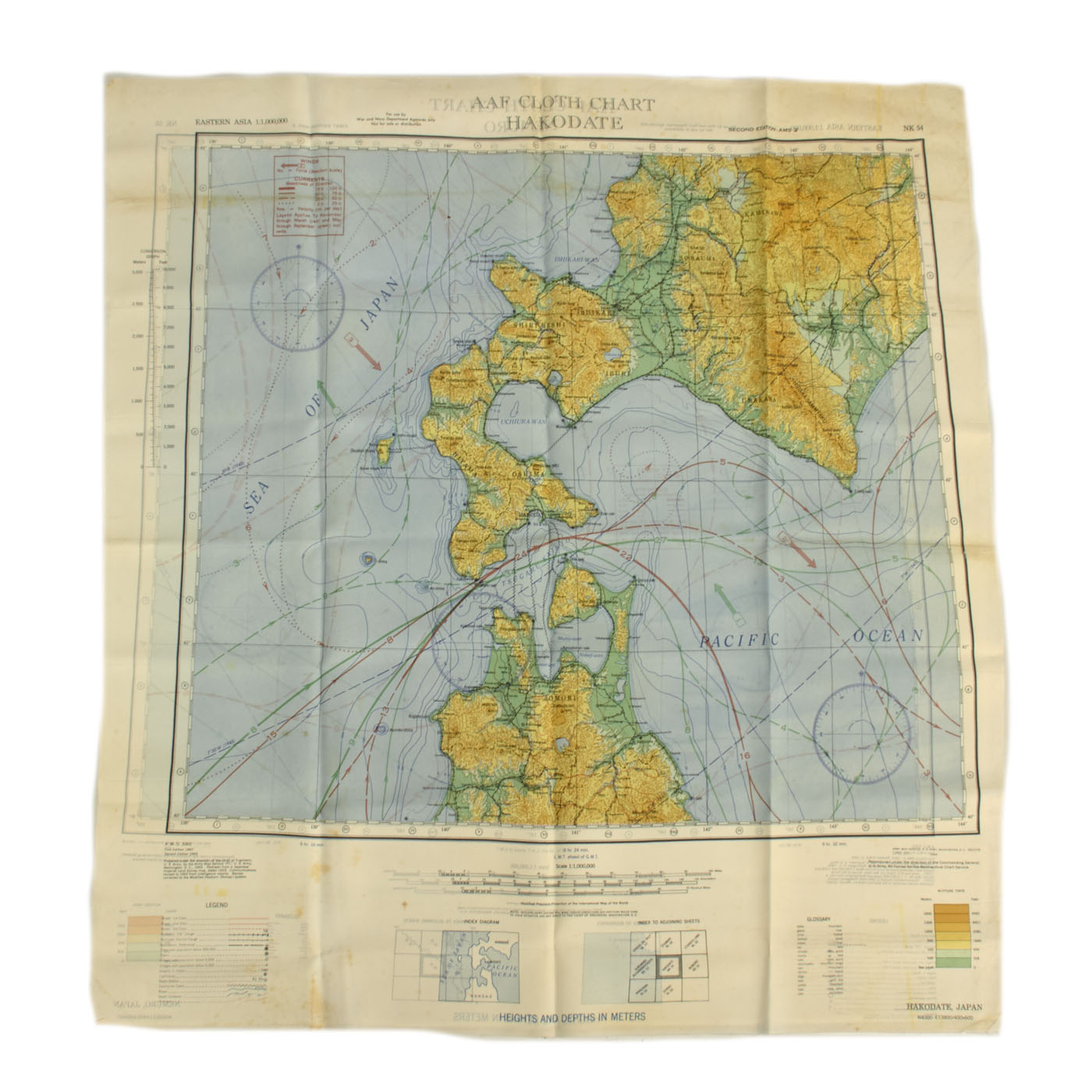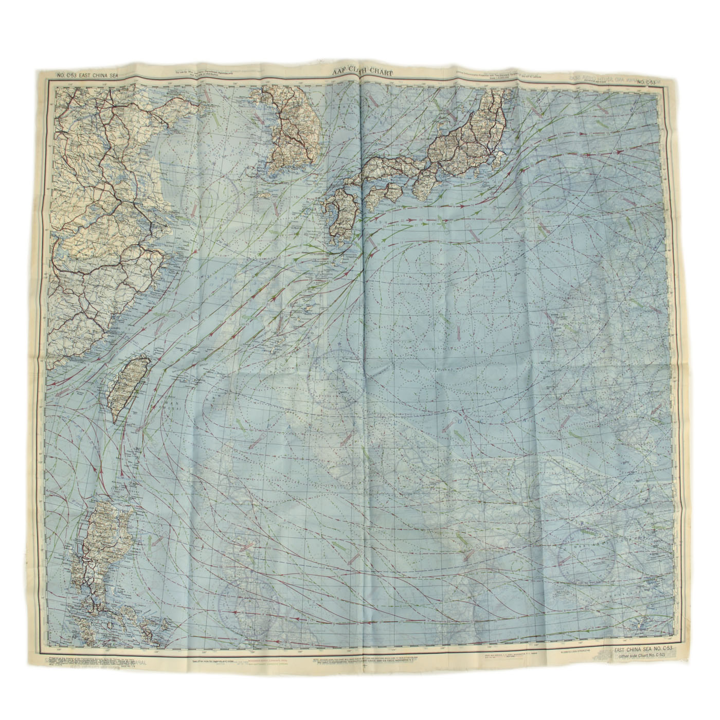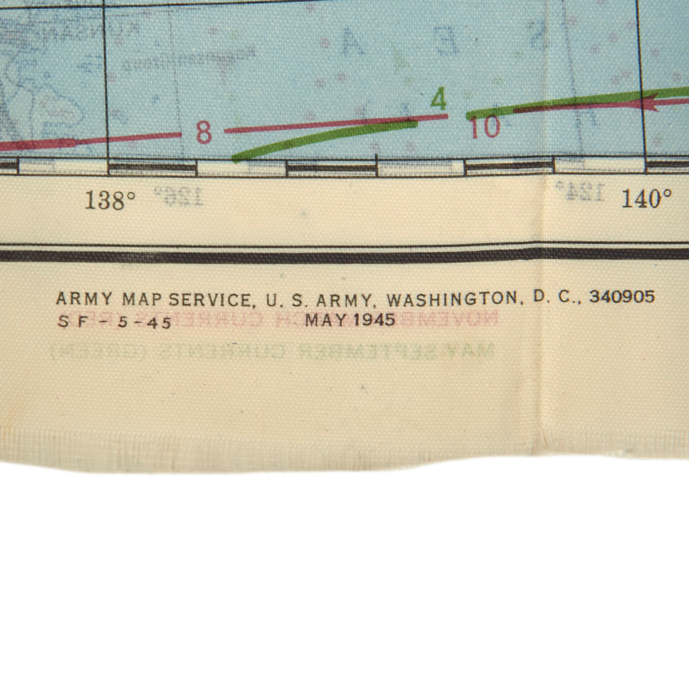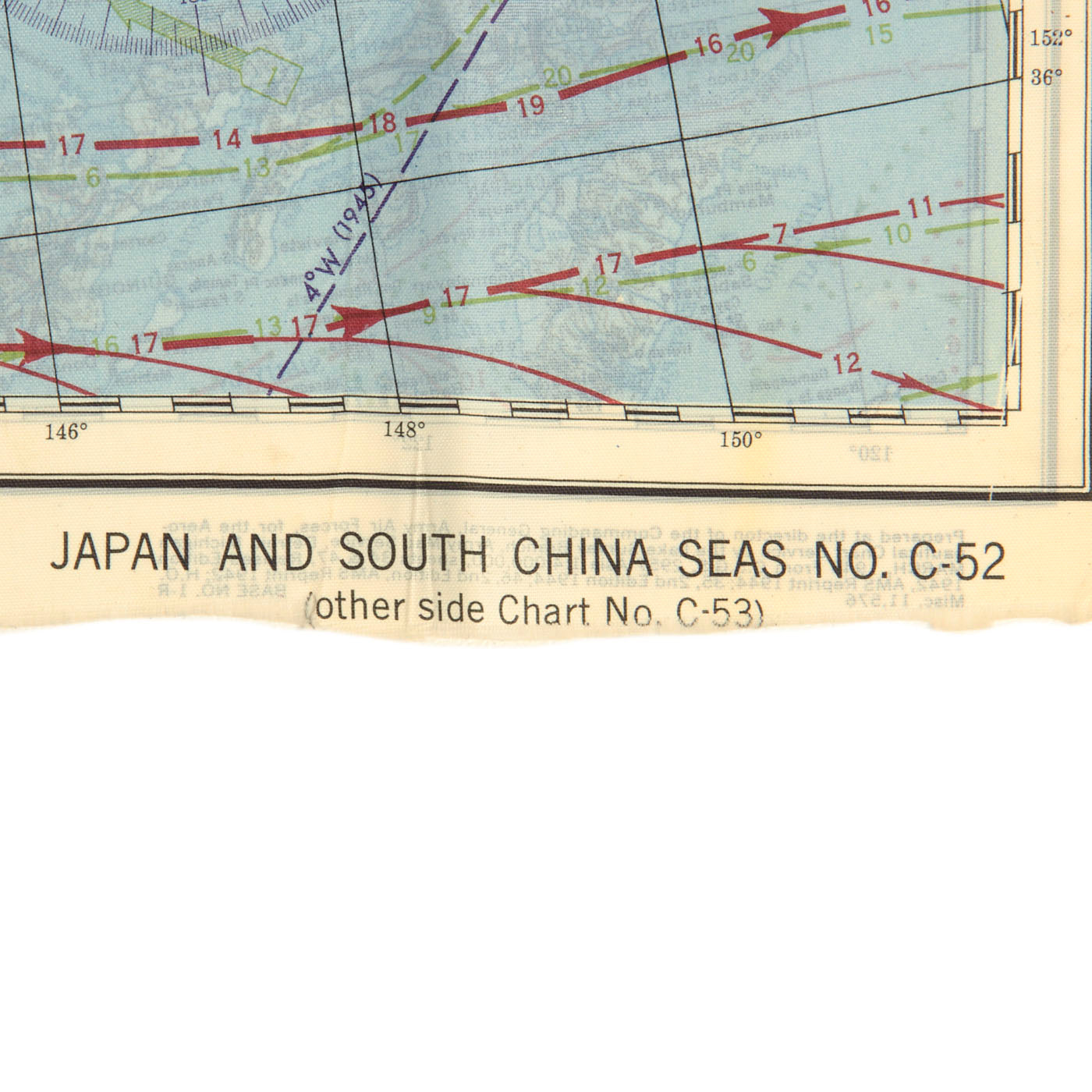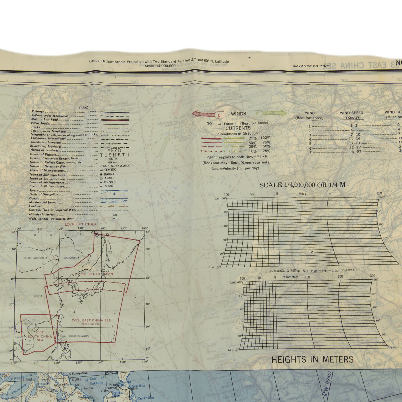 - Japan and South China Seas/East China Sea: The map measures 32 ½” x 29 ½” and is dated 1945. The scale is 1:4,000,000 and shows flight and taxi paths for aircraft both above the sea as well as land. The map is slightly used and the edges are frayed but it is still very serviceable and can be easily read.
