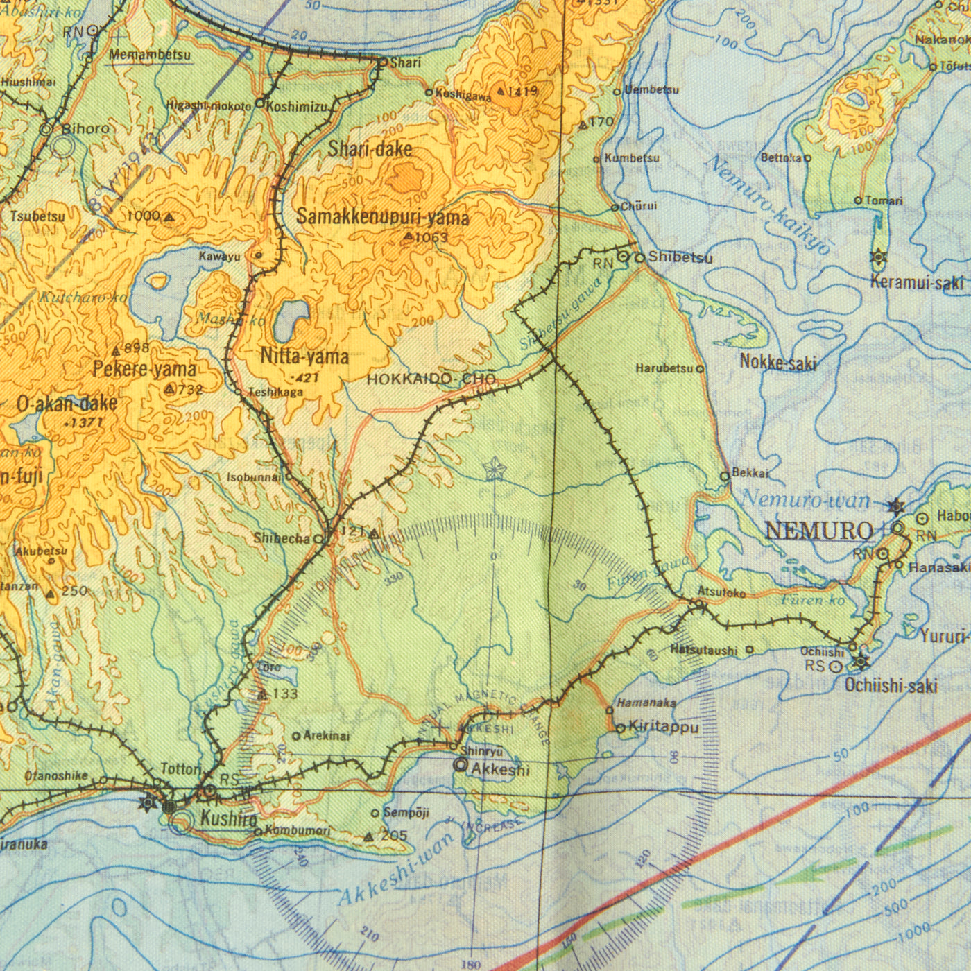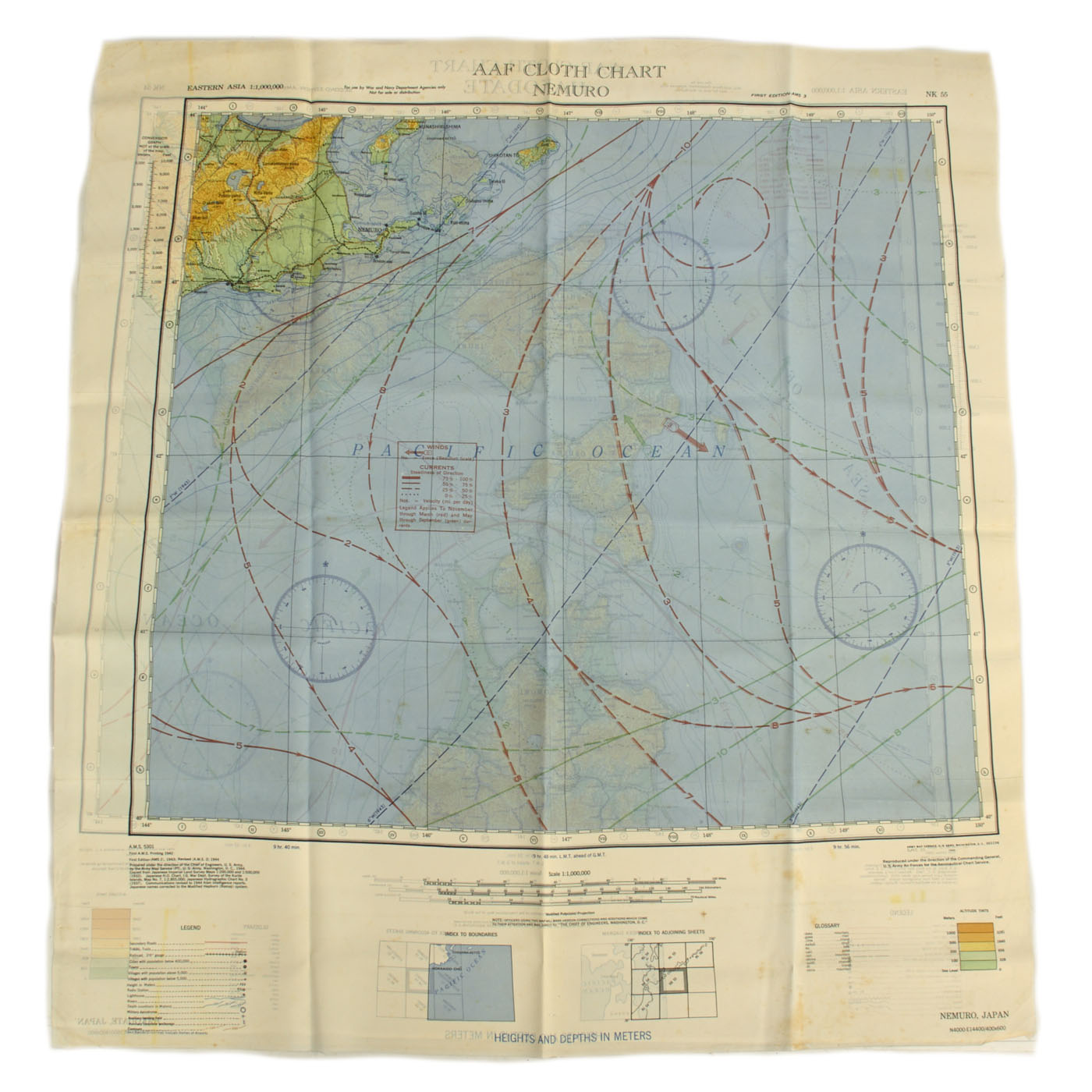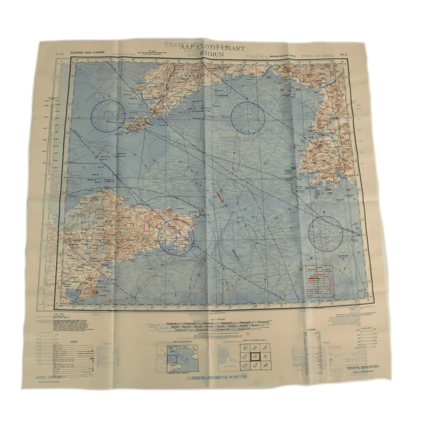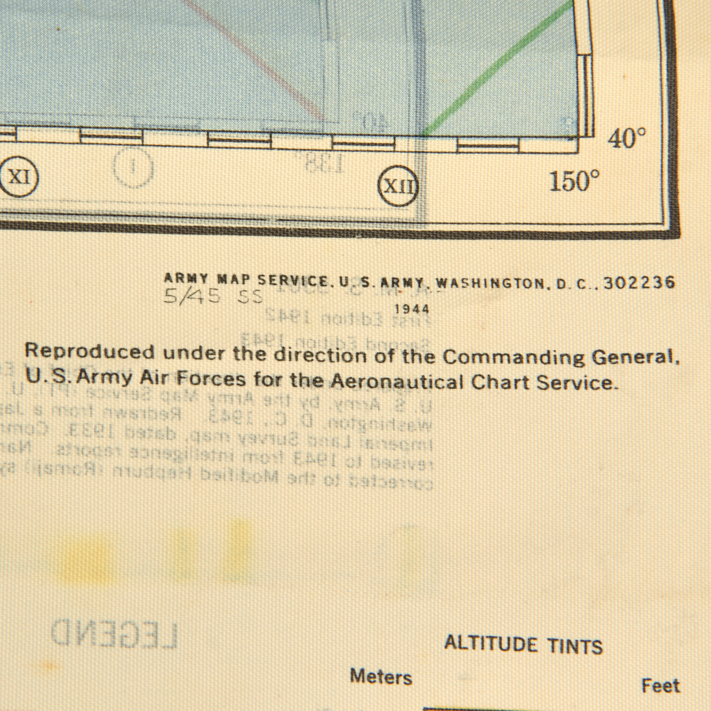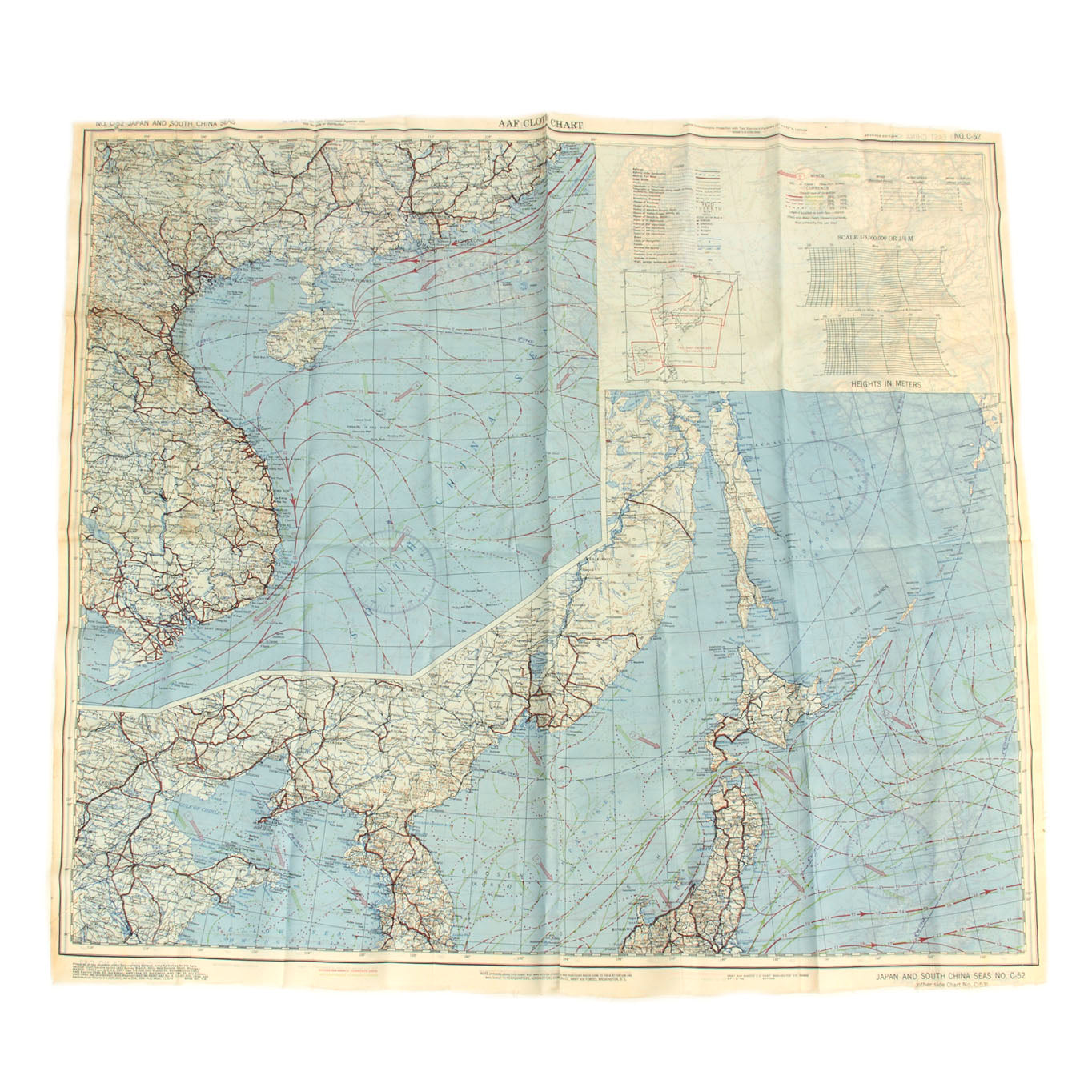 - Japan and South China Seas/East China Sea: The map measures 32 ½” x 29 ½” and is dated 1945. The scale is 1:4,000,000 and shows flight and taxi paths for aircraft both above the sea as well as land. The map is slightly used and the edges are frayed but it is still very serviceable and can be easily read.
