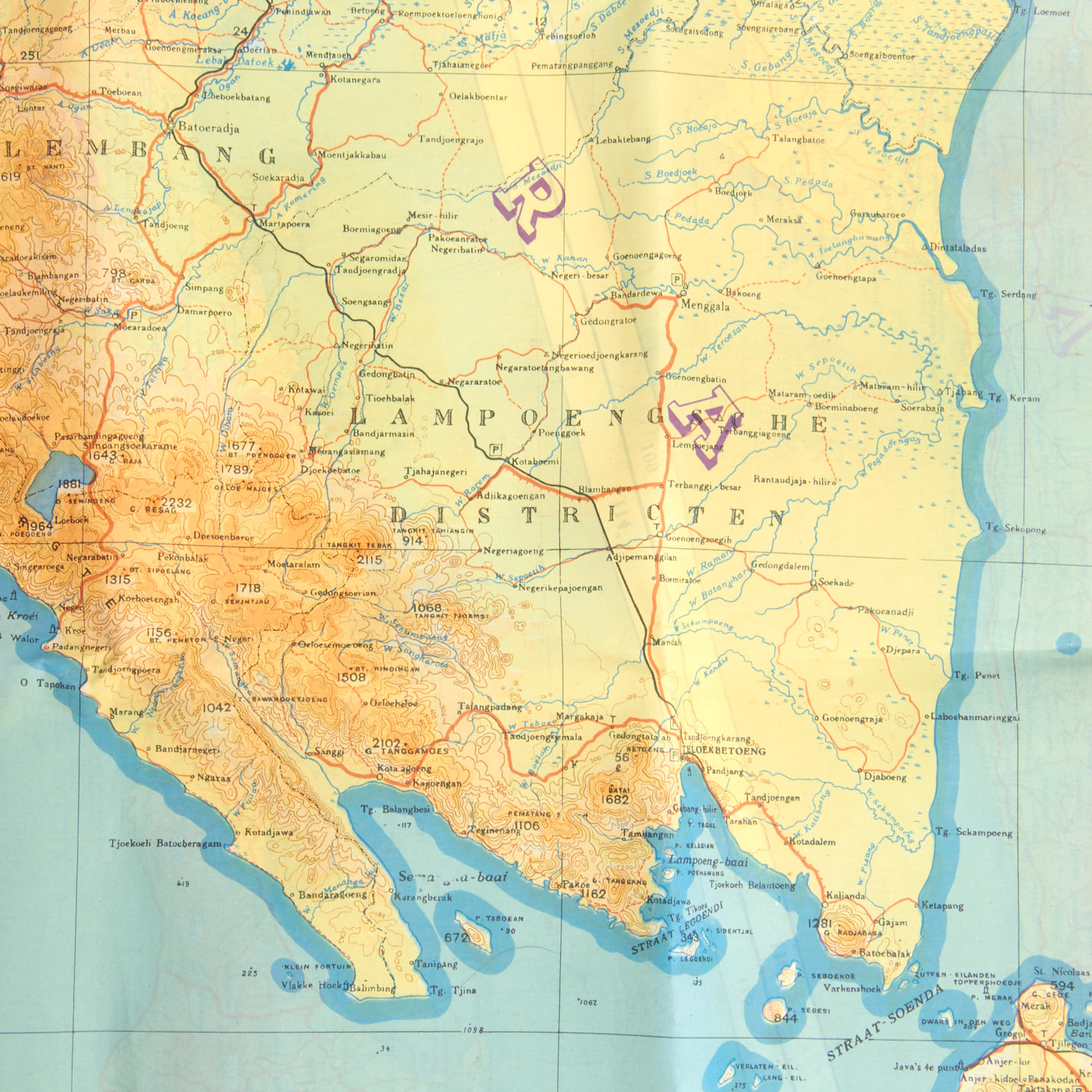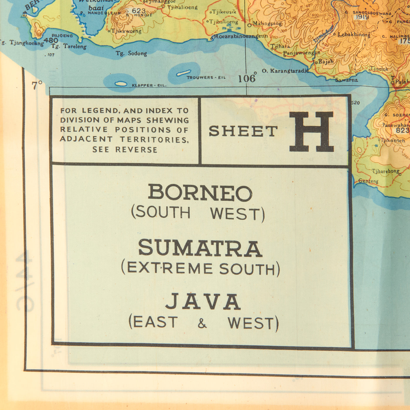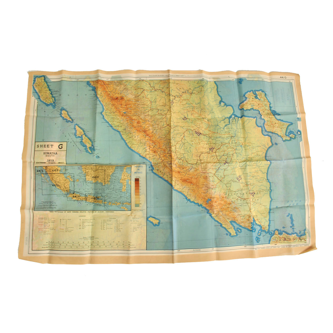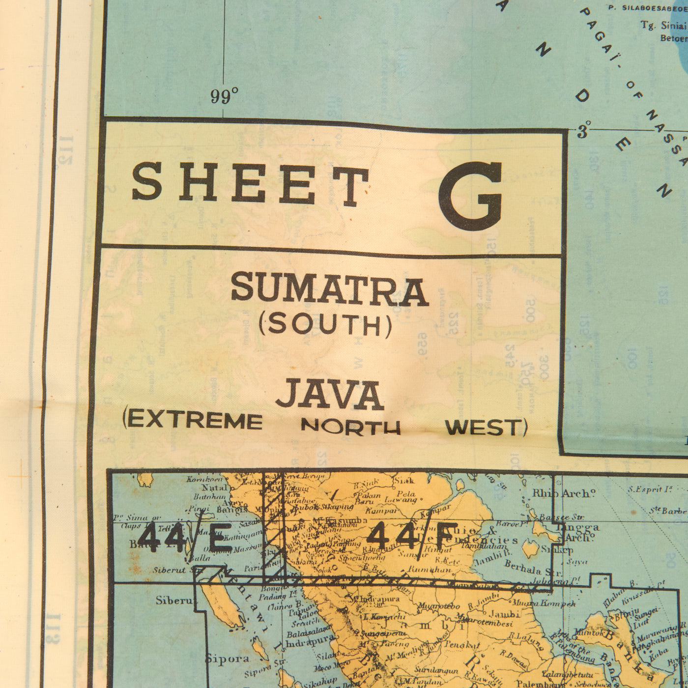 - Southern Sumatra-Northwest Java/Southwest Borneo, South Sumatra, East & West Java: This map was designed to be used alone or in conjunction with other maps to create a large map of the certain area. This map is sheets “G” and “H” and would be conjoined with the map “44/F”. This map is labeled as 44/G and is a scale of 1:1,000,000 and is undated but appears to be WWII manufacture. The map measures 38” x 25” and is in lovely condition with the standard reinforced edges to make joining other maps more accurate.