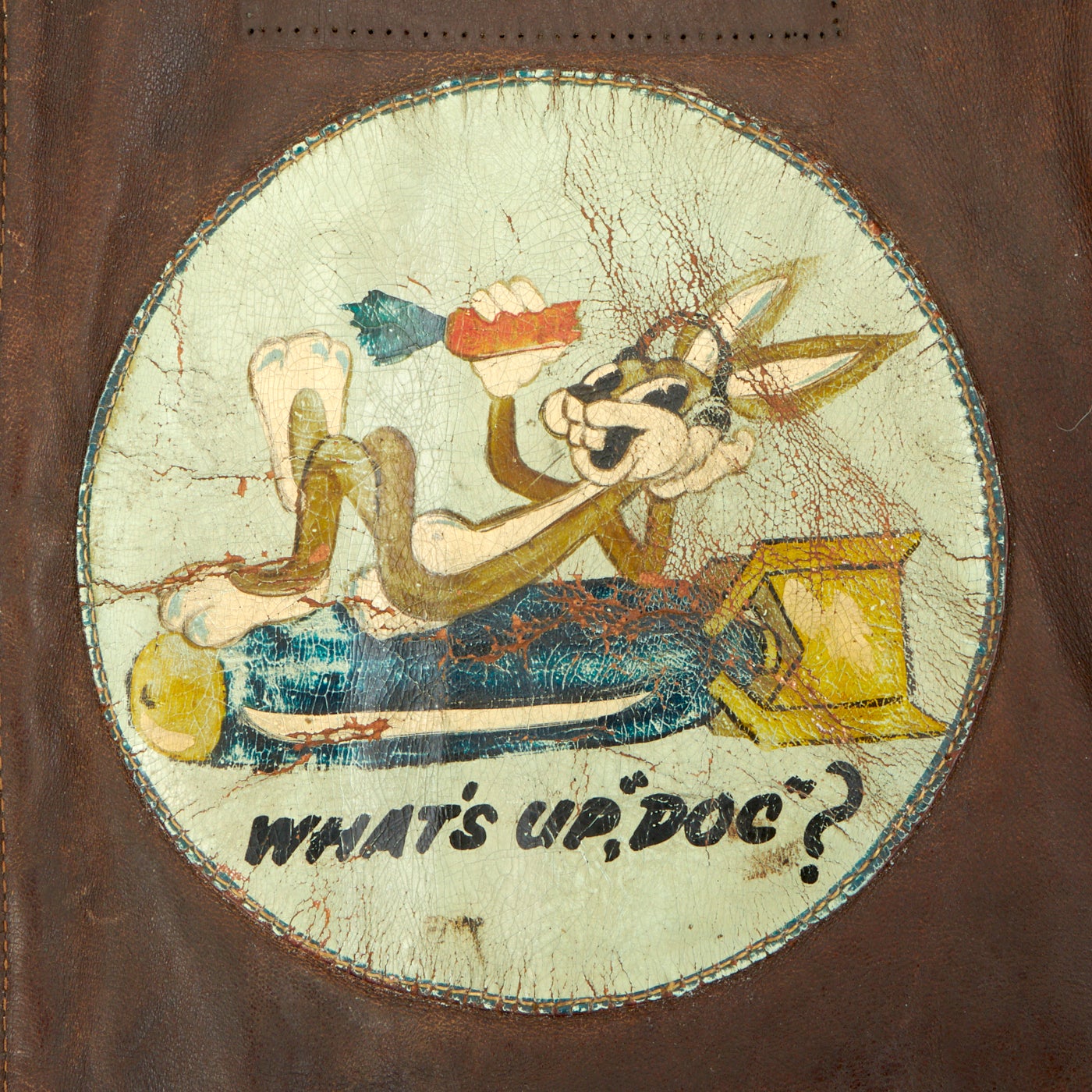 The best aspect of this incredible jacket is a painted leather squadron patch (unidentified) that depicts Bugs Bunny relaxing on what appears to be a 500lb Aerial bomb. There is a color Army Air Force insignia on the left shoulder. The jacket also has a Lieutenant bar on each shoulder. The zipper is non functional, lining appears to be period but was a private purchase or was relined during the period.