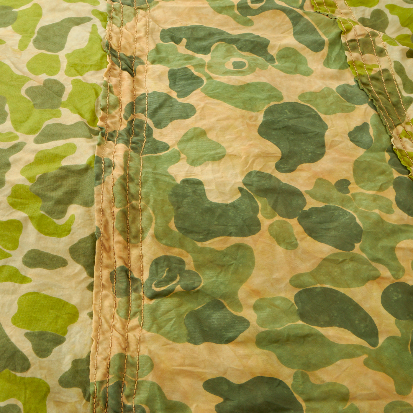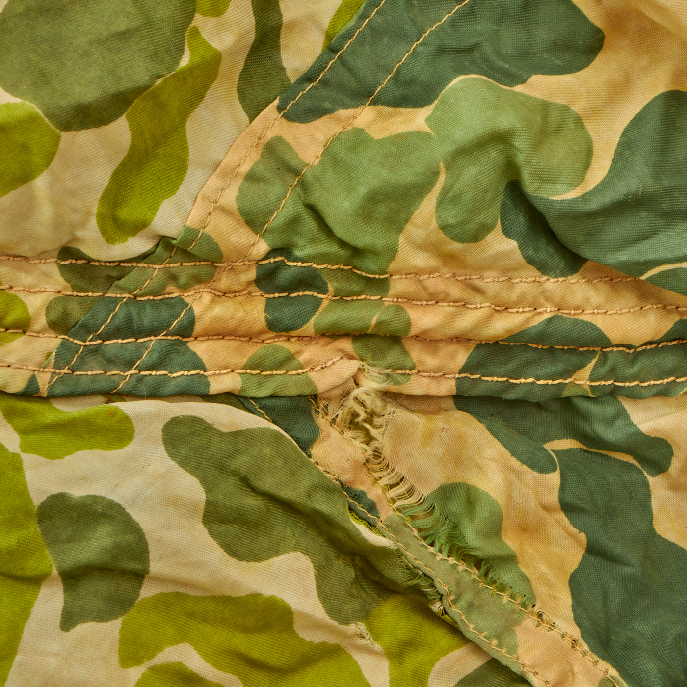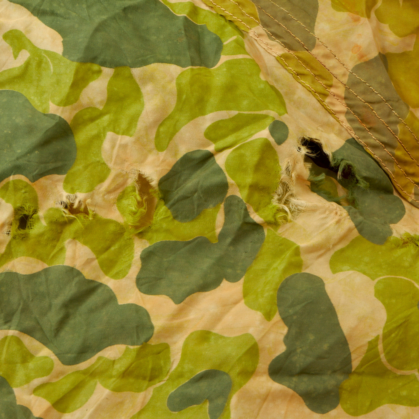 Original Item: Only One Available. Now this is a truly amazing parachute canopy we have to offer here. This 1st Foliage Pattern camouflage T-5 Parachute Canopy was used by a trooper of the 82nd Airborne Division who landed east of Groesbeek and Groesbeek Heights on September 17, 1944. Nearly 50 years after the battle, a Dutch citizen by the name of Joen van der Beek came across a shallow hole and decided to investigate it. After a little bit of digging in the ground, a bit of camouflage was unearthed. Upon further excavations the whole canopy was able to be removed. Turns out the troopers in the area were using their parachute canopies to better conceal themselves while in foxholes and fighting positions. Buried with the canopy was evidence of a brutal firefight. Spent casings, ejected misfires and grenade pins were found beneath the canopy. Unfortunately those items are not with the canopy.
