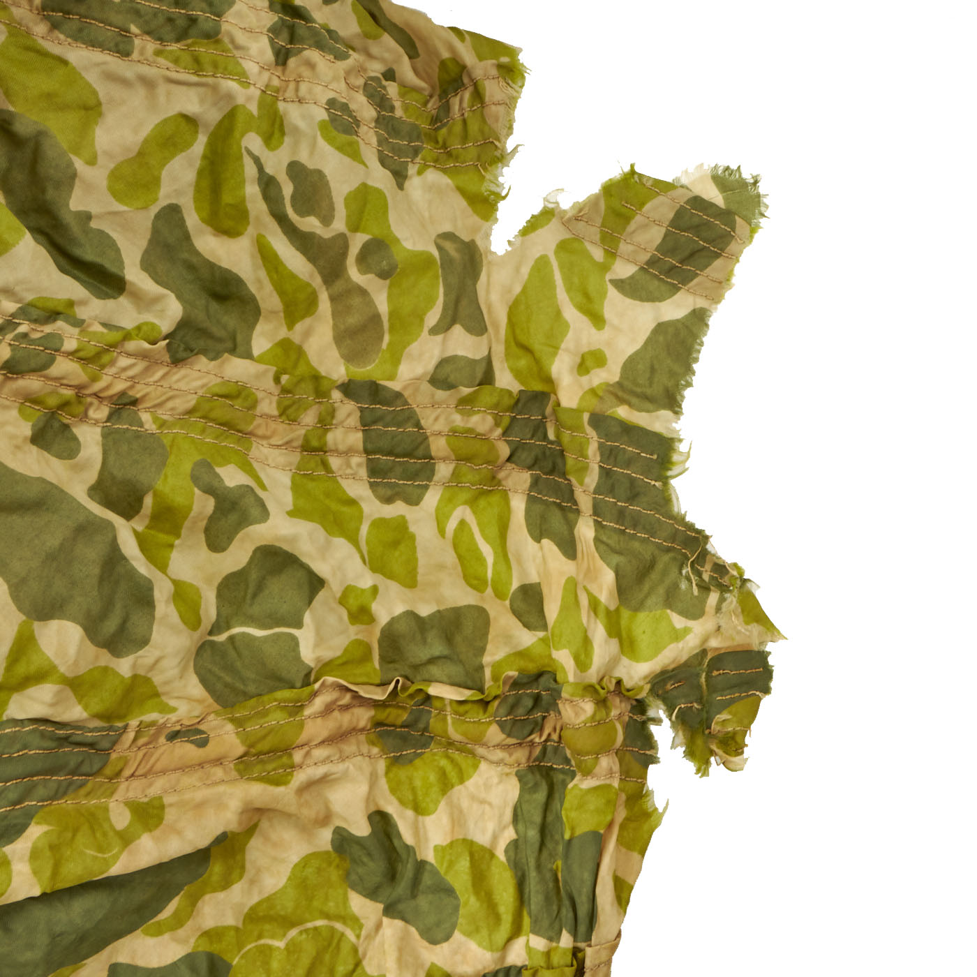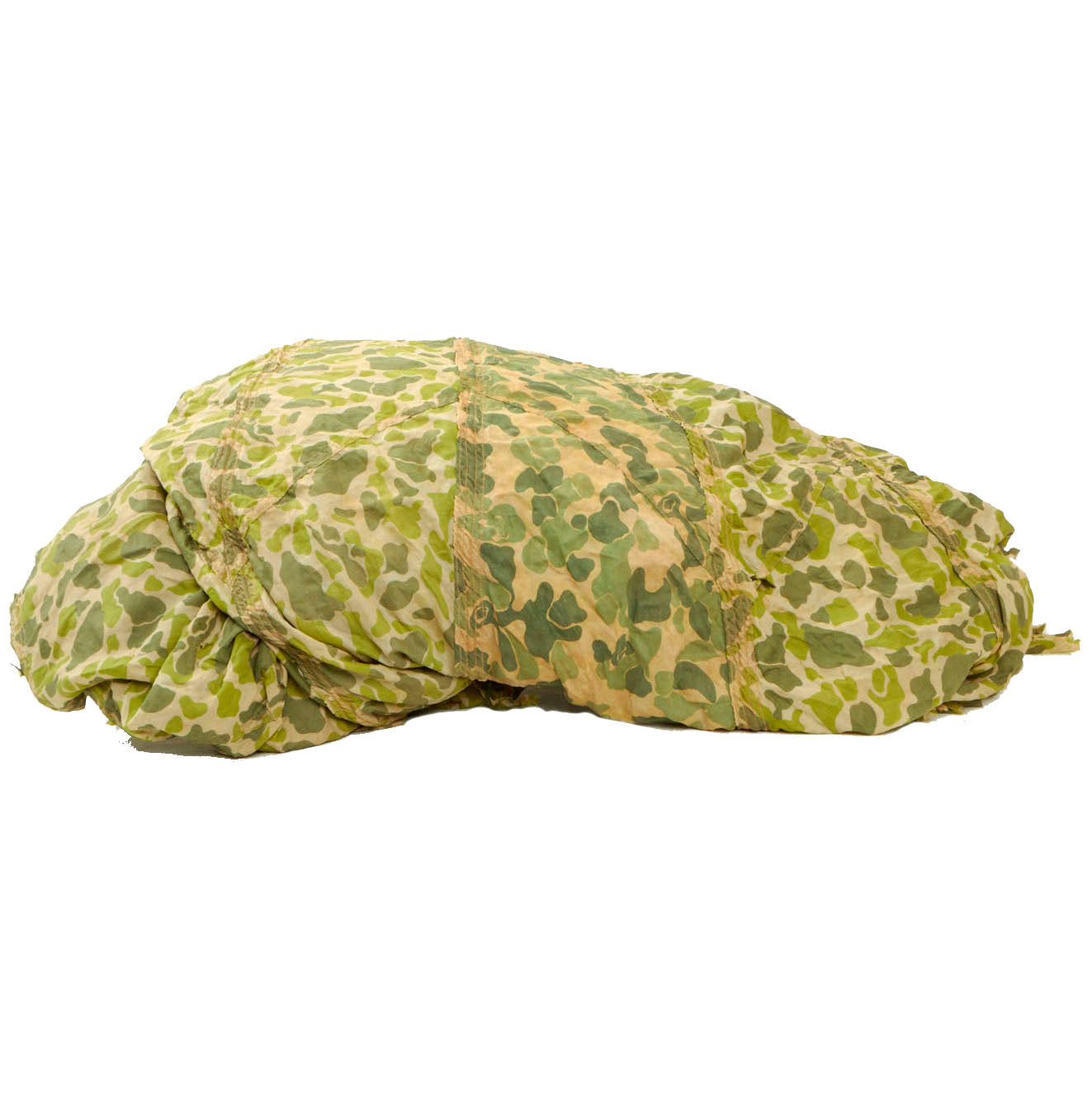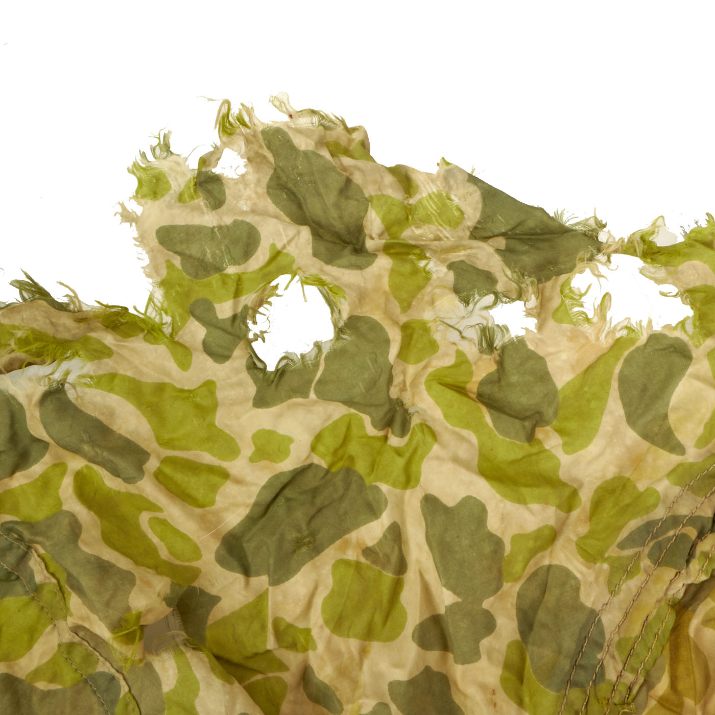 Original Item: Only One Available. Now this is a truly amazing parachute canopy we have to offer here. This 1st Foliage Pattern camouflage T-5 Parachute Canopy was used by a trooper of the 82nd Airborne Division who landed east of Groesbeek and Groesbeek Heights on September 17, 1944. Nearly 50 years after the battle, a Dutch citizen by the name of Joen van der Beek came across a shallow hole and decided to investigate it. After a little bit of digging in the ground, a bit of camouflage was unearthed. Upon further excavations the whole canopy was able to be removed. Turns out the troopers in the area were using their parachute canopies to better conceal themselves while in foxholes and fighting positions. Buried with the canopy was evidence of a brutal firefight. Spent casings, ejected misfires and grenade pins were found beneath the canopy. Unfortunately those items are not with the canopy.