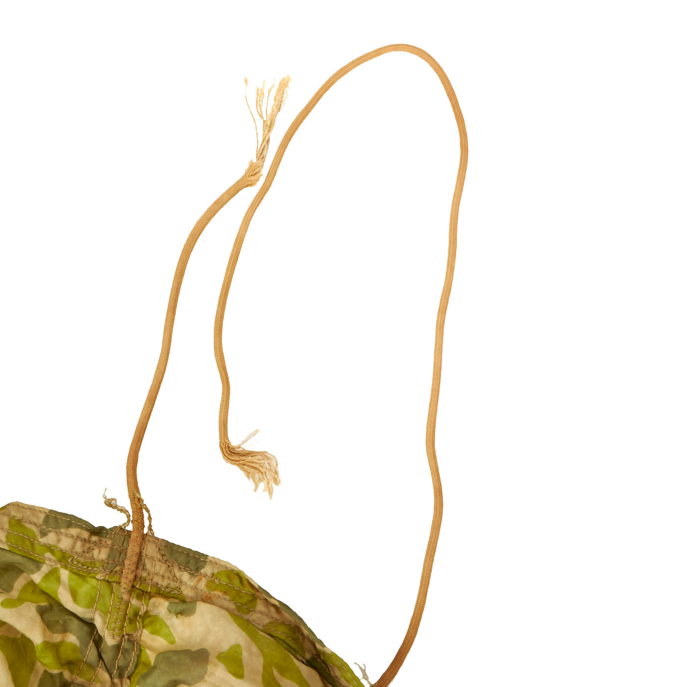 This example of the T-5 Parachute is not white and appears to be the 1st Foliage Pattern camouflage used. The foliage pattern was composed of dark green and olive colored shapes arrayed on a khaki backdrop. The short-lived original pattern was composed of irregular shapes in a pattern repeating approximately every 18 inches along the length of the material. In late 1943, a simplified pattern based on the standard five-color camouflage printed Army/Marine HBT pattern was adopted. The brown splotches were switched to dark green, and the light brown, olive, and green splotches were all combined into a mid-olive green shade.