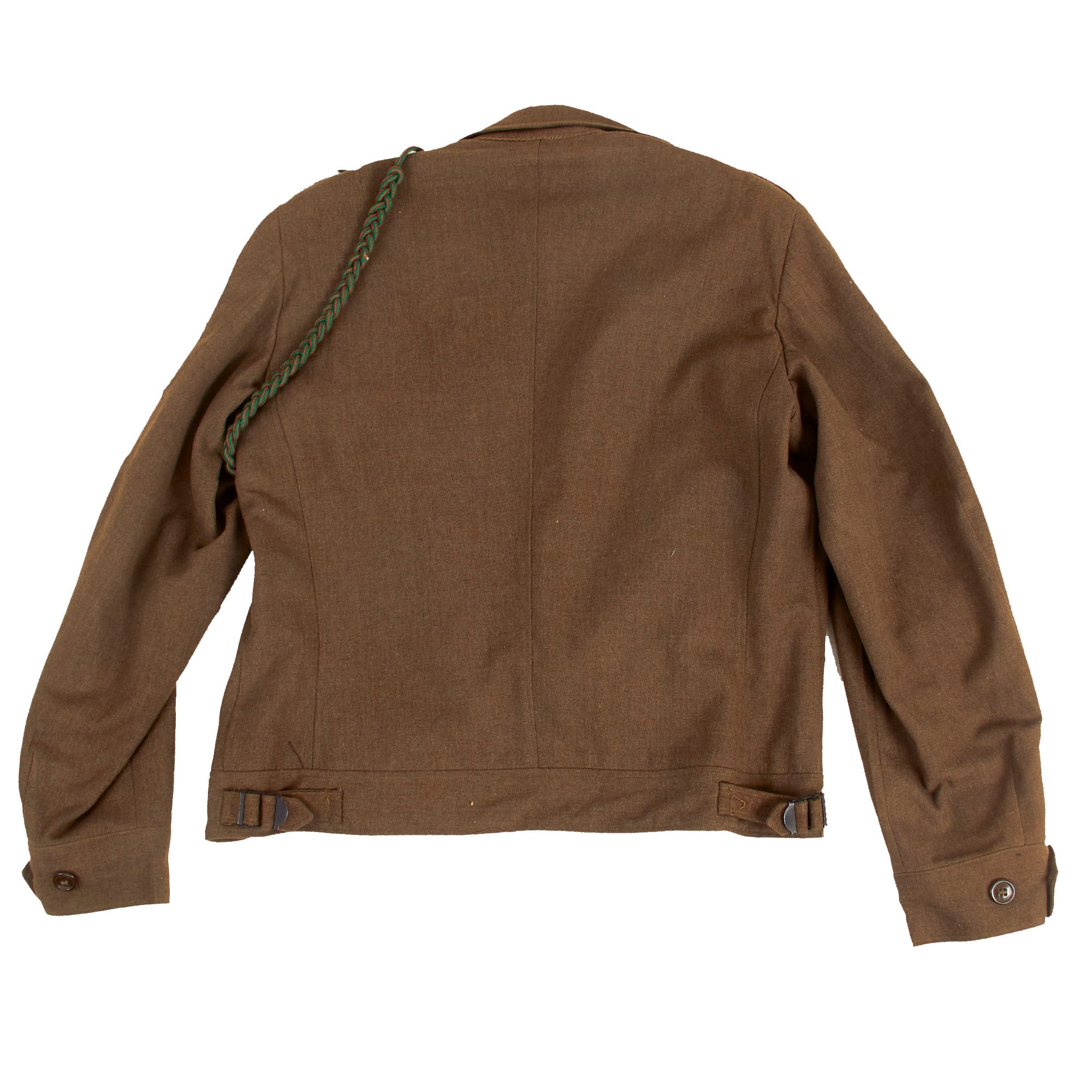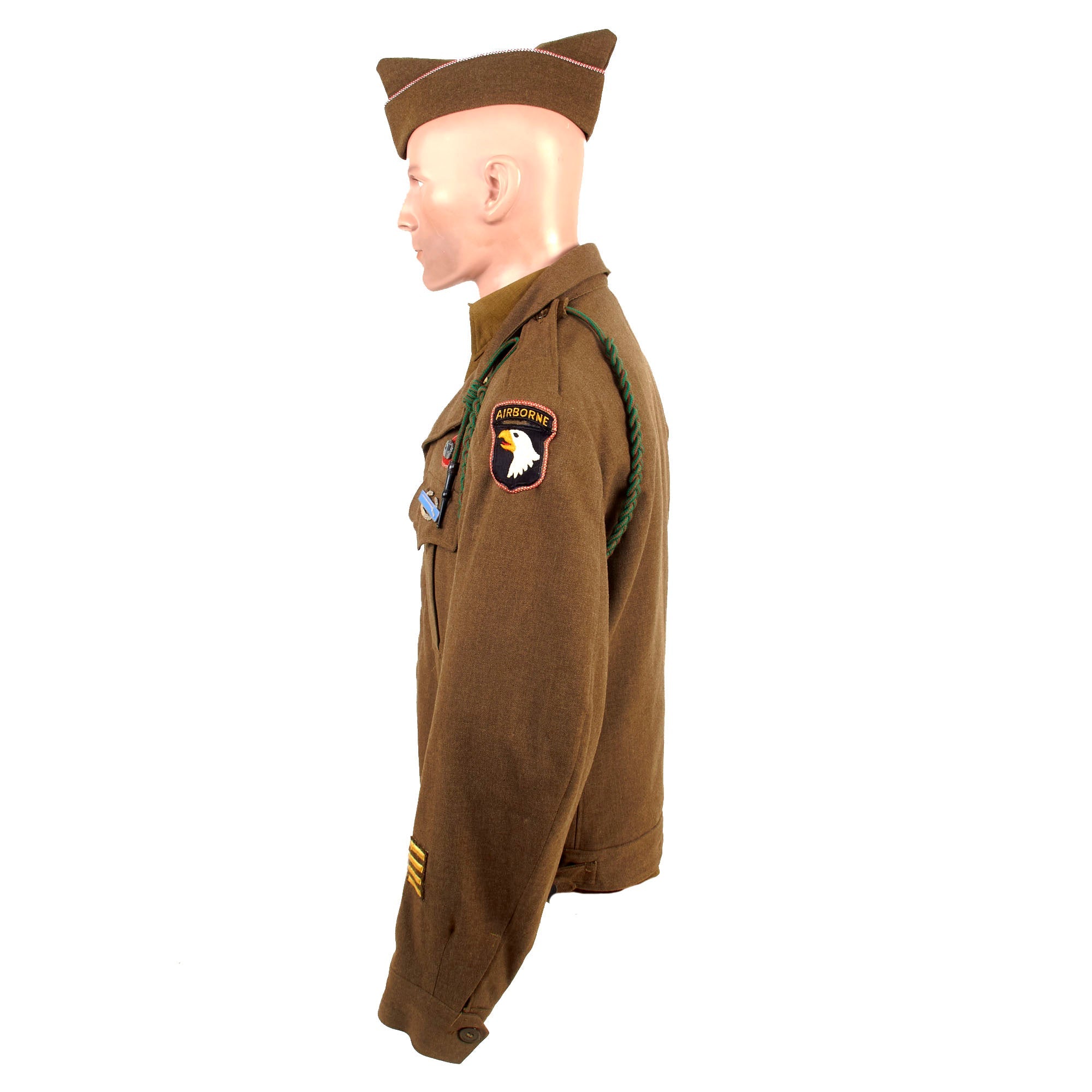 The Ike jacket is in near pristine, well cared for condition. The size is a 38 Large and features a lovely “Screaming Eagle” Old Abe patch with Airborne rocker on the left sleeve. There is a beautiful addition to the patch as it was bordered with section of Scarlet Rid/White piping, most likely taken from an extra overseas cap. Old Abe, a bald eagle, was the mascot of the 8th Wisconsin Volunteer Infantry Regiment in the American Civil War. Later, his image was adopted as the eagle appearing on a globe in Case Corporation's logo and as the screaming eagle on the insignia of the U.S. Army's 101st Airborne Division.
