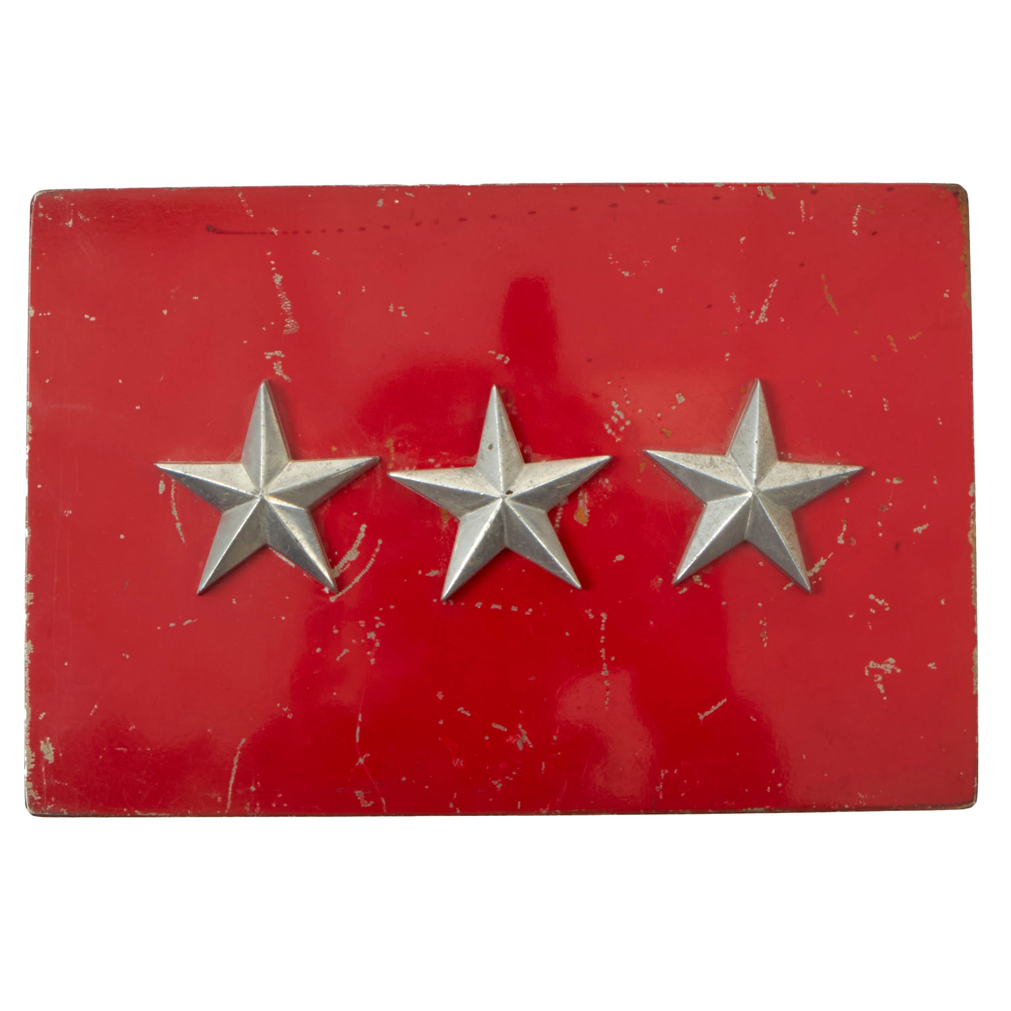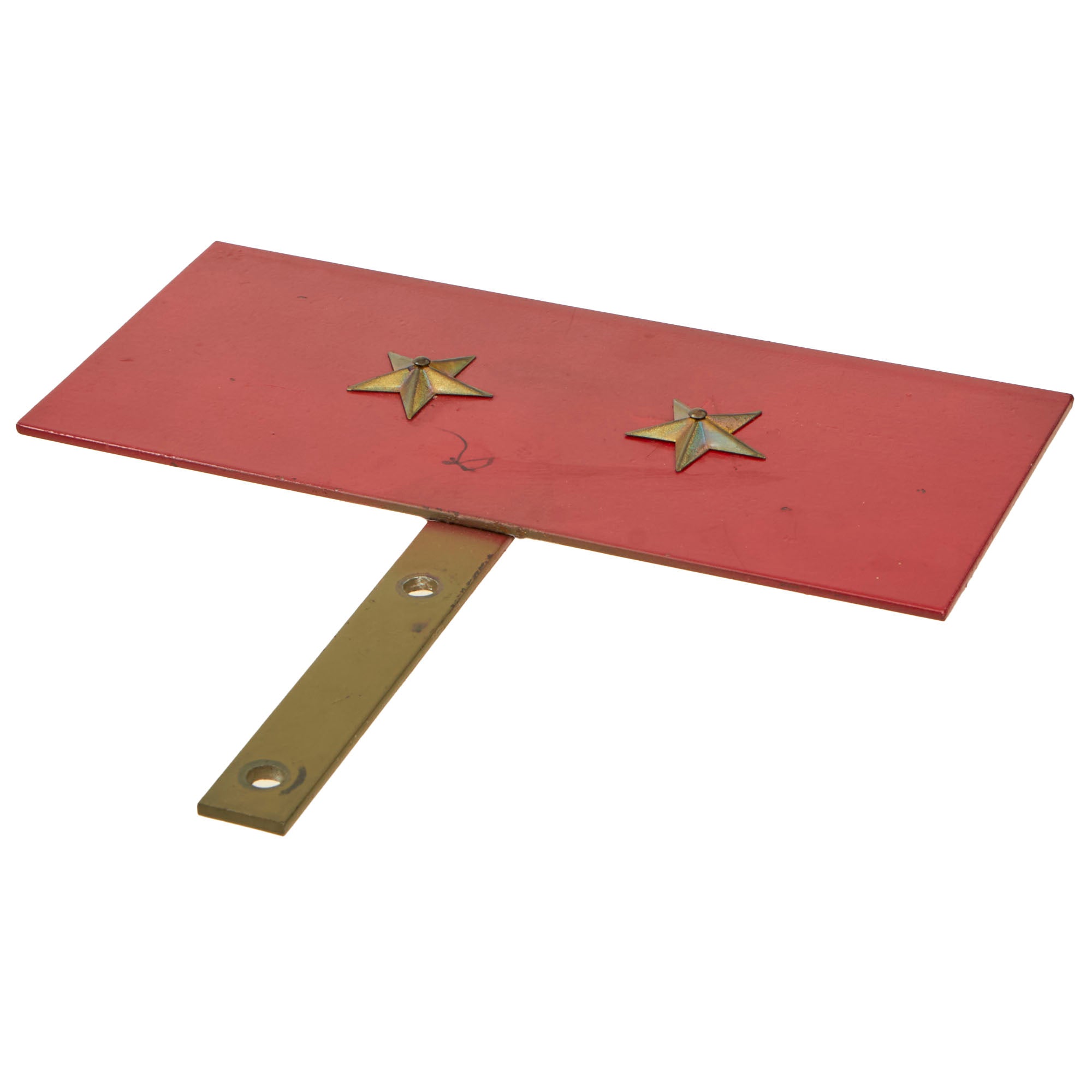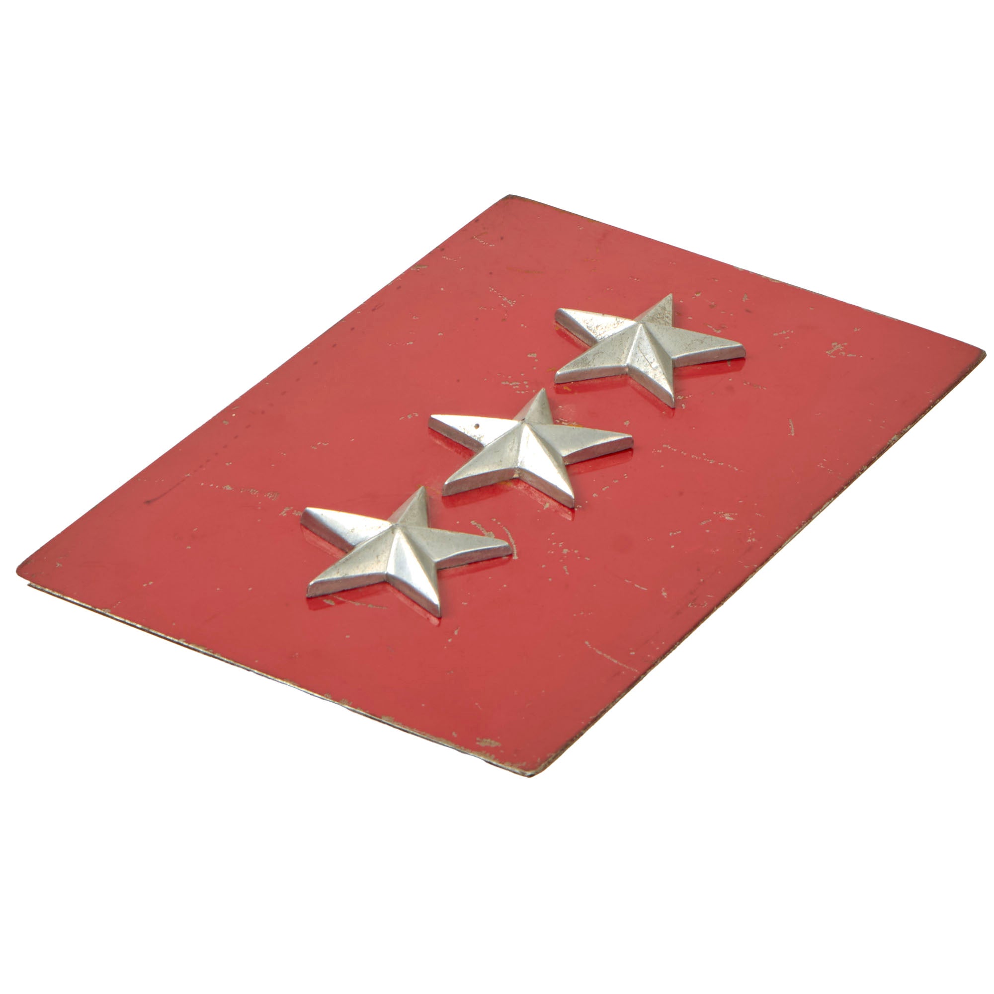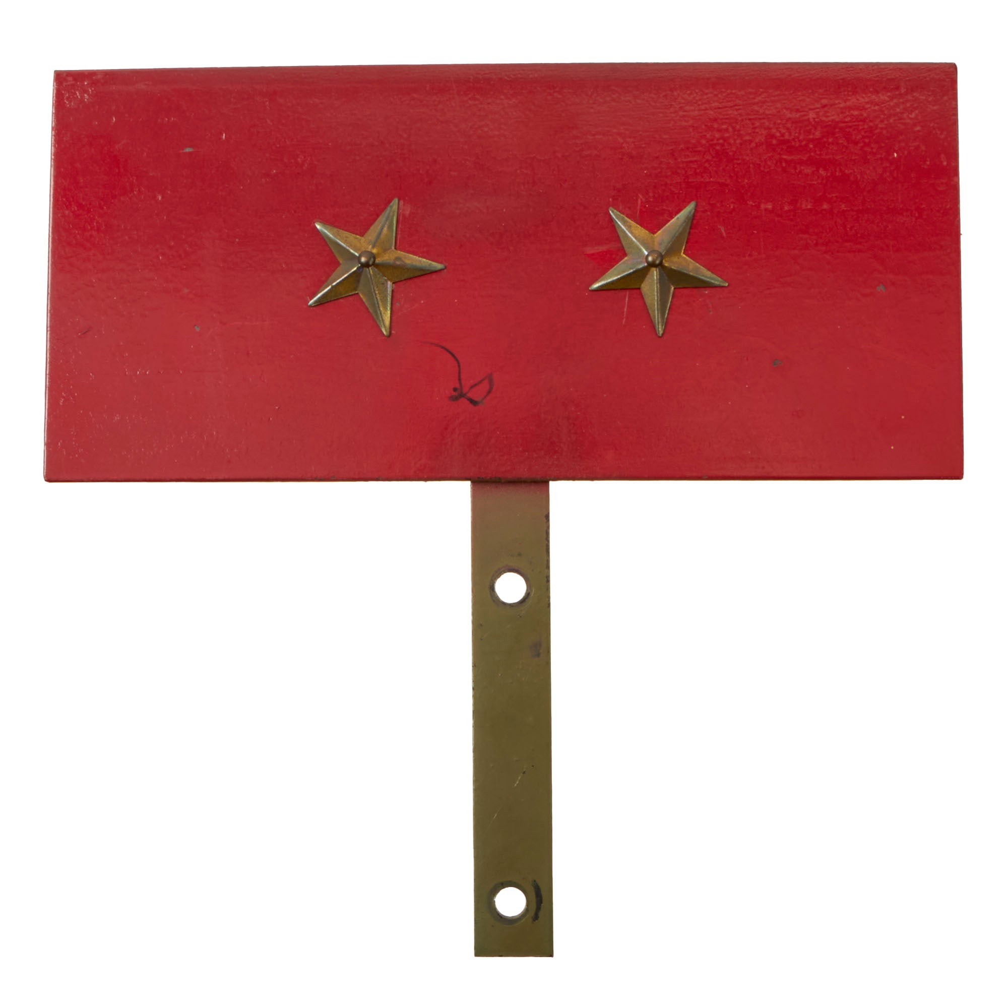 Original Item: Only one set available. This is a set of four Military vehicle identification fender plates that were issued during WWII. The set includes a 2-star plate on a metal rod for a Major General, and a 3-star plate for a Lieutenant General. The plates are painted red with the stars affixed/screwed into them.