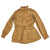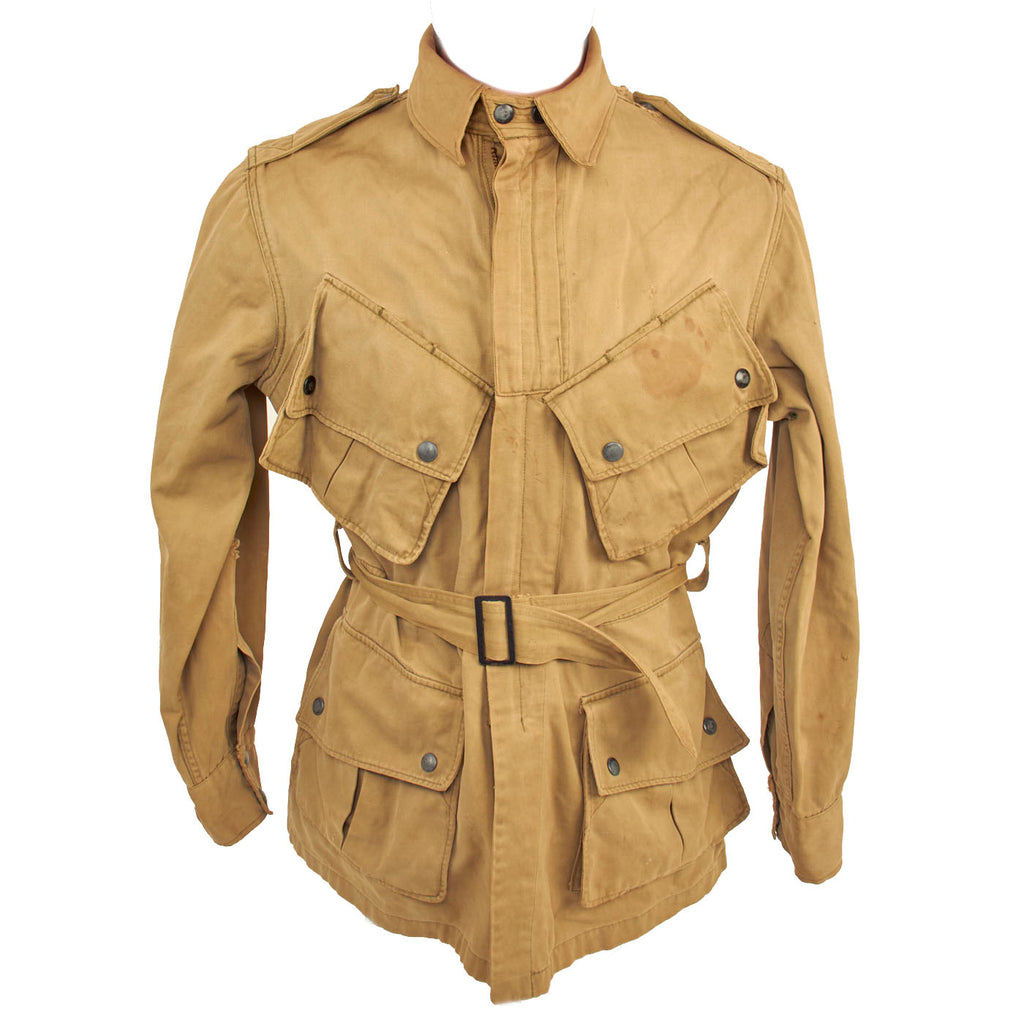 The jacket was tailored in cotton poplin with sharply tailored sides and normally had four cargo pockets that had flaps which could be snapped open or closed. The breast pockets were at a slight angle. This was to allow access to the pockets when a trooper was wearing their field equipment. A 1-3/4 wide belt was fixed at the center of the back and passed through a loop on either side at the waist. The jacket was made to provide a certain amount of water resistance and wind proofing. The color was normally olive drab although this tended to fade after several washings. The trousers were made of the same material and had loops for a belt to be worn around the waist. It had four pockets (two on the front two on the back) as well as two large expandable cargo pockets sealed with a flap on the outside of each thigh.