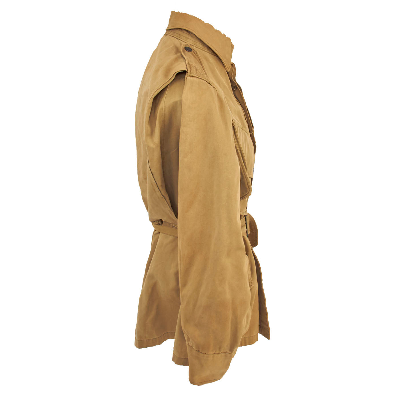 The jacket is in worn original condition, with the expected stains and small pulls and tears you would associate with service. All snaps are present and in working order. There are tears on the shoulders. The jacket is not marked with a size or soldier information.