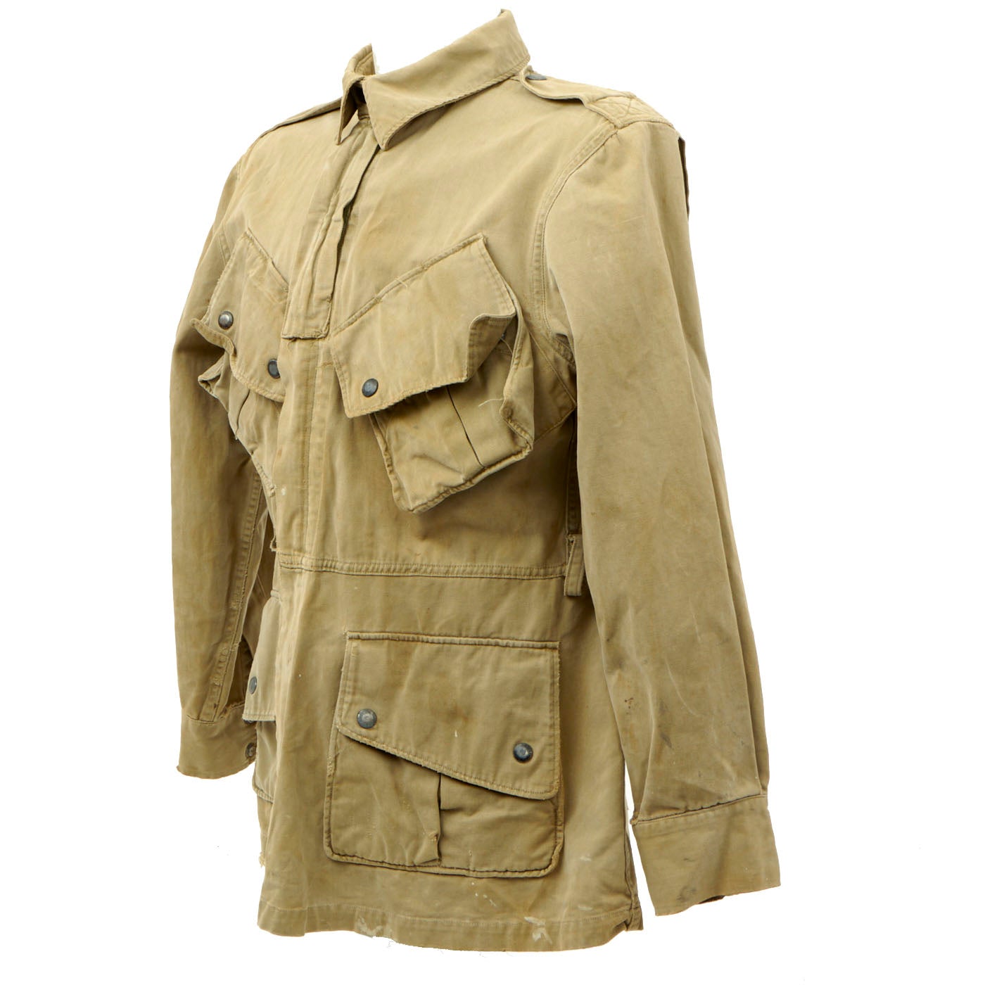 Original Item: Only One Available. This Original M1942 Airborne Jump Jacket in Olive Drab #3 offered is in heavily used and worn condition. The coat consists of four front patch pockets with two button snaps on each top flap, with 2 rows on the pockets, to secure different sized items. The jacket also has a unique dual-zippered knife pocket located on the upper lapel which was designed to contain a switchblade pocketknife, used to cut the parachute rigging if entangled. The top two pockets were also angled inward to make items easier to retrieve with the opposite hand. This example does not have any flag or unit patches, however it does not appear that they were removed, so they simply may have never been sewn on.