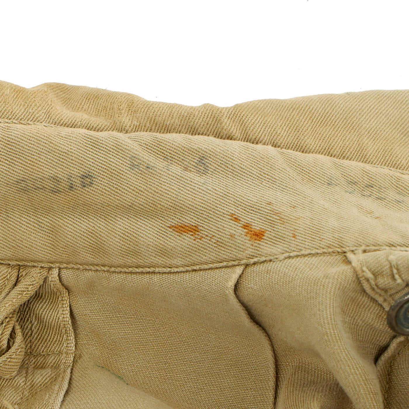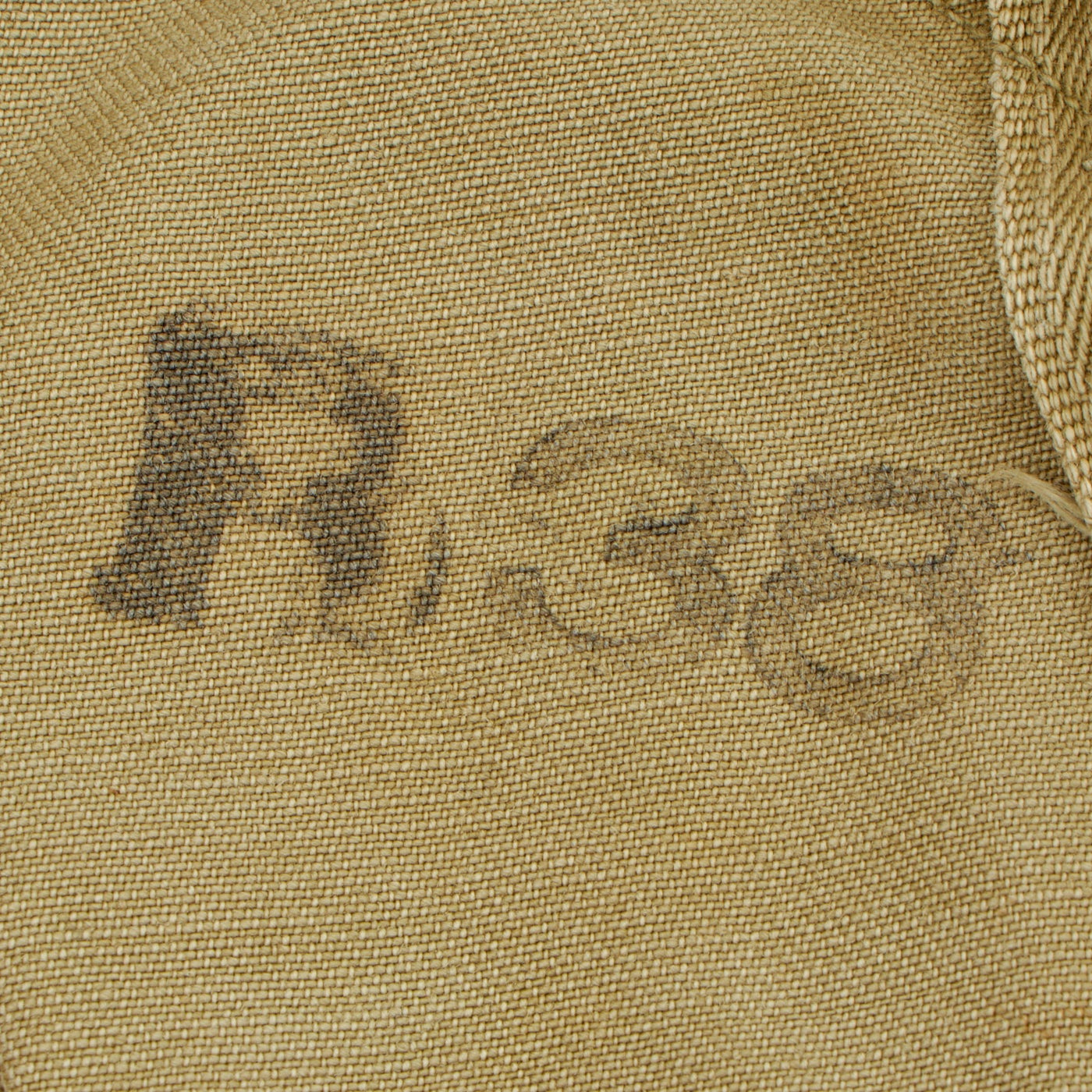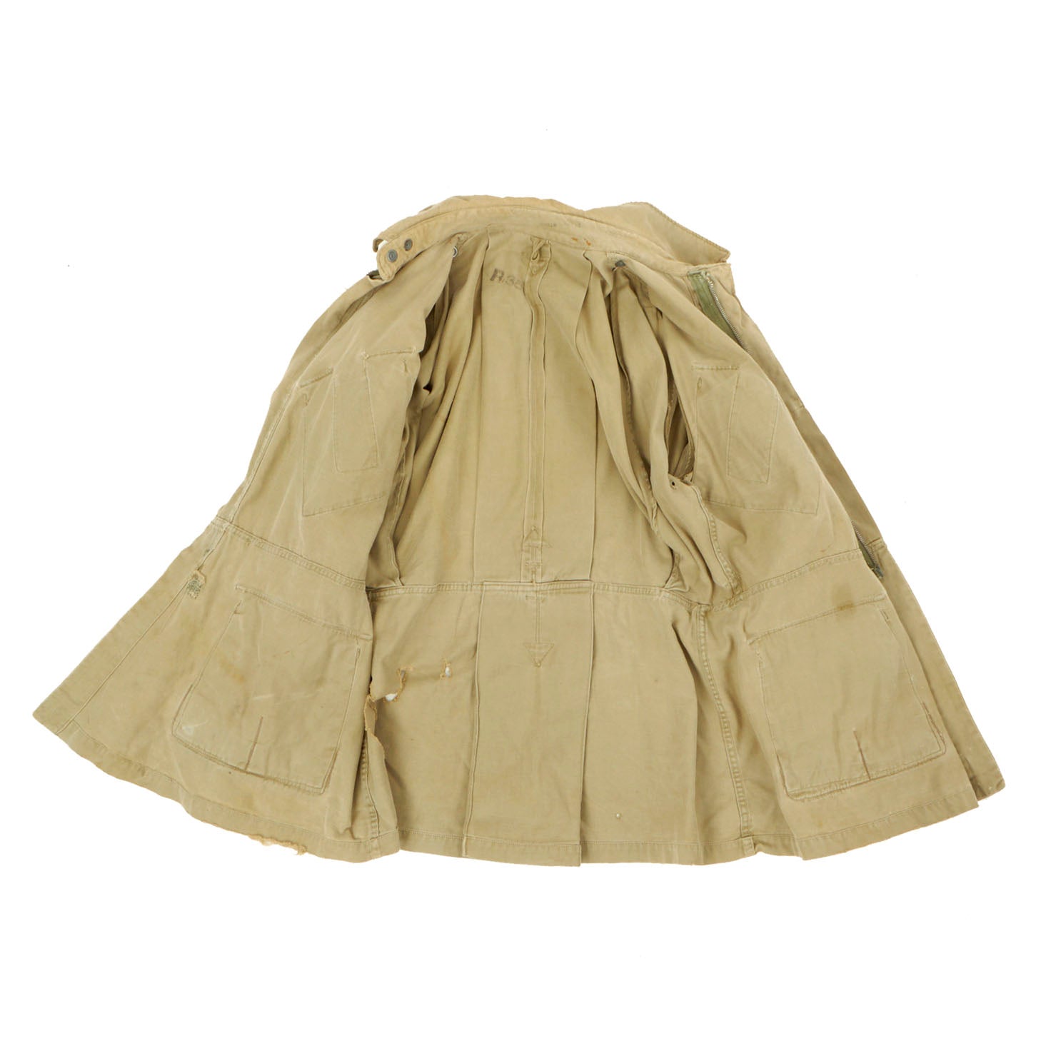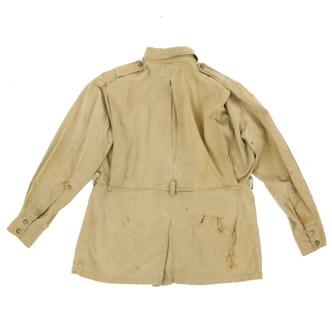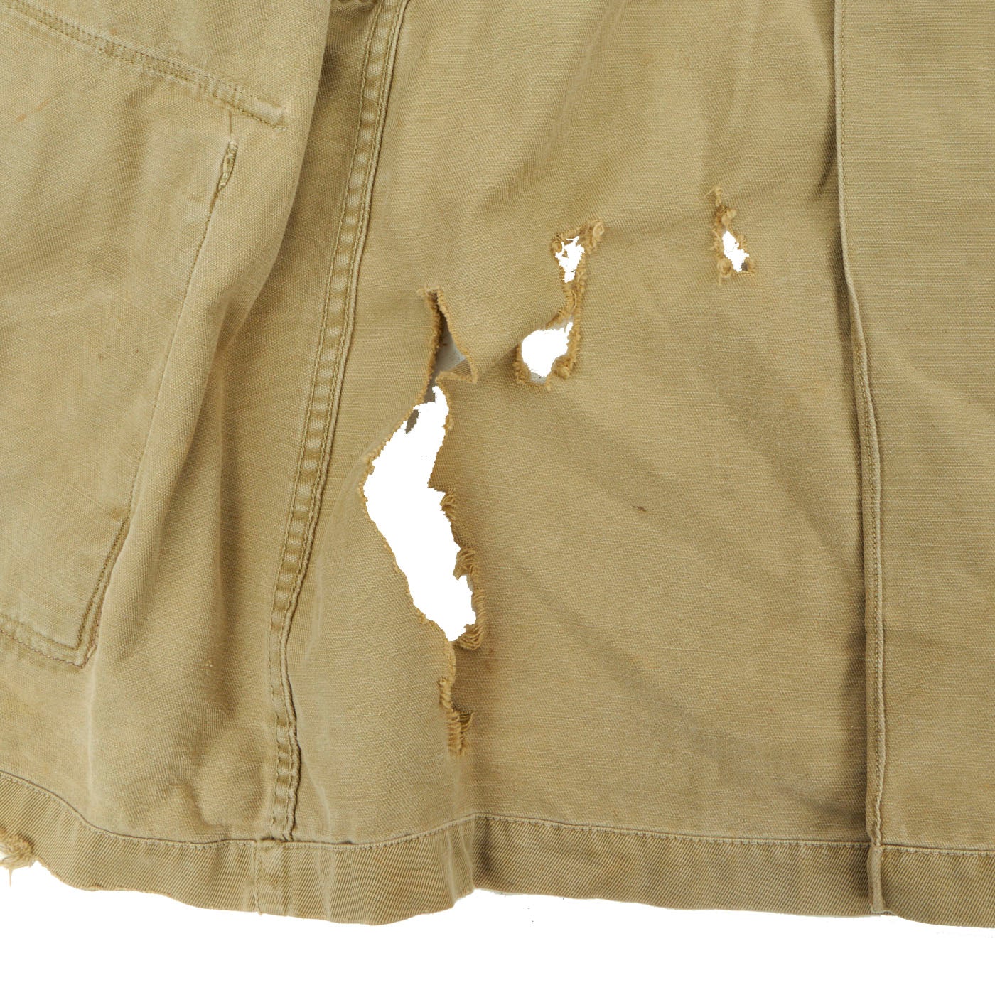 The jacket is in worn original condition, with the expected stains and small pulls and tears you would associate with service. All snaps are present and in working order. The knife pocket zipper is functional, while the main zipper is a period replacement and is broken. There are two large tears on the right back shirt of the jacket as well. The jacket is marked with an illegible soldier’s laundry number, which is the last four digits of the soldier's Army Serial Number along with the first letter of his last name. It is also marked with size “R38” directly in the back interior, indicating that is is a size 38 jacket. The original belt is not present, most likely it was removed at the time, which was common as they were not popular with the men who wore them.