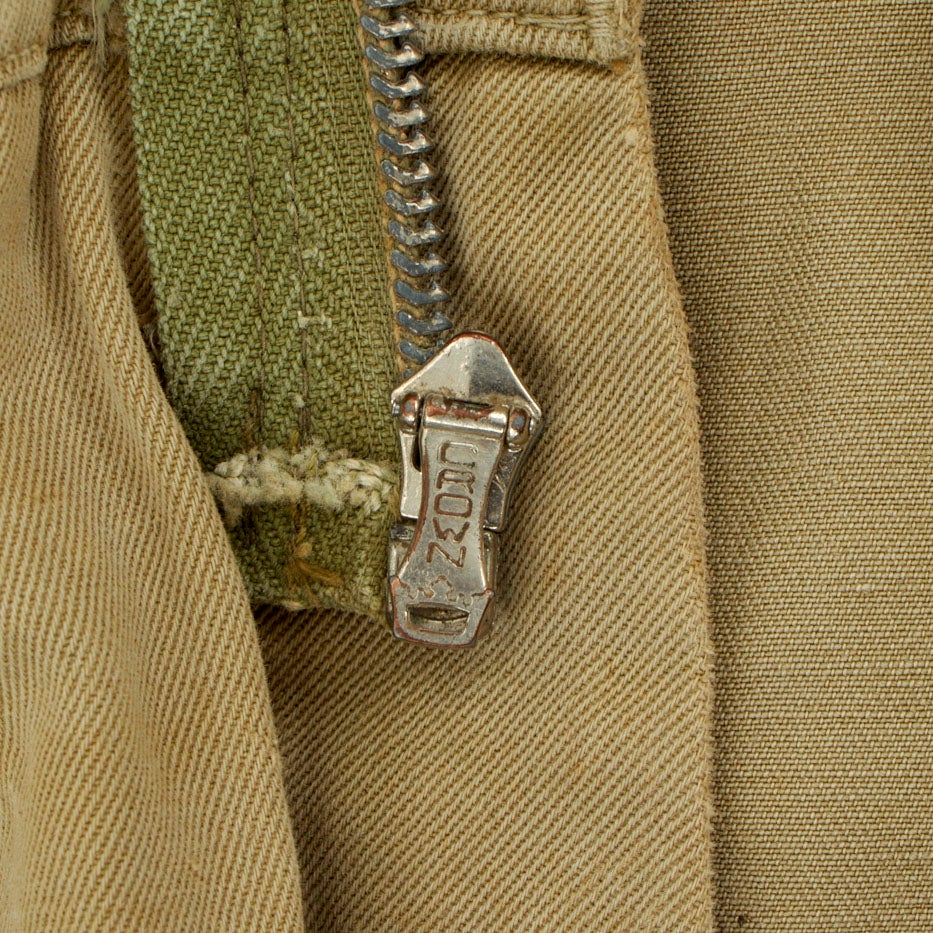 Due to the somewhat fragile nature of the uniform, the M1942 pattern was often reinforced with thicker, tougher canvas on the elbows, crotch and knees. However, this example was never reinforced, indicating early issue. The M42 was worn by Paratroops assigned to Airborne units. The M42 was eventually phased out in favor of the M1943 Uniform which was a darker green, OD #7. Despite this, various individuals chose to keep their M42s in order to show their veteran status.