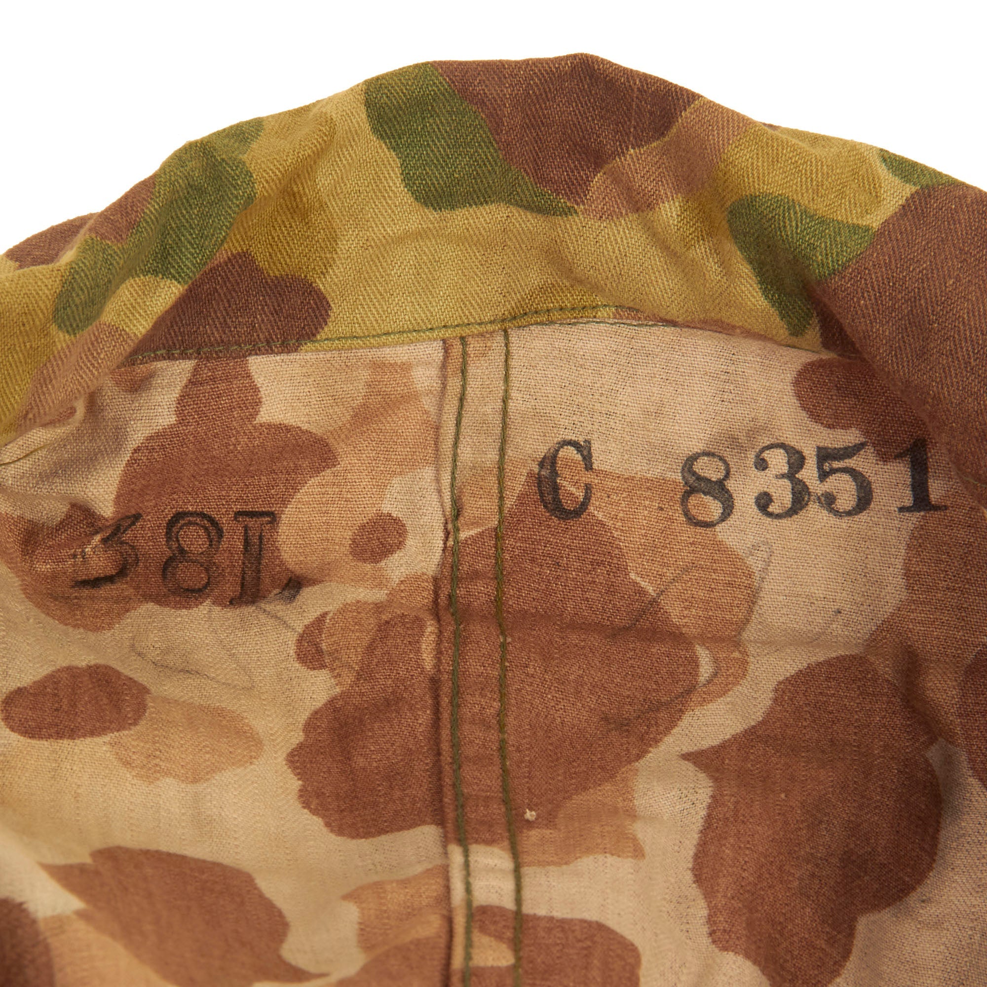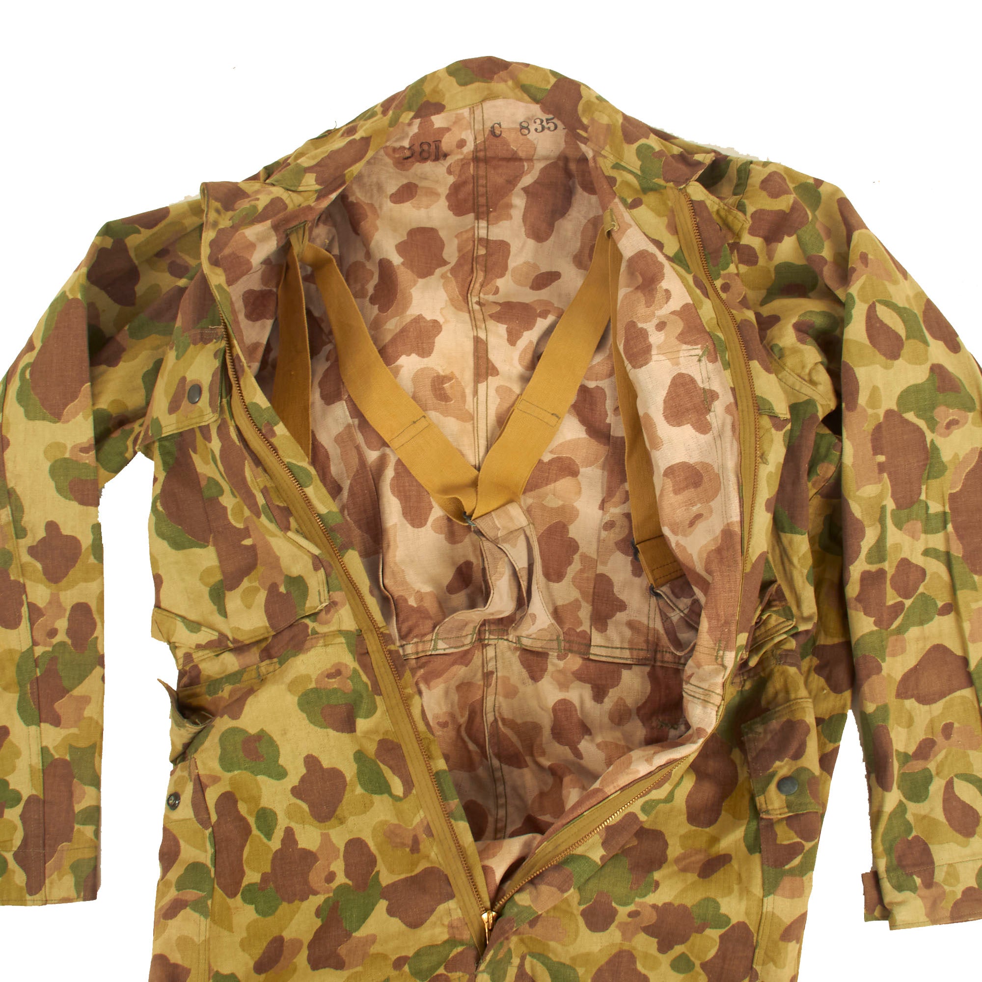 Original Item: Only One Available. This is a United States Army produced size 38L Camouflage HBT Coverall Fatigue Uniform set in “Frogskin” pattern camouflage. This reversible one piece coverall was designed for combat in jungle/tropical conditions. It features 13 star metal buttons on the cuffs and large cargo pockets flaps which are held down by stout brass friction snaps. While developed by the Army, these coveralls are best known for use by the Marines in the Pacific Theater during WW2.